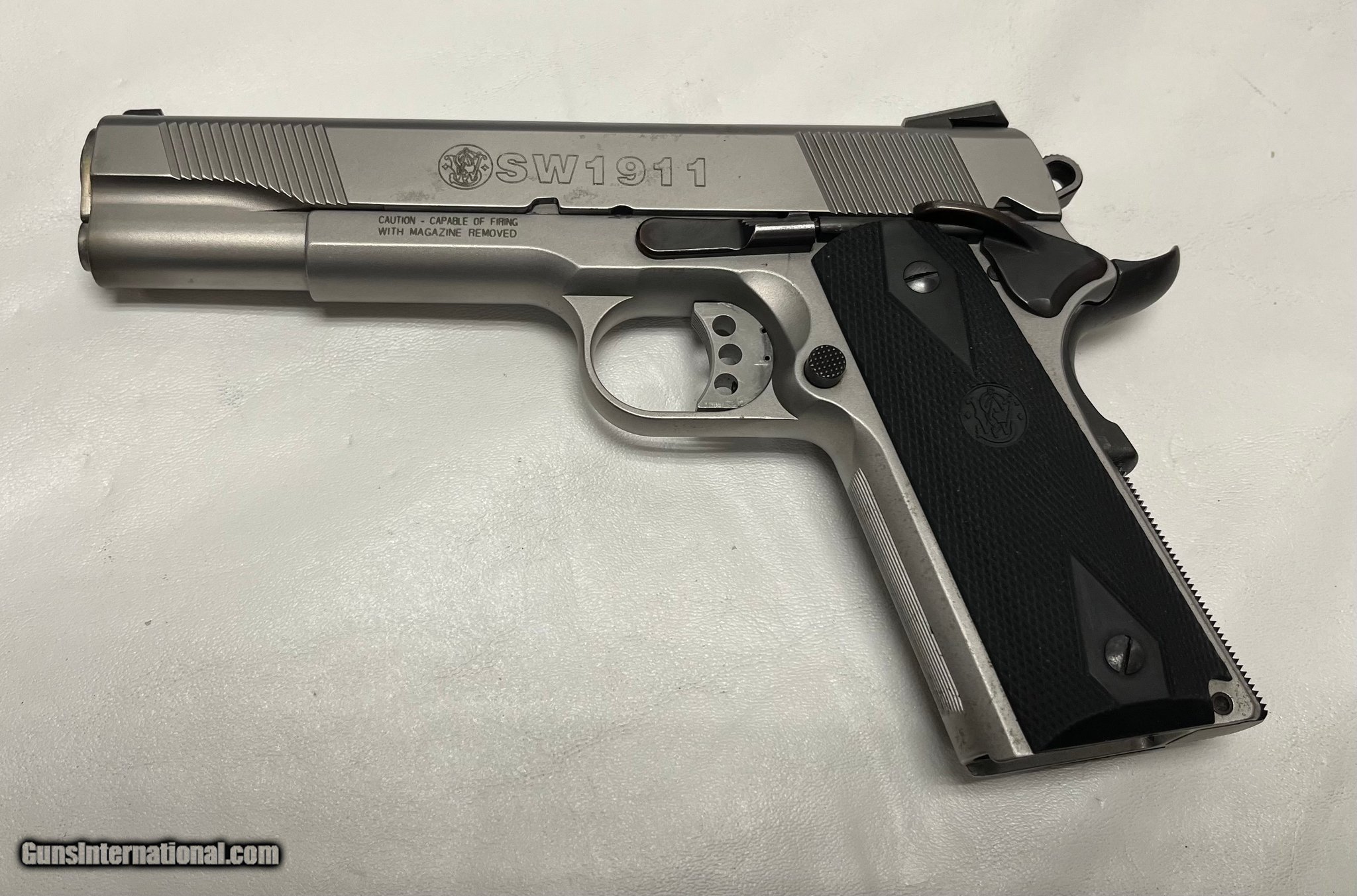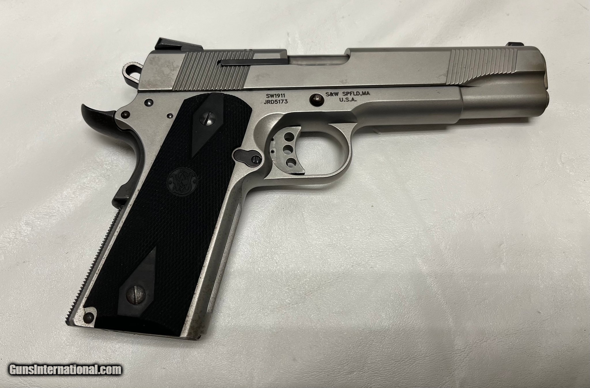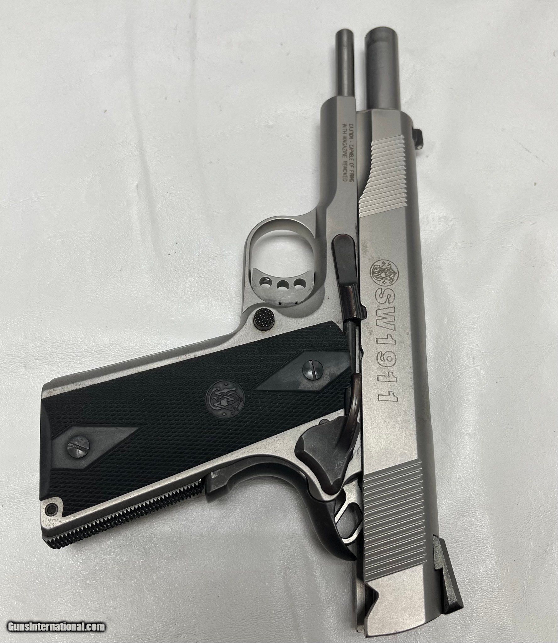Description: Guns Listing ID: 575750 Smith & Wesson 1911 — .45 ACP (used). Full-size single-action 1911 platform with a steel frame and slide, typically fitted with a ~5.0\" match-grade barrel (varies by exact model), beavertail grip safety, extended thumb safety, and a single-stack magazine (usually 7–8 rounds). Features include dovetailed low-profile sights, checkered or G10 grip panels, front/rear slide serrations, and a parkerized, blued, or stainless finish depending on the variant. This used example shows normal handling wear consistent with service/range use but remains a classic 1911 in feel and function—accurate, ergonomic, and easily customized. Manufacturer: SMITH & WESSON Model: SW1911 Caliber Info: .45 ACP Condition: Used - Non-Certified Barrels: 5" BARREL Action: SEMI AUTOMATIC Finish: black & stainless Price: $600.99 Contact Seller |