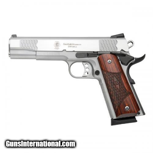 Description: Brand New in the Box, Ready to Ship. Buy It Now!! Precision. Accuracy. Performance. With a remarkable selection of SW1911's, Smith & Wesson continues its tradition of innovation and its commitment to bringing shooters the finest quality high performance firearms. Smith & Wesson's variations of John Moses Browning's extremely popular 1911 design can be seen in the production, Pro Series, Champion Series and Performance Center line of SW1911 pistols. These 1911's are manufactured with a wide variety of materials, finishes and unique features and are favorites in any collection. ALL BACKED BY SMITH & WESSON'S LIFETIME SERVICE POLICY! Caliber: .45 ACP Capacity: 8+1 Rounds Action: Single Action Only Barrel Length: 5" Front Sight: White Rear Sight: White 2- Overall Length: 8.7" Weight: 39.8 oz. Grip: Wooden Laminate E-Series Frame Material: Stainless Steel Slide Material: Stainless Steel Finish: Satin Stainless KNOW YOUR LOCAL AND STATE LAWS!! ORDERS WILL ONLY BE ACCEPTED FROM US RESIDENTS OF THE LOWER 48 STATES, ALASKA AND HAWAII. OUR FFL CLASS DOES NOT ALLOW FOR THE EXPORT OF FIREARMS, THEREFORE WE CANNOT SHIP OUT OF THE US. IF YOU ARE INTERESTED IN PURCHASING THIS ITEM, PLEASE COMPLETE YOUR ORDER BY REFERRING TO THE "SELLER'S INFORMATION" ABOVE. SOLD |