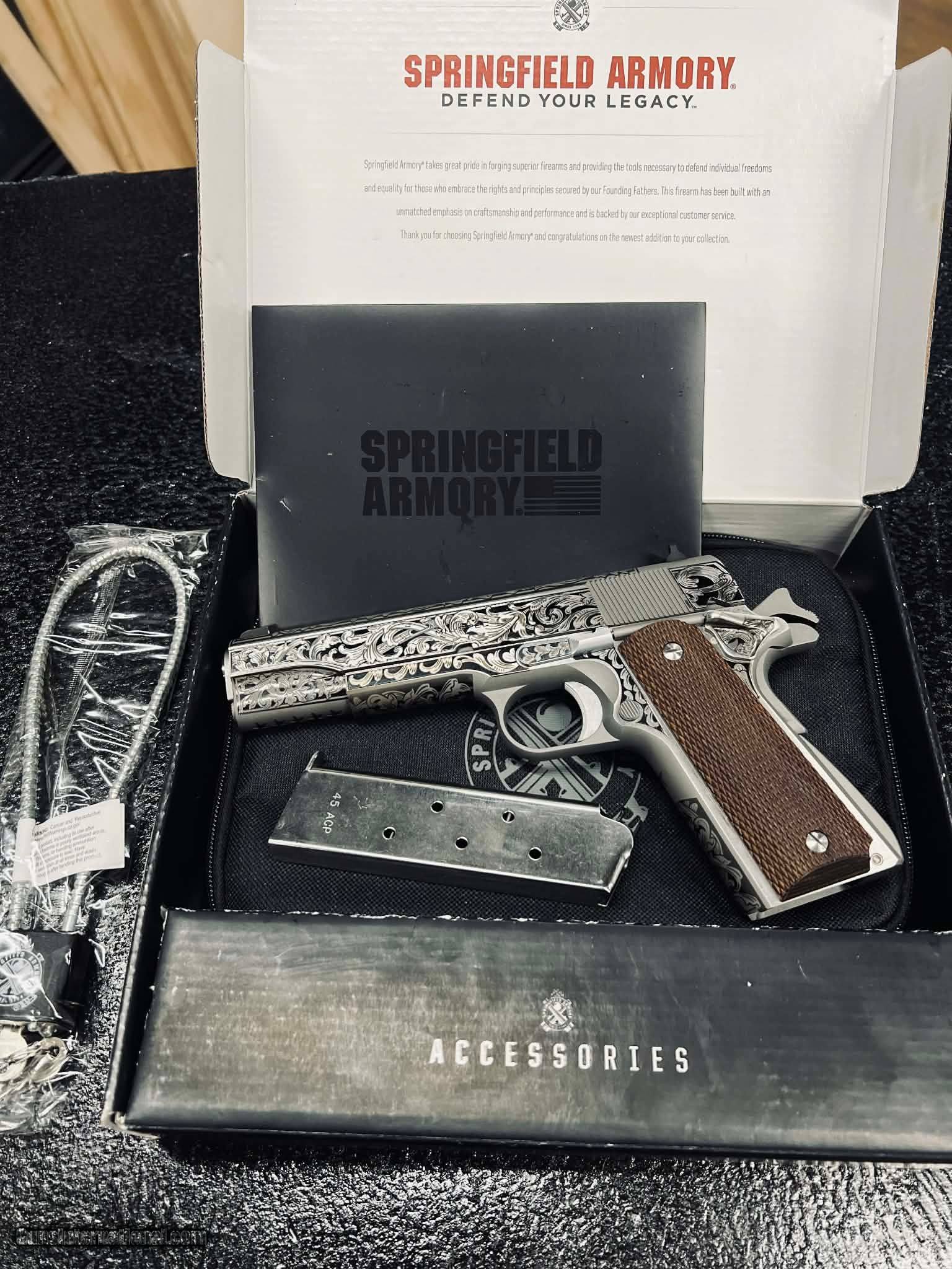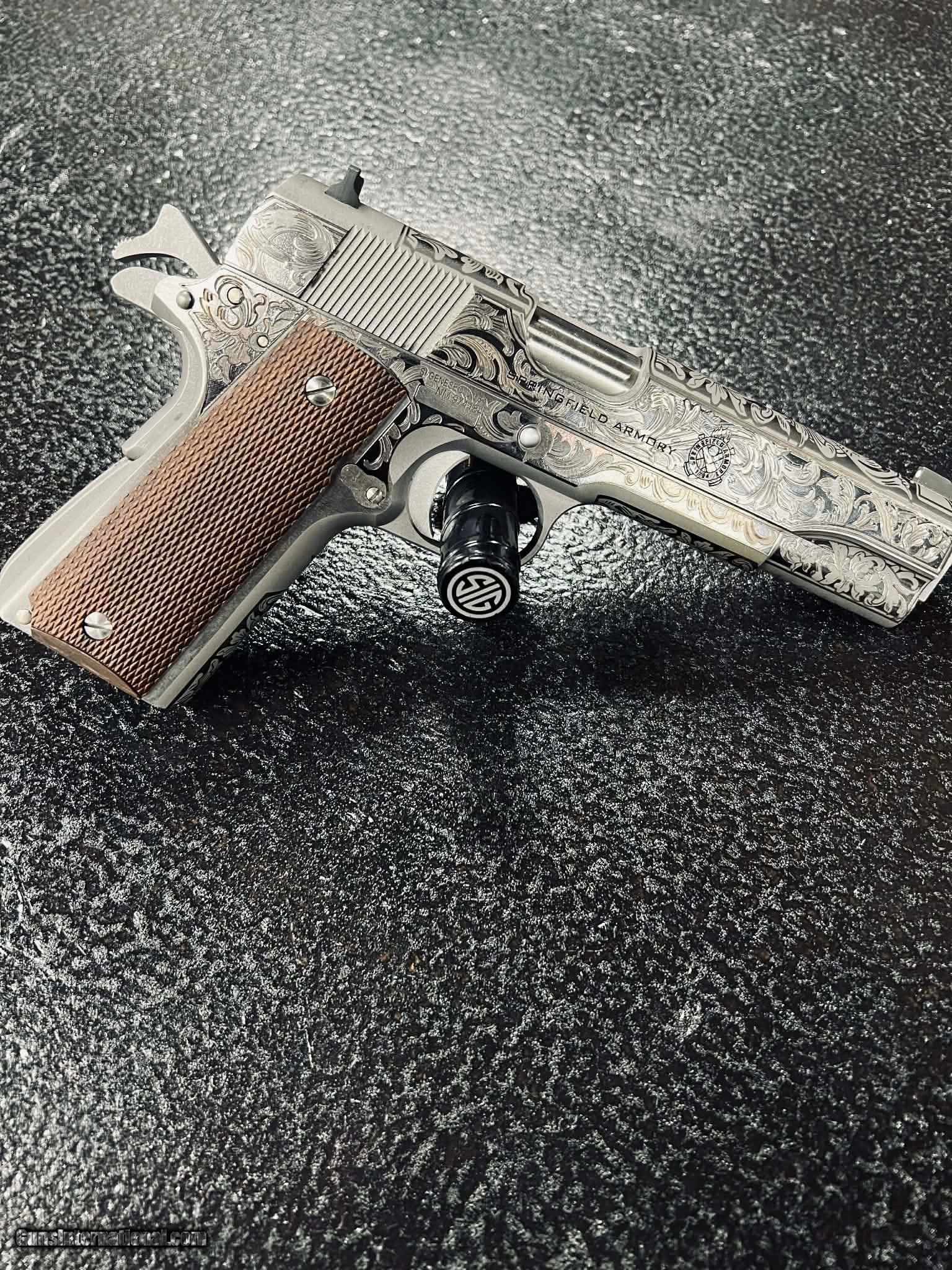 Description: Guns Listing ID: 597794 Springfield Armory Mil-Spec 1911 .45 ACP — Custom Engraved by Damage Factory. Up for grabs is a Springfield Armory Mil-Spec 1911 in .45 ACP, upgraded from classic American steel into a one-of-a-kind, custom-engraved masterpiece by the artisans at Damage Factory. This isn’t just a 1911 — it’s heritage with attitude. Condition • Excellent overall • Clean bore, tight lockup, no mechanical issues • Carried lightly, shot even less • Engraving is crisp, deep, and professionally done Damage Factory Custom Engraving Includes • Precision-cut patriotic and tactical motif • Detailed slide engraving (both sides) • Tasteful frame accents • Unique serial-matched DF artwork — impossible to replicate • Engraving sealed and protected for longevity Features • .45 ACP – the king of American calibers • Forged steel frame & slide • Mil-Spec reliability and iconic styling • High-profile 3-dot sights • Crisp single-action trigger • Comes with original case & one magazine Why You Want This Because any store can sell a 1911 — but only Damage Factory can turn one into a statement piece. Whether it lives in your safe, your holster, or your display case, this pistol stands out in a sea of ordinary. Perfect for collectors, patriots, shooters who appreciate craftsmanship, or anyone who wants a 1911 with real personality. Manufacturer: SPRINGFIELD ARMORY Model: 1911 MIL-SPEC Caliber Info: .45 ACP Condition: Used - Non-Certified Barrels: 5" BARREL Action: SEMI AUTOMATIC Finish: BRUSHED STAINLESS Price: $1,911.99 Contact Seller |