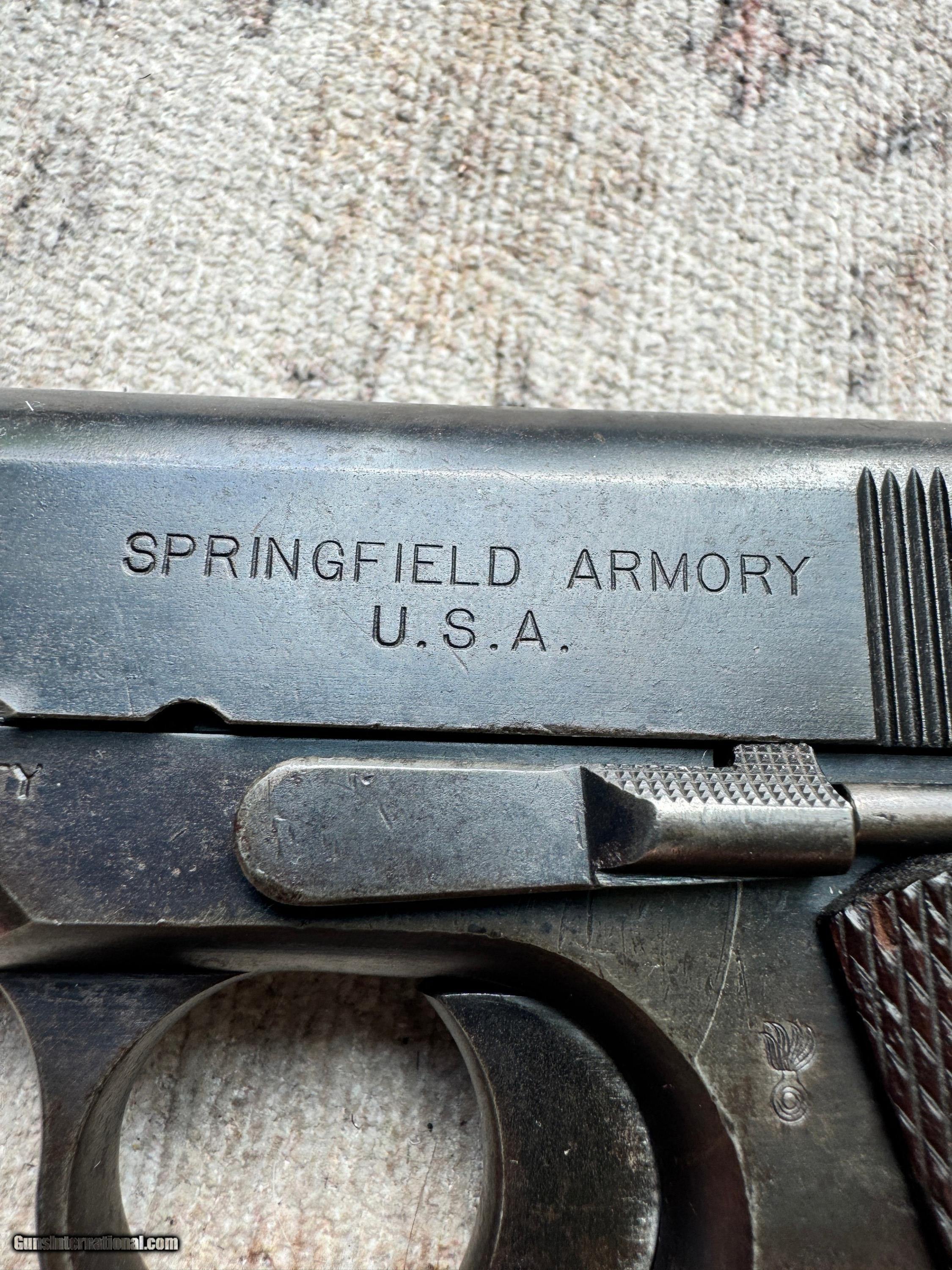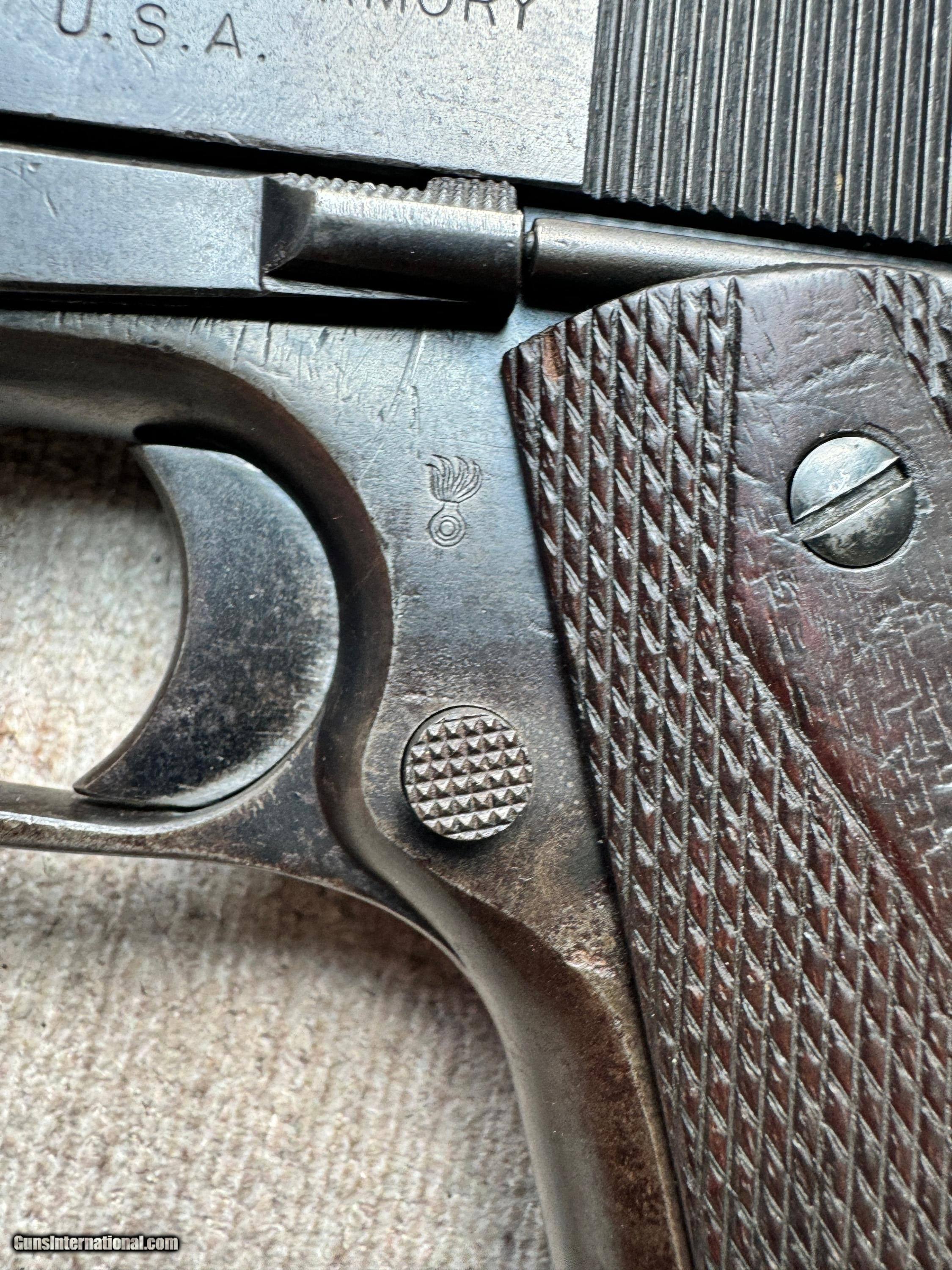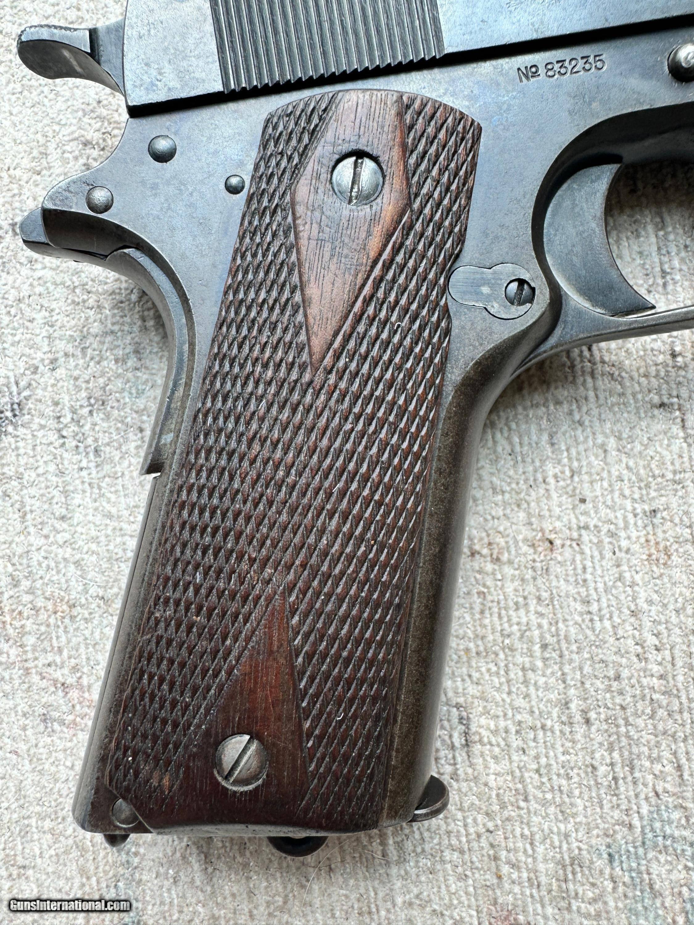 Description: Springfield Armory U.S.A. manufactured 1911 chambered in .45 ACP. This warhorse started out life in the trenches of World War 1. It probably saw more time over it's 109 years of life and has stood the test of time for sure. Serial number 83235 places this in the second serial number block of 1915 for SA. It retains a lot of it's original “Army Black” with the majority of the finish loss on the front and rear back straps as expected with use. The wood correct SA stocks appear to be original to the pistol. The correct SA type 1 magazine is as shown. The hammer is SA type II. The following parts are marked and shown with the proper “S.”