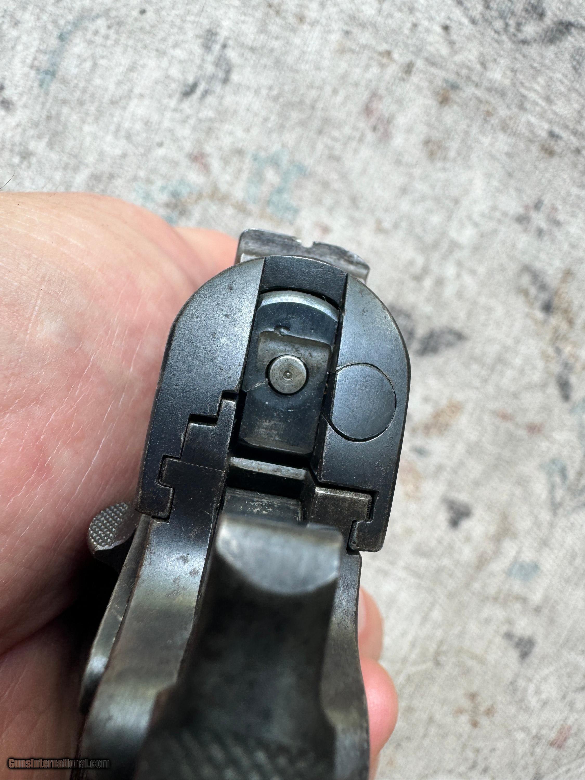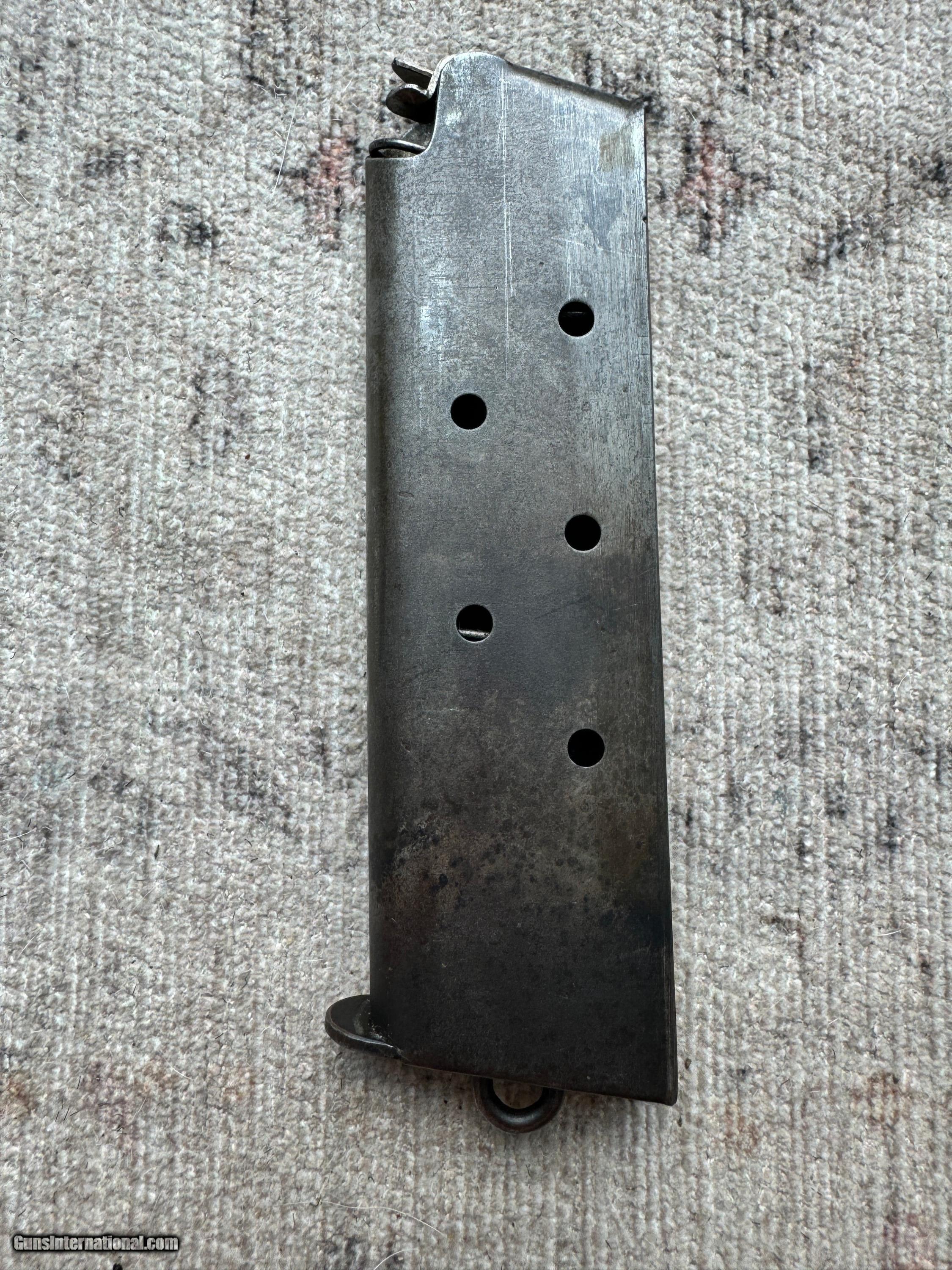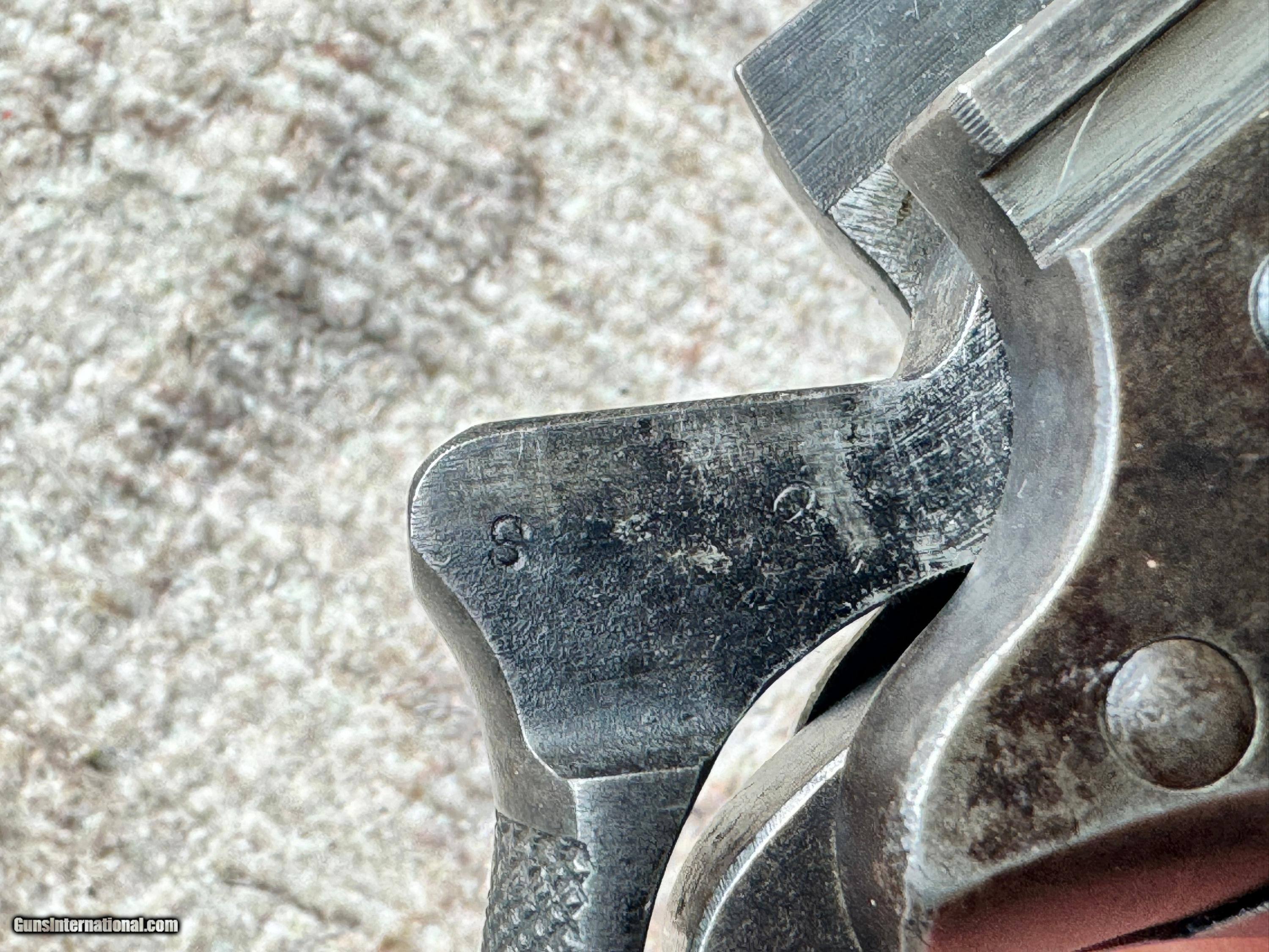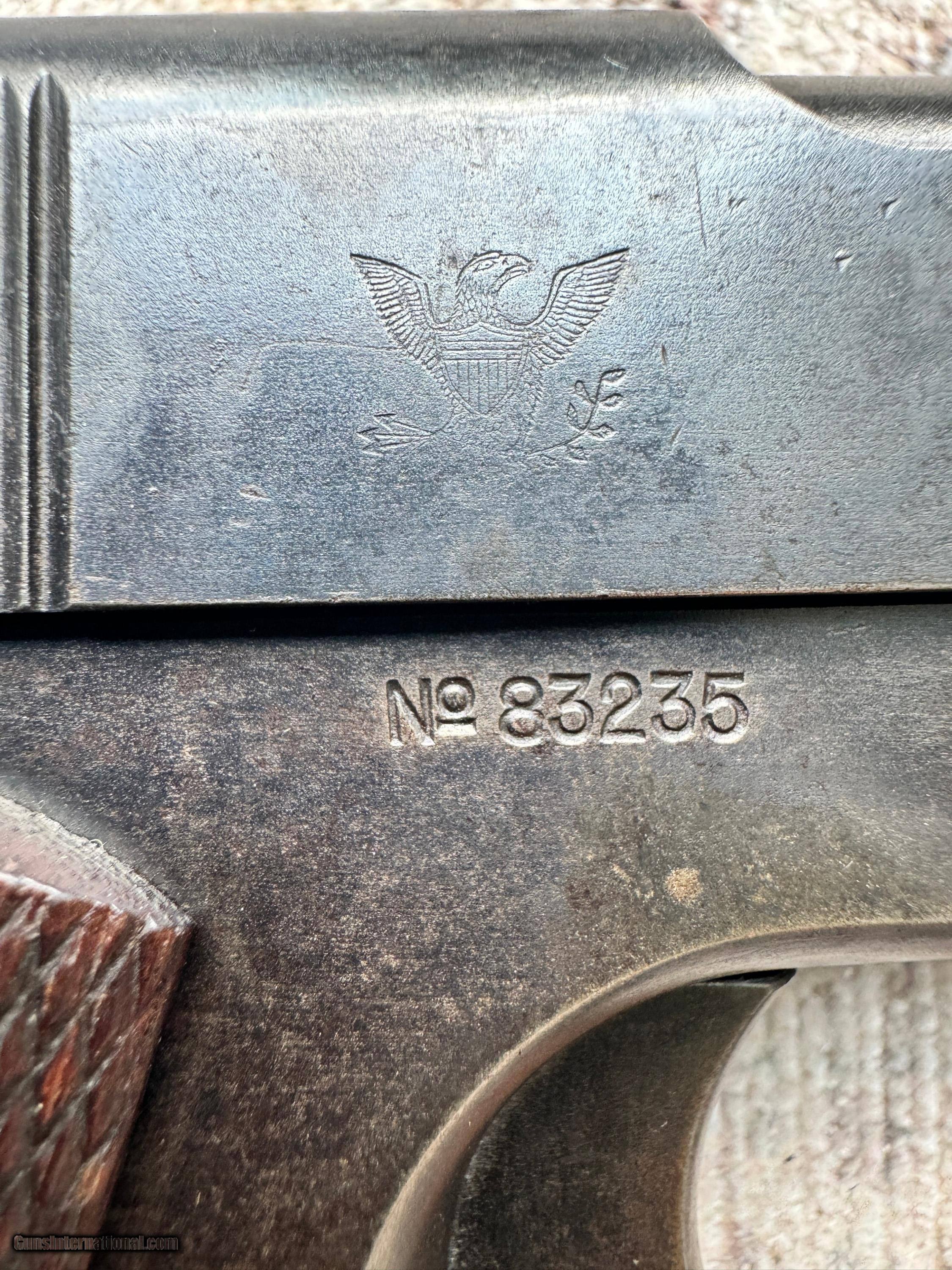 Description: Springfield Armory U.S.A. manufactured 1911 chambered in .45 ACP. This warhorse started out life in the trenches of World War 1. It probably saw more time over it's 109 years of life and has stood the test of time for sure. Serial number 83235 places this in the second serial number block of 1915 for SA. It retains a lot of it's original “Army Black” with the majority of the finish loss on the front and rear back straps as expected with use. The wood correct SA stocks appear to be original to the pistol. The correct SA type 1 magazine is as shown. The hammer is SA type II. The following parts are marked and shown with the proper “S.”
