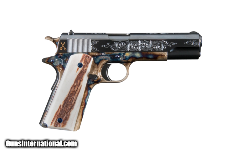 Description: This is a Barbecue inspired handgun that was modeled after the Turnbull Model 1911 and designed to be the perfect accessory to your next summer cookout. The firearm is available in four unique styles of hand engraving on one of two different types of steel frames. Each of styles offers the discriminating collector an opportunity to own a top quality pistol with classic engraving, in the style that best suits the owner. The handgun is equipped with a Nitre Blue finish that is added to really make it standout in the summer sun. The gun features a 24 karat gold inlay of a crossed fork and spatula, the insignia of the BBQ Series and have a unique serial number that is hand cut with the BBQ designation. SOLD |