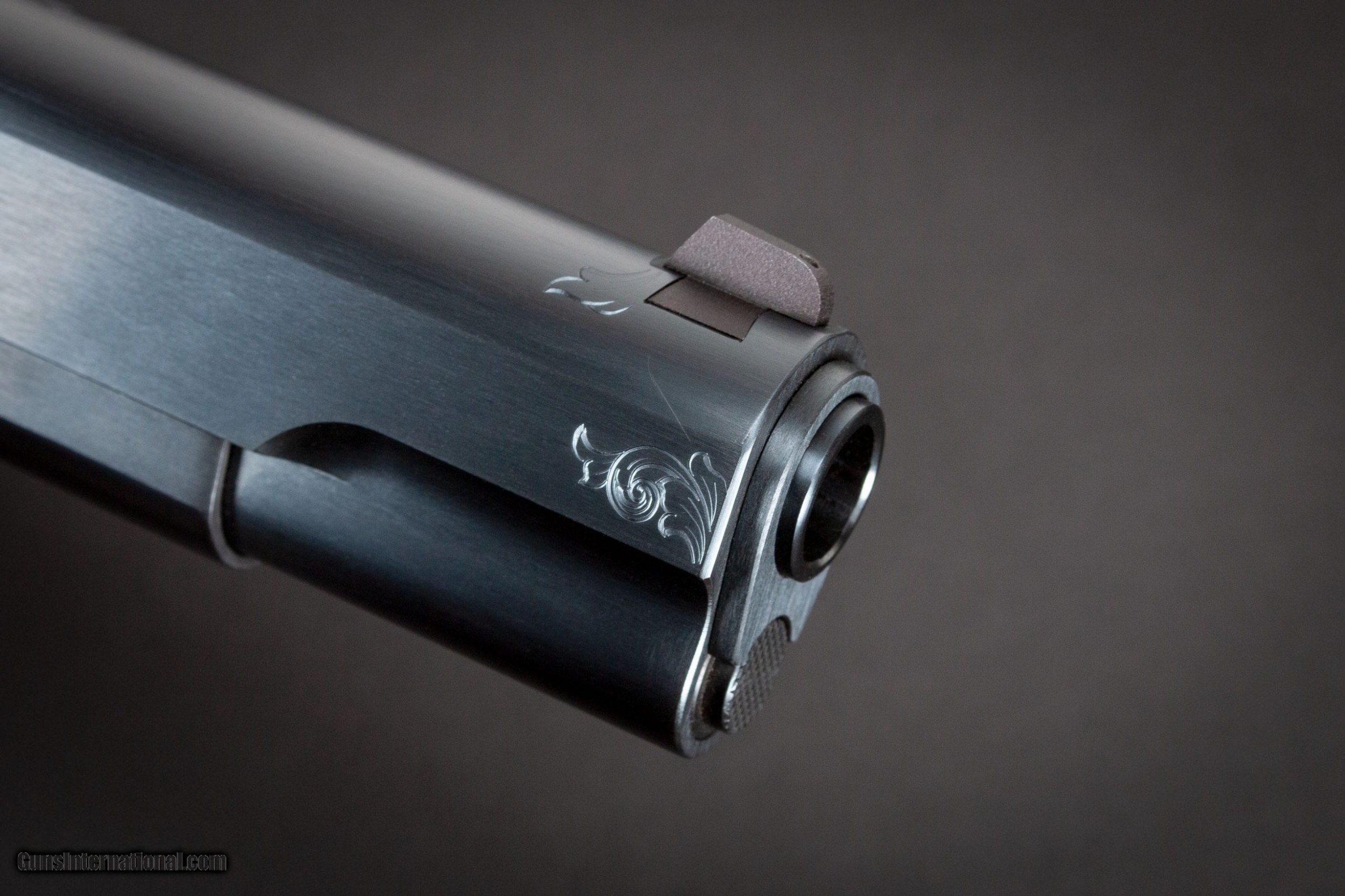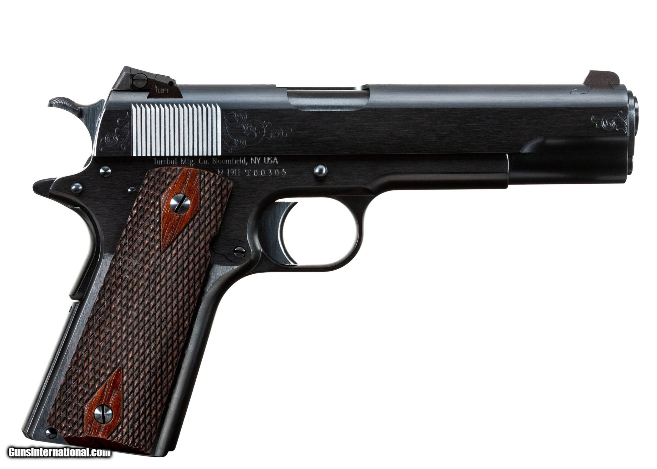 Note that this ready-to-ship example has a few handling marks from several show appearances. See photos: left side of slide near barrel bushing; bottom of frame toward front; thumb safety toward bottom. Price has been adjusted to account for these marks. Contact us for more information and additional photographs SOLD Handgun Caliber: .45 ACP (.45 Auto) Manufacturer: Turnbull Model: 1911 Serial Number: T00305 Barrel Length: 5 Condition: New Action: Semi-Auto Sights: Kensight DAS Adjustable White Dot Rear, Kensight DAS White Dot Front Extras: Two reproduction two-tone magazines, black hardshell case Item Location: NY |