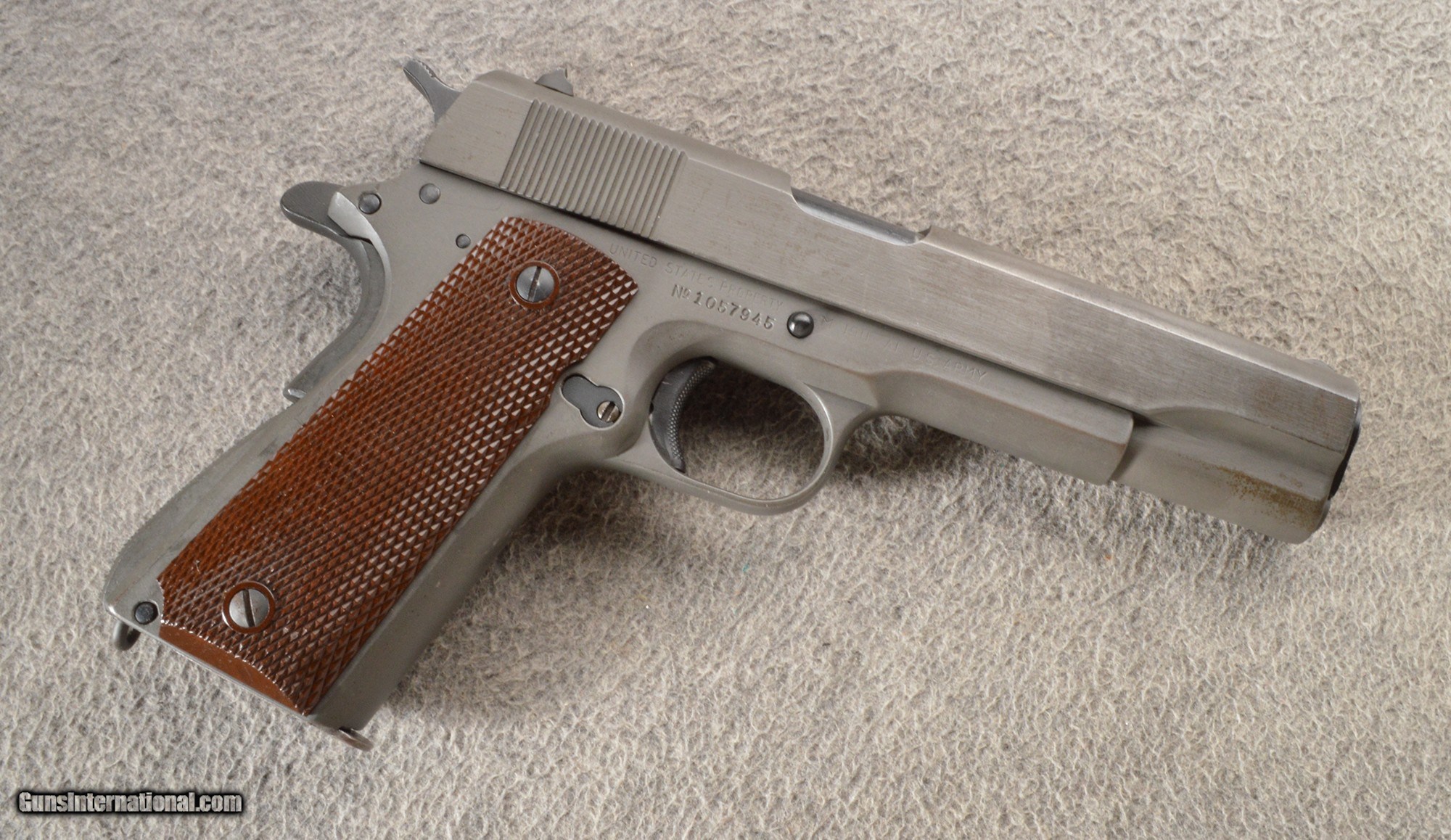Description: This example is a Union Switch & Signal (US&S) Model 1911-A1 in 45 ACP. The left side of the slide is marked with a "USS" logo and "U.S. & S. CO. / SWISSVALE, PA. U.S.A.". The left side of the frame is marked with a circled "R.C.D." above the magazine release, and a "P" acceptance proof below the magazine release. The right side of the frame is marked "UNITED STATES PROPERTY / No 1057945" and "M 1911A1 U.S. ARMY". There is another "P" on the top of the slide in front of the rear sight. Left side of barrel lug has a "P" and right side has an "HS". The "P" stamp indicates it was proofed, and the "HS" signifies that the barrel was manufactured by High Standard for Union Switch and Signal. The magazine is marked on the top toe with an "A" for (American Pin Company). The magazine no rust or dents.The front sight is a short-serrated ramp blade and the rear is a dovetailed square notch. The grips are two-piece checkered brown with reinforcement rings around the screws. .45 Auto SOLD Chambers: Semi auto. Metal Condition: 95% remaining with minor finish wear. No deep scratches or gauges. Wood Condition: The grips are in excellent condition with no chips or cracks. Bore Condition: The bore shows well-defined rifling with light pitting throughout the lands and grooves. Triggers: Single action trigger. Sights: "Fixed front, drift adjustable rear. Item Location: Owatonna, MN |