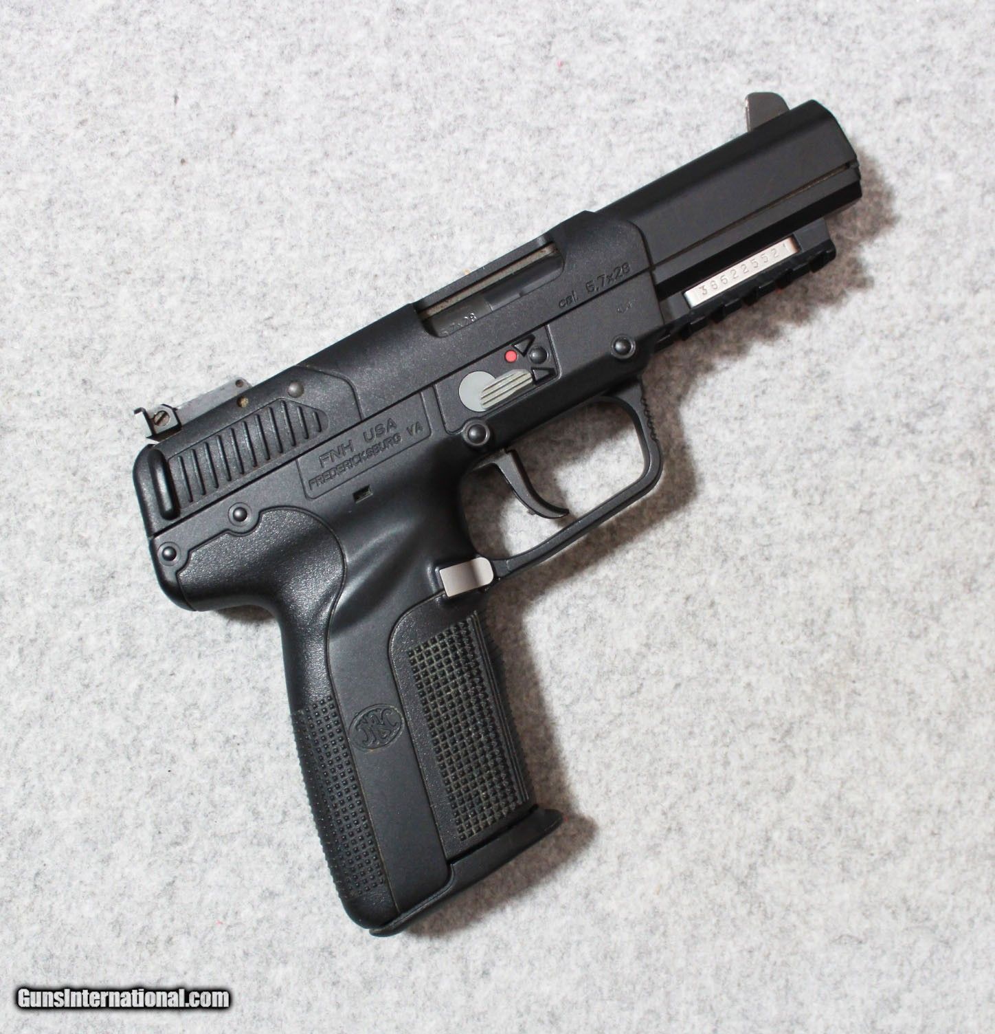 Description: FN Five-Seven single action, semiautomatic pistol chambered in 5.7x28mm. It has a 4.5" barrel with rear slide serrations. The front sight is a black blade with a white dot, and the rear sight is a black adjustable u-notch with white dots. The controls are right-hand, the safety is ambidextrous, and the frame has an accessory rail. Includes factory hard case, three magazines, and manual. Free shipping to any Bass Pro Shops or Cabela's store. 5.7X28mm Metal Condition: Good with Minor Handling Marks Bore Condition: Bright and Clear Barrels: 4.5 inch Triggers: Single Action Weight: 23 oz Sights: Front: Black Blade with White Dot / Rear: Black Adjustable U-Notch with White Dots Item Location: Allen, TX Price: $799.99 Contact Seller |