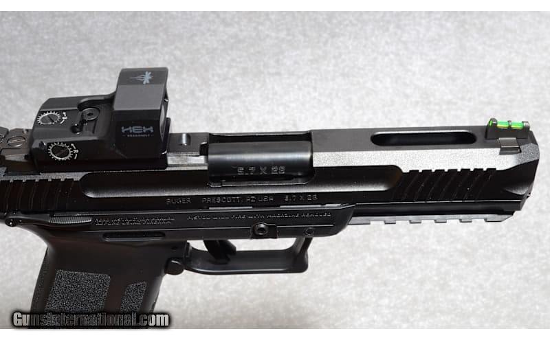 Description: The Ruger-5.7 is a semi-automatic pistol introduced in December 2019 by Sturm, Ruger & Co. It is the first traditionally-styled semi-automatic pistol to be chambered for the 5.7×28mm cartridge since the introduction of the Excel Arms MP-57 in 2012. The Ruger-5.7 was introduced to be a more affordable alternative 5.7x28mm semi-automatic pistol compared to the FN Five-seven pistol. The 5.7x28mm (5.7) pistol cartridge which FN developed in the1980s is a small caliber, high-velocity pistol cartridge which is based on the 5.56x45mm SS109 NATO round. The ammo is fast, delivering about 2,000 feet per second when it leaves a 5-inch barrel. 5.7X28mm Chambers: Semi-Auto Metal Condition: Excellent Condition Bore Condition: Excellent Condition Barrels: 5 Inch Barrel Triggers: Factory Weight: 1 3/4 lbs. Sights: Green Fiber Optic Front Sight with Adjustable U-Notched Rear Sight and a HEX Dragonfly Reflex Red Dot Sight Item Location: Tulalip, WA Price: $659.99 Contact Seller |