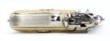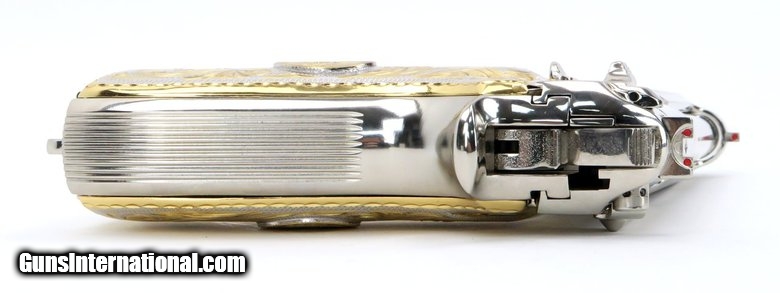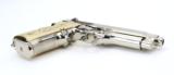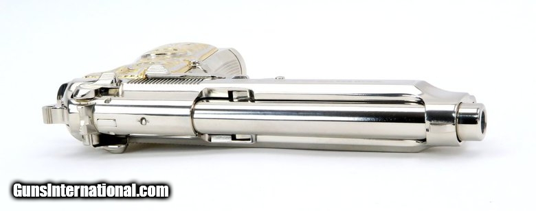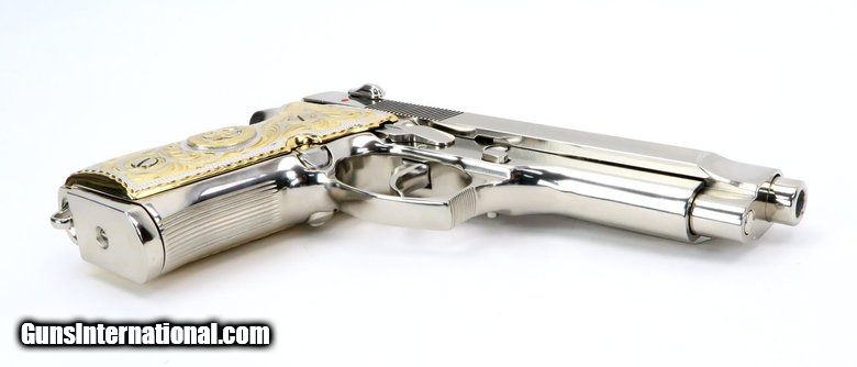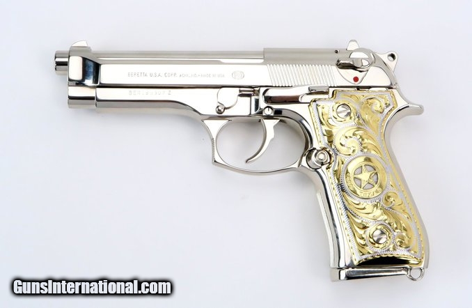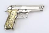 Description: Beretta 92FS 9mm Para caliber pistol. Customized with bright nickel finish and Mexican style silver and gold plated grips.