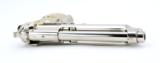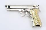 Beretta 92FS 9mm Para caliber pistol. Customized with bright nickel finish and Mexican style silver and gold plated grips.