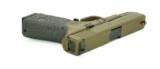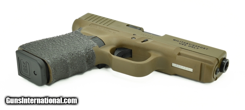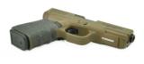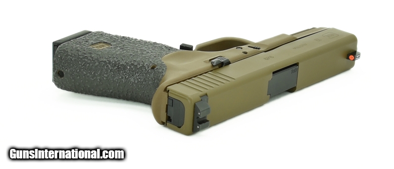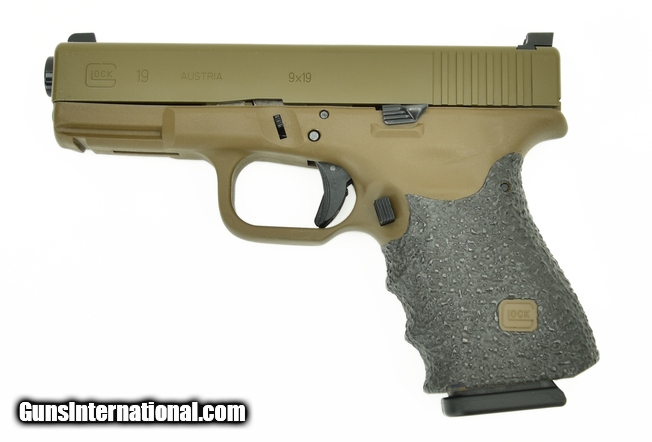 Glock 19 9mm caliber pistol. Customized by Rocke Guns with Coyote Brown cerakote, night sights, upgraded trigger and barrel in excellent condition.