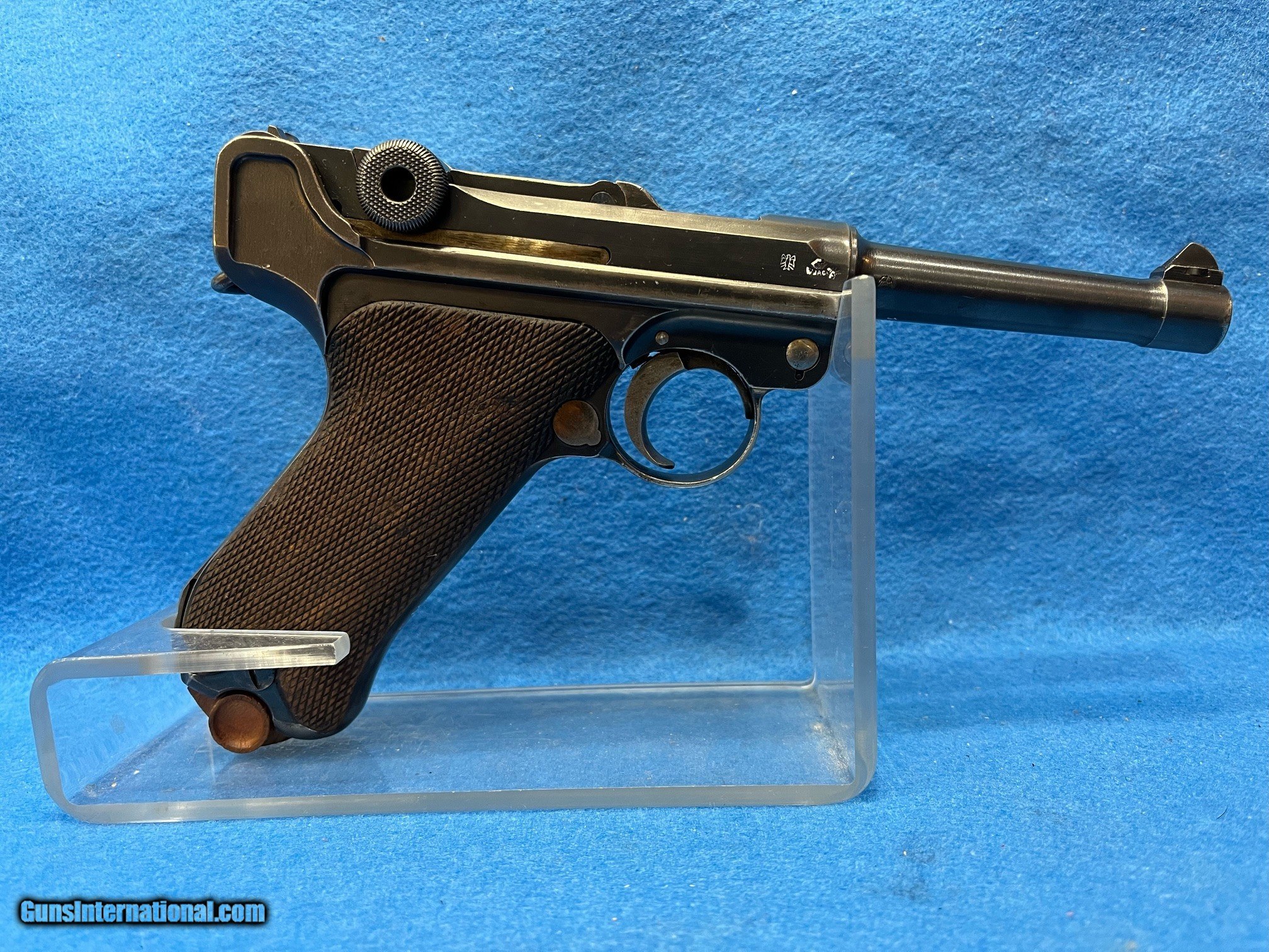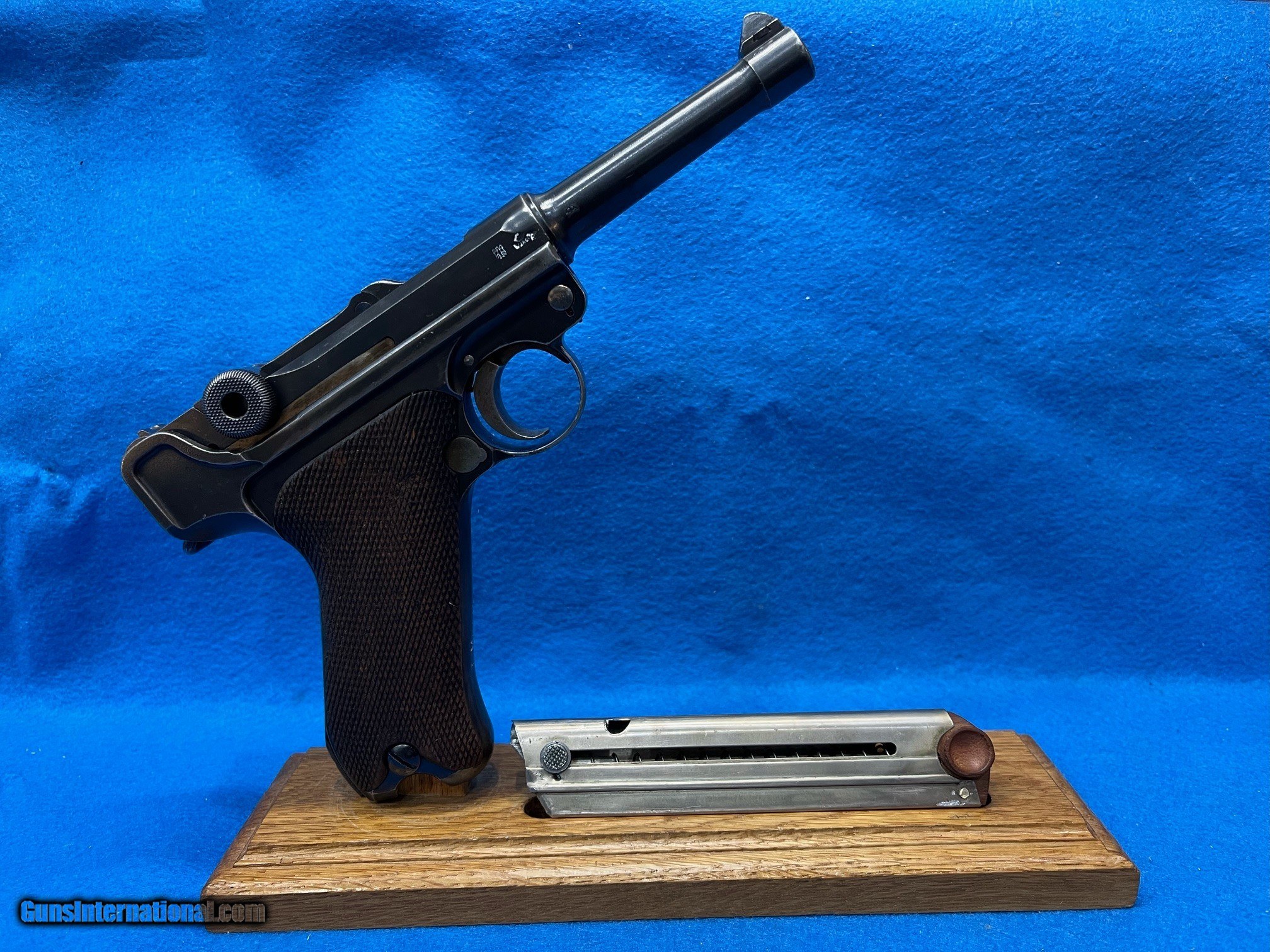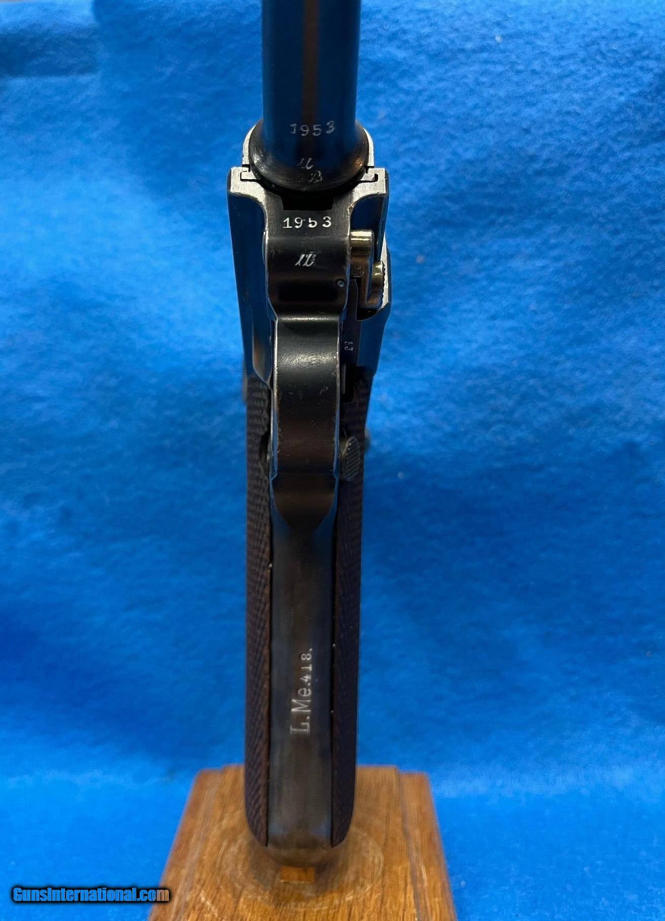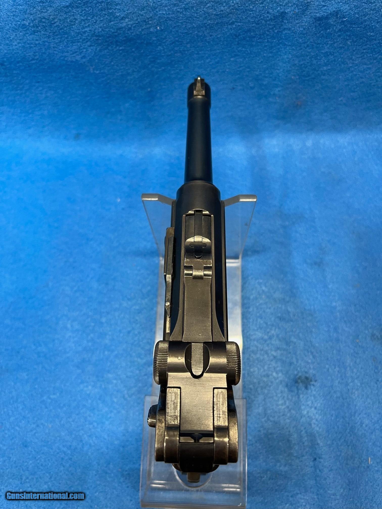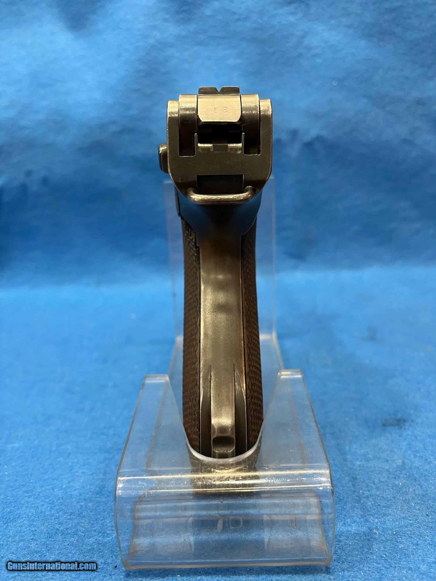 Description: SER. 1953 U, "POLICE" THE TERM USED BY THE ARSENAL TO DISTINGUISH THE "VERSAILLE TREATY" GUNS THAT WERE NOT SUPPOSED HAVE MILITARY USE,AND WERE HEADED FOR POLICE DUTY.. FIRST, THE MILITARY MFG. DATE AND THE PROOFS WERE REMOVED. THEN CERTAIN PARTS HAD THE NUMBERS PUT oON THE BOTTOM OF THE PART OR REMOVED AS. A HIGH POLISH FINISH WAS ALSO ADDED.. THIS GUN HAS RETAINED 98-99%. OF THE HIGH POLISH FINISH. THE WOODEN CHECKERED GRIPS ARE PERFECT EXCEPT FOR USUAL SLIVER MISSING FROM UNDER THE SAFETY LEVER ALL PARTS MATCH AND HAVE THE PROPER COMMERCIAL PROOFS** A "POLICE' SEAR SAFETY" WAS ADDED ABOVE THE SIDE PLATE AND A TRIGGER SAFETY WAS PUT UNDER THE GRIP FROM THE LEFT SIDE FRAME PANEL AND EXTENDED TO UNDER THE TRIGGER. THIS SAFETY WAS TUNED TO THE SPECIFIC MAGAZINE ISSUED THIS WAS LATER REMOVEDAND BECAUSE THE GUN WOULD LOCK UP IF THE MAGAZINE WAS CHANGED, THE HOLE IN SIDE FRAME AND IN THE FRONT THE GRIP STILL SHOWS EVIDENCE OF THE REMOVAL. THE FRONT GRIP STRAP IS STAMPED. "L. Me. 418. WHICH IS THE THE POLICE STATION INVENTORYNUMBER. THE SLIDE RAILS, BOLT FACE AND FEED RAMP HAVE SEEN LITTLE IF ANY USE. THE BORE IS GREAT, MIRROR BRIGHT WITH RAZOR SHARP RIFLING. THE GUN COMES WITH ONE CORRECT WOODEN BASED MAGAZINE AND A NICE MILITARY MARKED HOLSTER MODIFIED FOR A POLICE BELT. FOR THE COLLECTOR THAT WANTS.AN UNUSUAL AND SUPER P-08. FOR THE RANGE AND HIS COLLECTION THIS ONE IS PRICED FOR THE MODEST BUDGET BUYER.......$2295.*** **THE HARMLESS WHITE CRAYON IS TO SHOW THAT ALL MARKINGS ARE CORRECT. IT IS EASILY REMOVED WITH LIGHTER FLUID AND A BRUSH. WE WILL DO IT ON REQUEST. *** 100% OF THE GUN'S PRICE IS SATISFACTION GUARANTEED. THERE IS A 3 DAY EXAMINATION PERIOD IN WHICH RETURNS CAN BE MADE, PROVIDED THE WEAPON HASN'T BEEN FIRED SOLD Handgun Caliber: 9x19mm Parabellum (9mm Luger, 9x19mm NATO) |