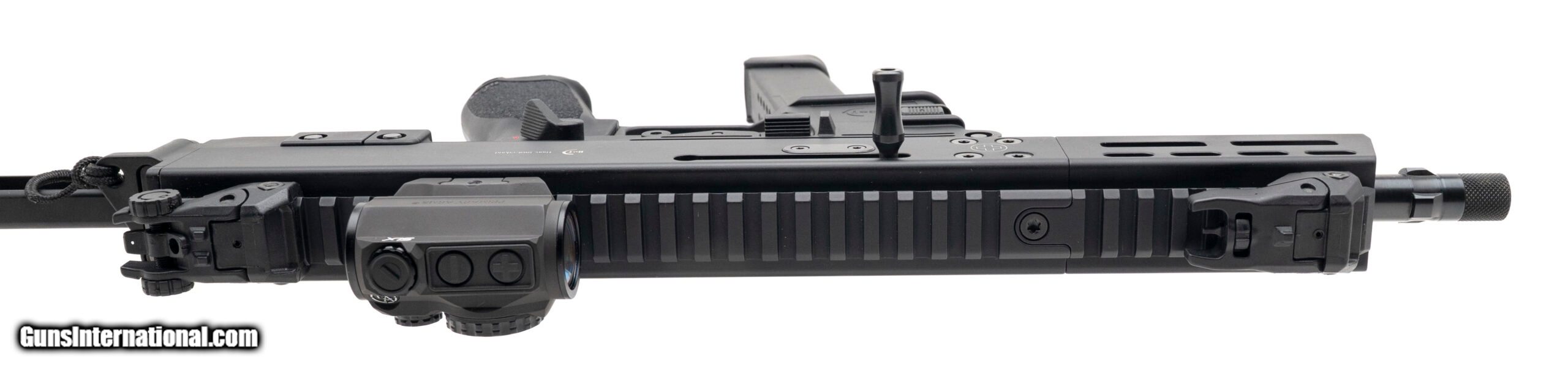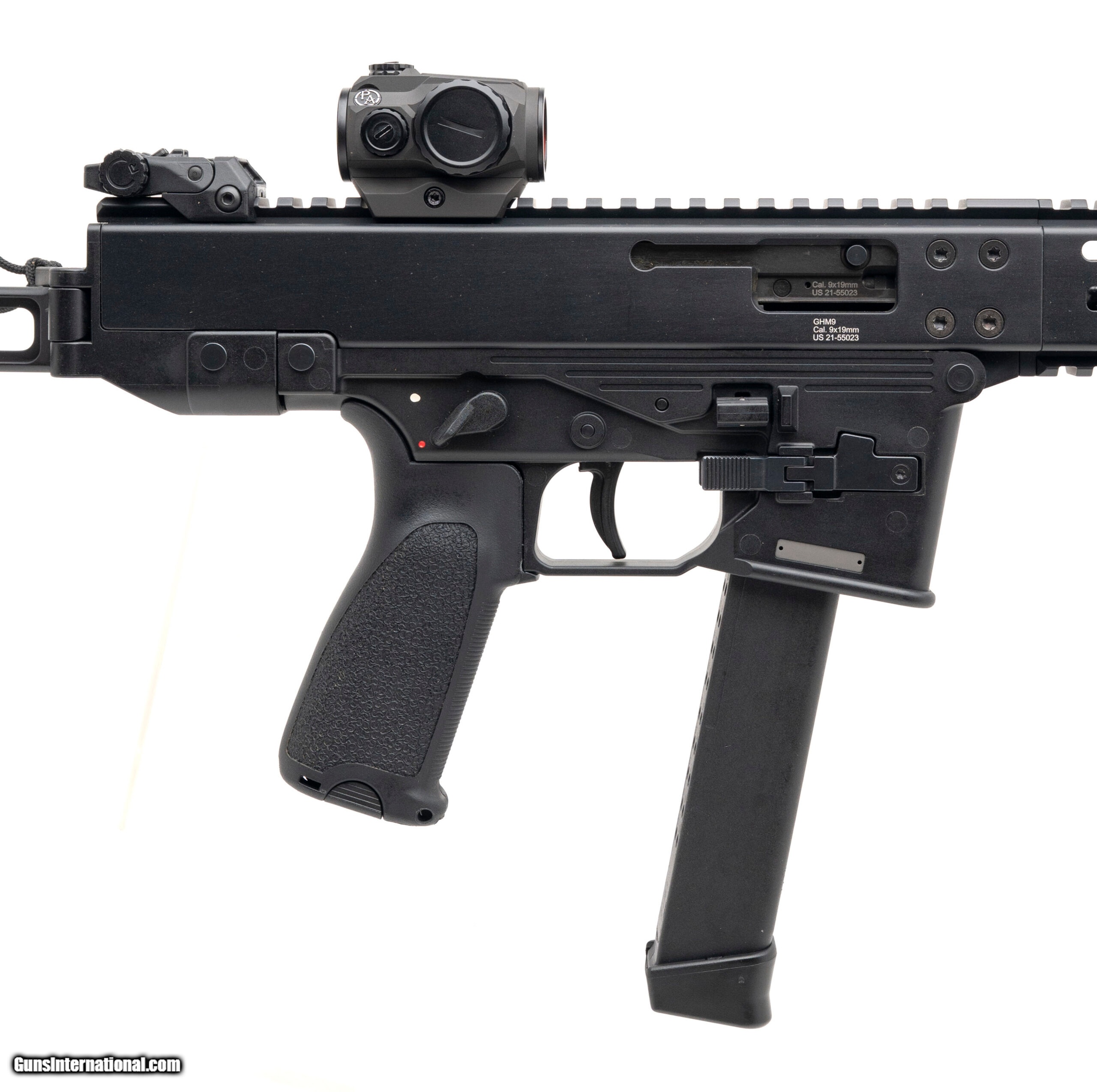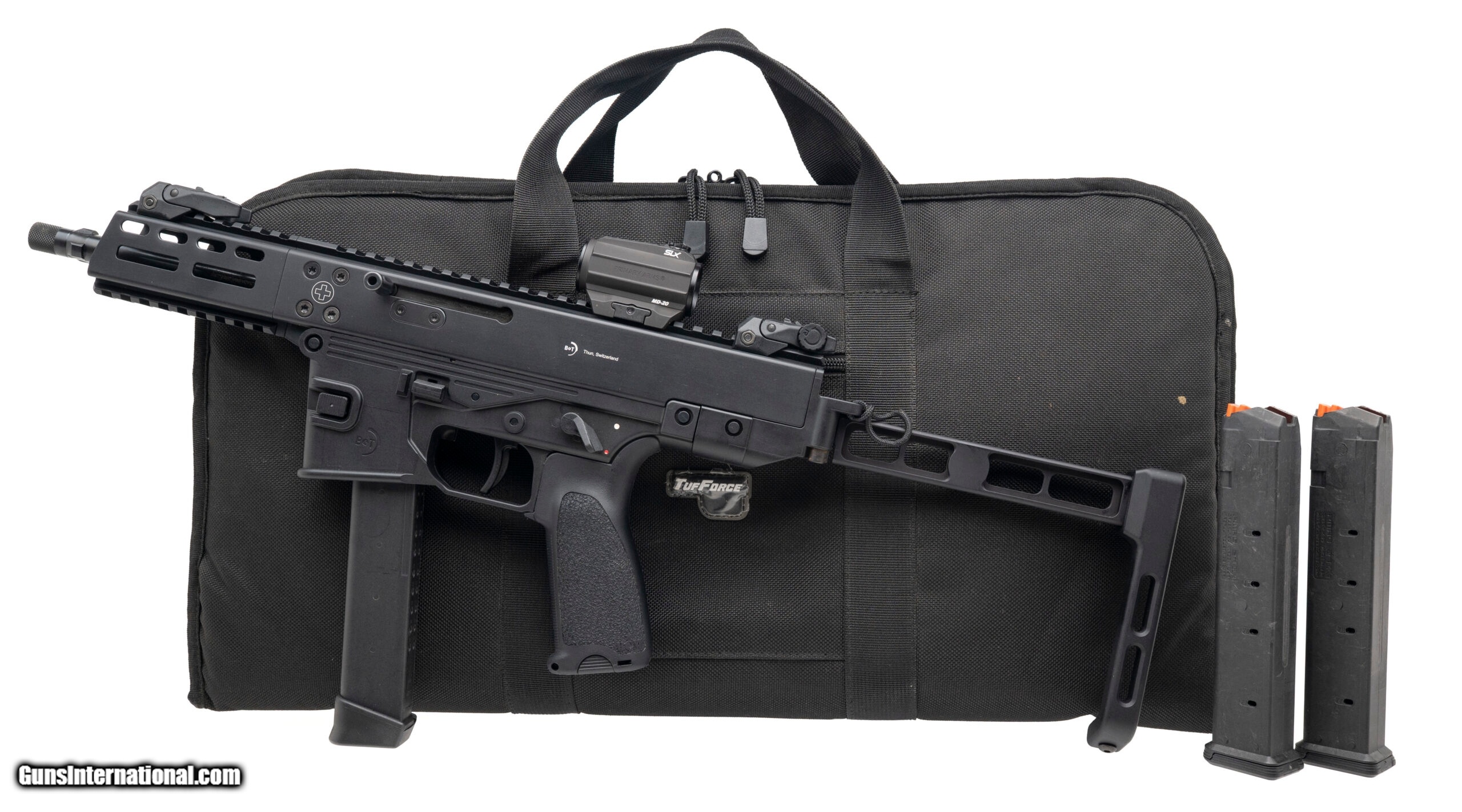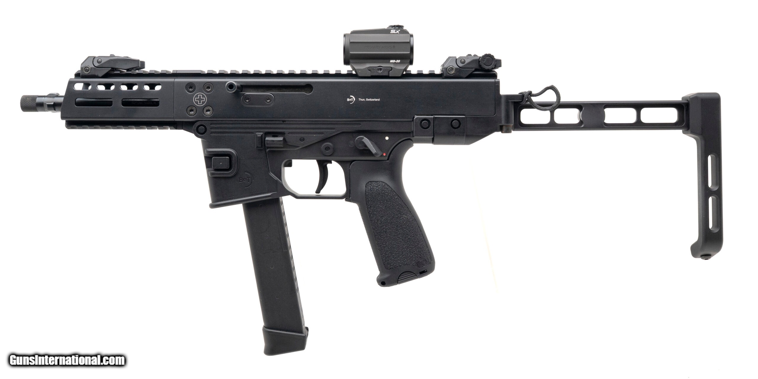 Description: "SN: US21-55023. Modern production, 9mm with a 6.9"" threaded/tri-lug barrel. Bore is bright with excellent rifling. Swiss made tactical pistol with a Primary Arms SLX MD-20 red dot optic, flip-up sights, and a side-folding stabilizing brace. Lower accepts Glock magazines. Overall condition is excellent. Comes with carry bag and two extra magazines. SOLD |