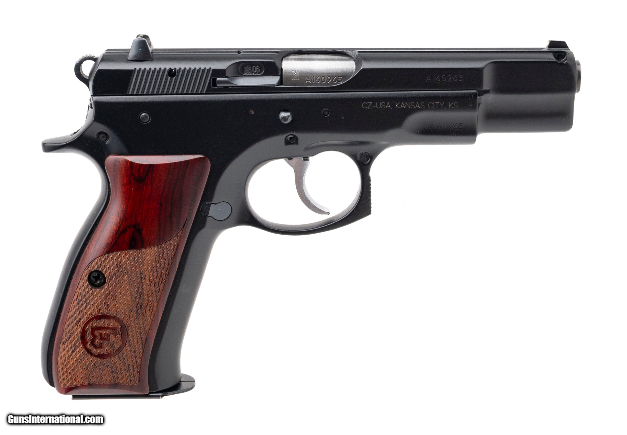 Description: "SN: A160965. Modern production, 9mm with a 4.6"" barrel. Bore is bright with strong rifling. Czech made double action pistol with checkered wood grips. Very good condition overall with case and original rubber grips. Price: $699.95 Contact Seller |