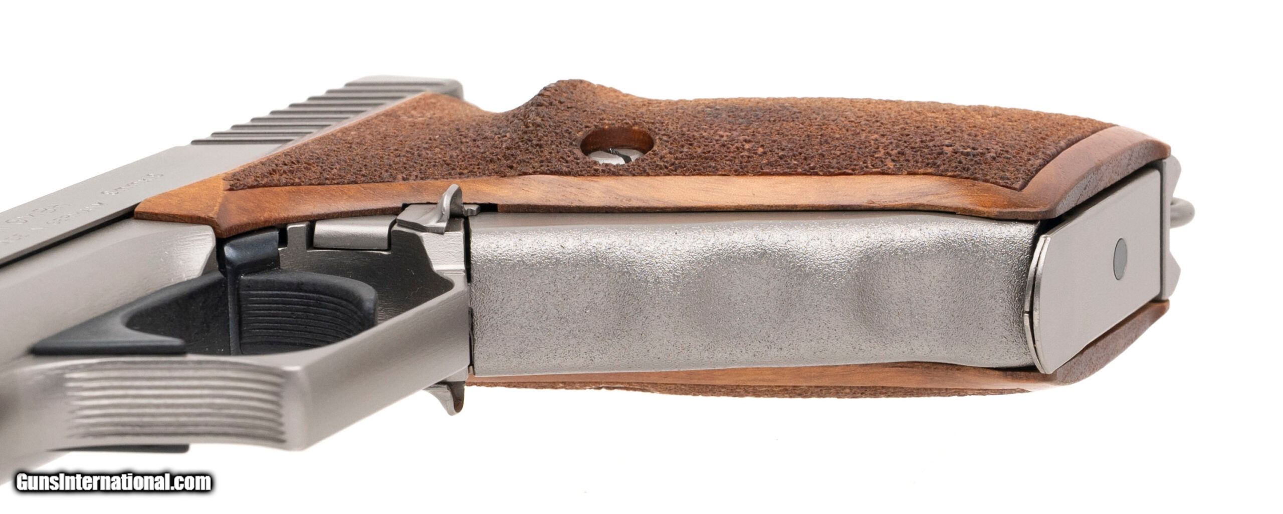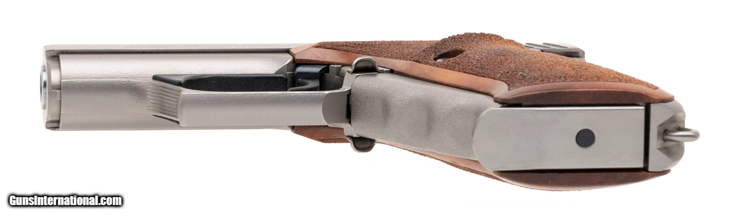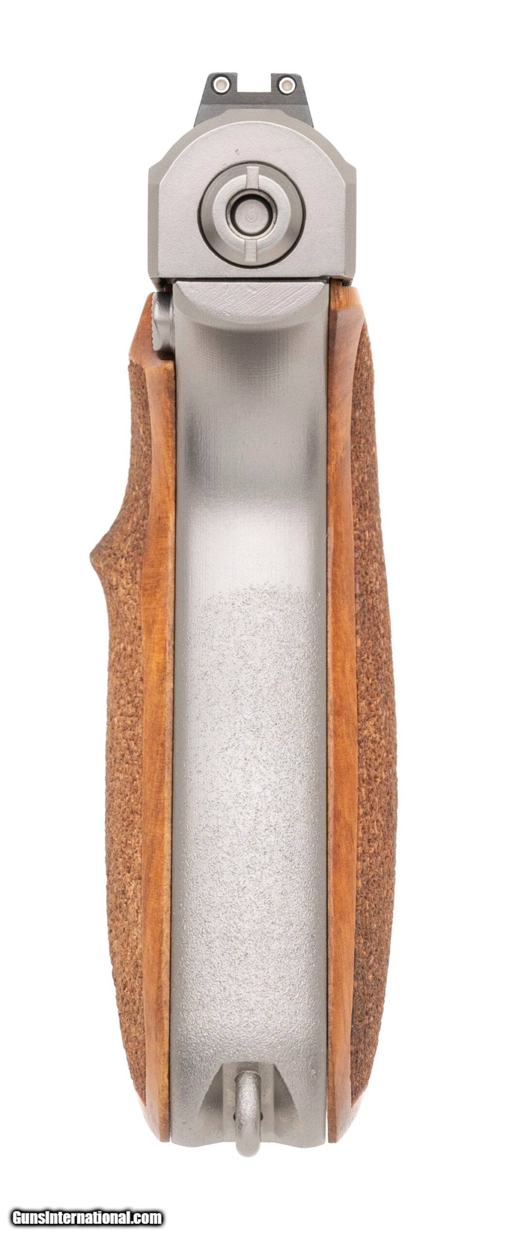 Description: "SN: 16-120886M8. Made in 1995, 9mm with an 4"" barrel. Rare German made squeezecocker pistol with factory satin nickel finish, upgraded Trijicon night sights, and German made custom wood grips by Karl Nill-Griffe. Excellent condition with original case, sights, manual, and bore brush. Price: $5,500.00 Contact Seller |