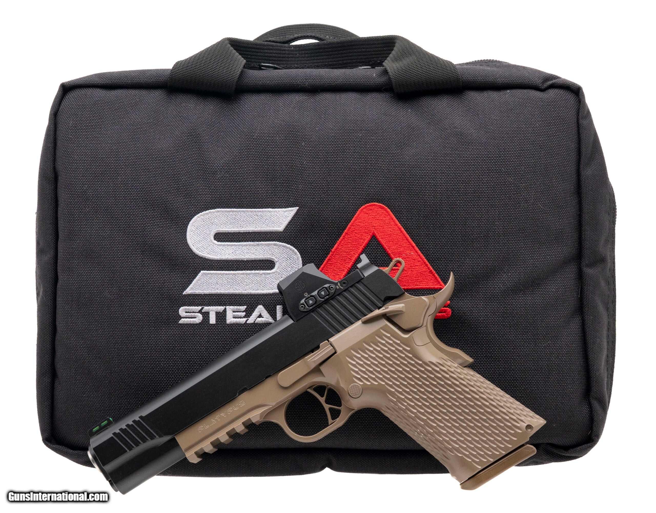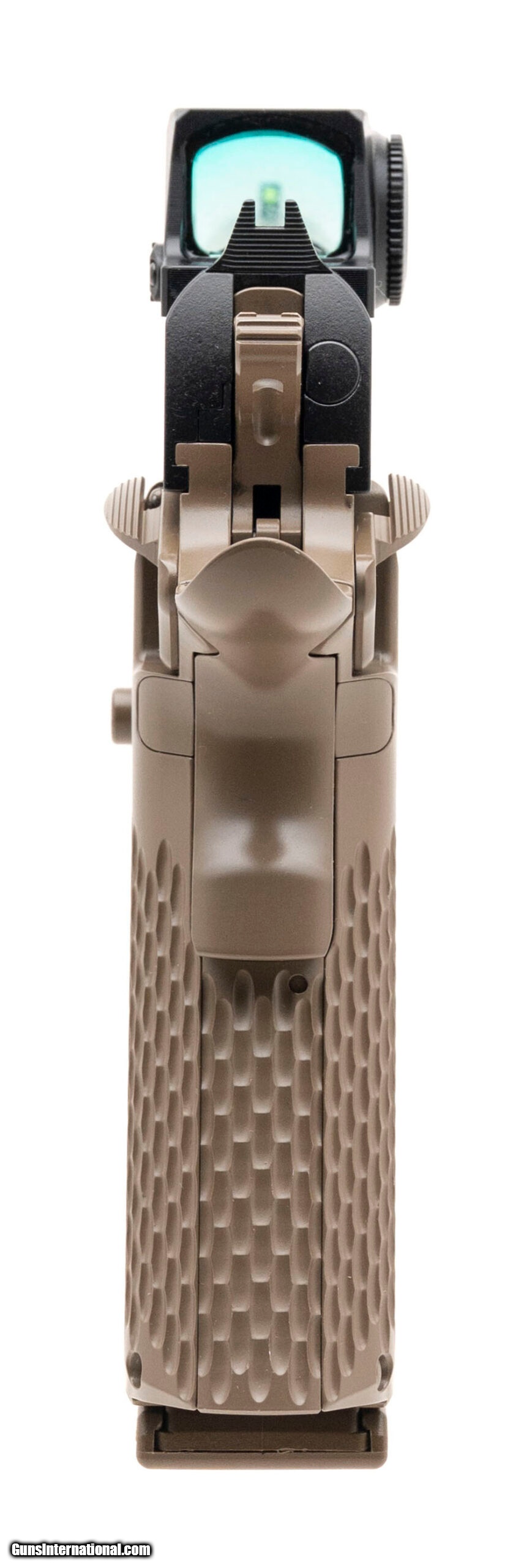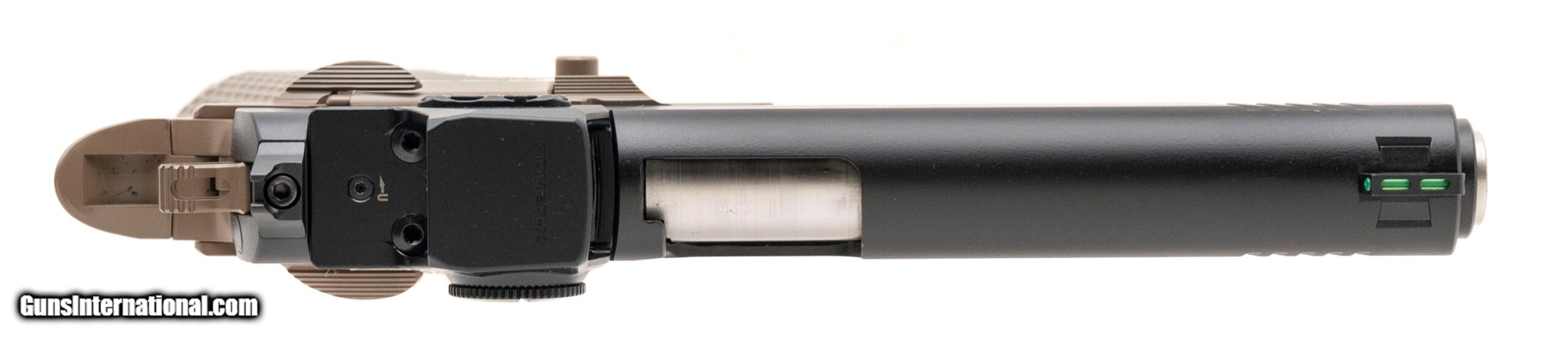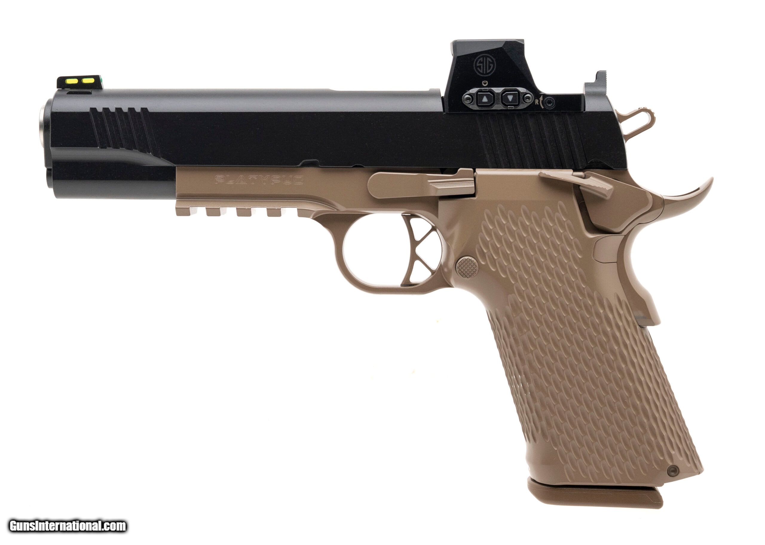 Description: "SN: 2109012312. Modern production, 9mm with a 5"" barrel. Custom two tone 1911 style pistol with an SIG Romeo-X red dot optic. Overall condition is near excellent. Comes with a SA carry bag. Accepts Glock magazines. SOLD |