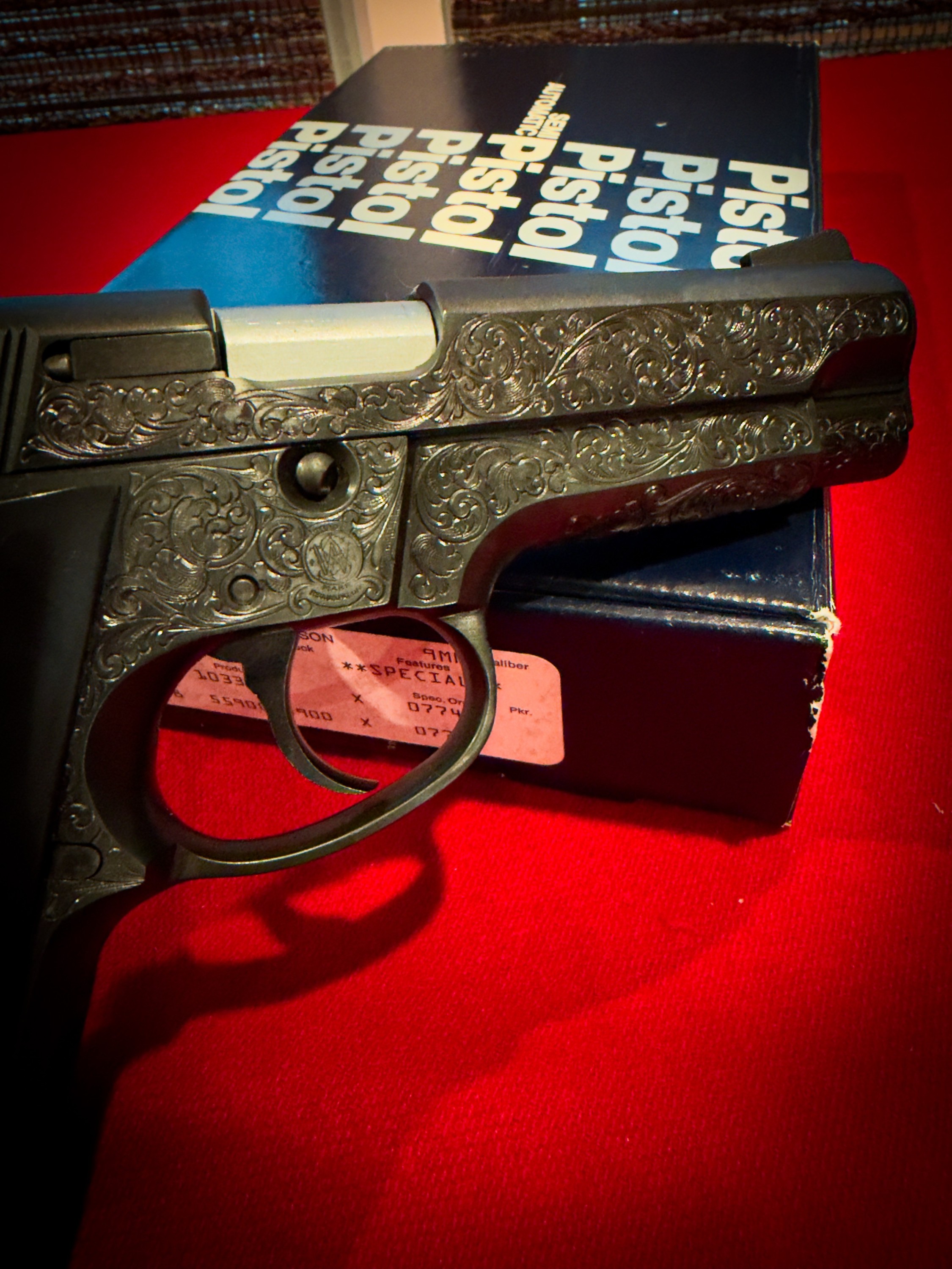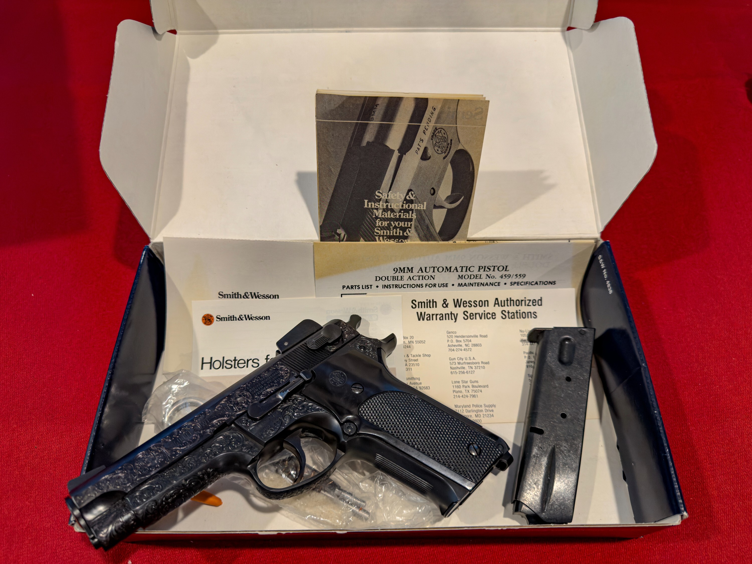 Description: Beautiful Blue Factory Engraved Smith & Wesson Model 559 9mm, 4” barrel with an excellent bore. This lovely early 1980’s pistol has beautiful full coverage factory Class-A tight scroll engraving with light cross-hatch shading. The metal surfaces retain 99% original blue. The checkered synthetic factory grips feature S&W monograms and remain in excellent condition. This gun features a serrated Baughman ramp front sight, fully adjustable black blade rear sight with protective ears, frame mounted de-cocker / safety, and appears to function mechanically. It includes the original factory box that is correctly end labeled and numbered to the gun, a pair of fourteen-round magazines, cleaning kit, manual, paperwork. Only about FIFTY of the Model 559’s are known to have received Class A factory engraving making this a rare find for the advanced collector!! Call or text at 972-670-8562 Price: $5,700.00 Shipping: $100.00 Buy Now Pay with