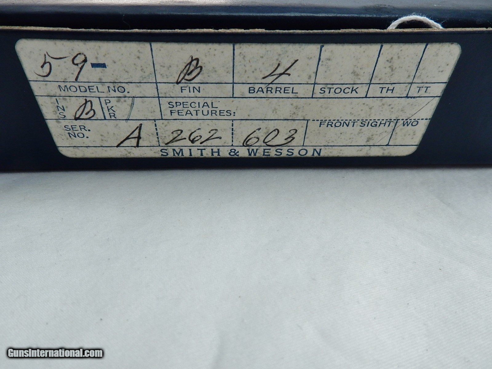 Description: This is a Smith Wesson 59 9mm. This gun is 100% new in the box. Serial # is A262xxx. Buyer pays 35.00 shipping. Thank you. 45-13-10 SOLD |
