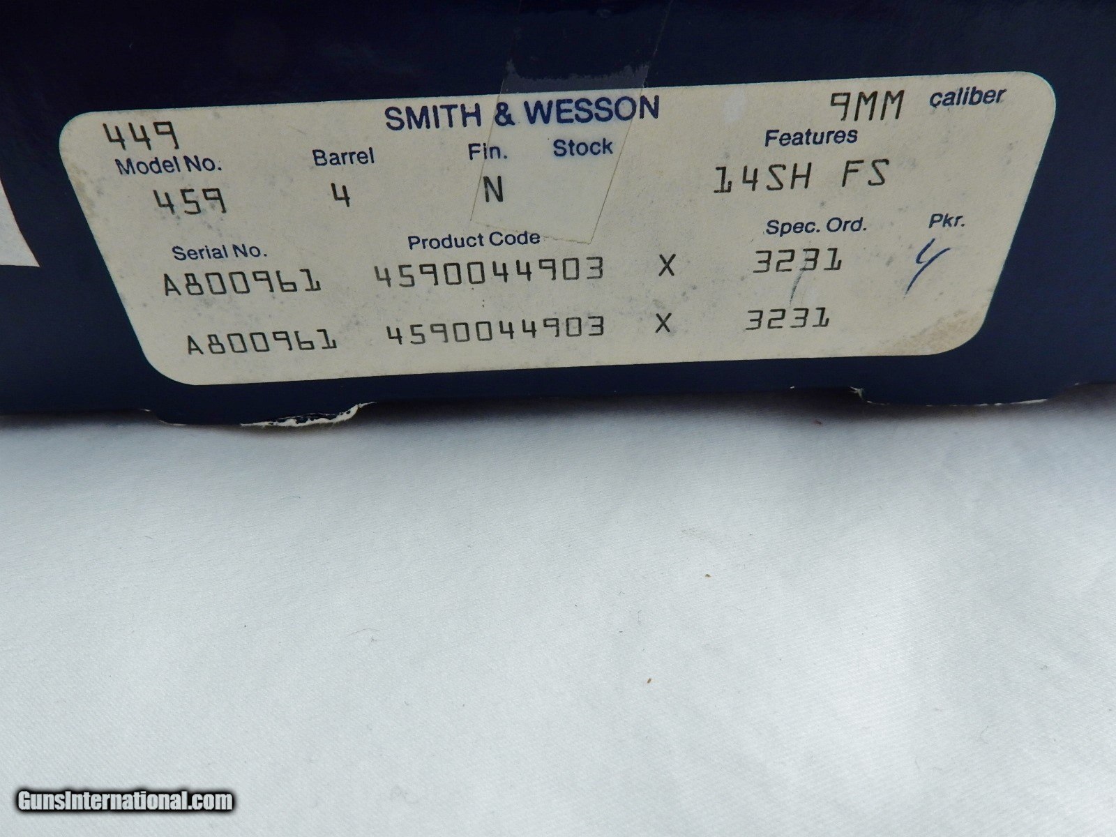 Description: This is a Smith Wesson 459 9mm. This gun is 100% new in the box. Serial # is A800xxx. Buyer pays 35.00 shipping. Thank you. 43-7-10 SOLD |