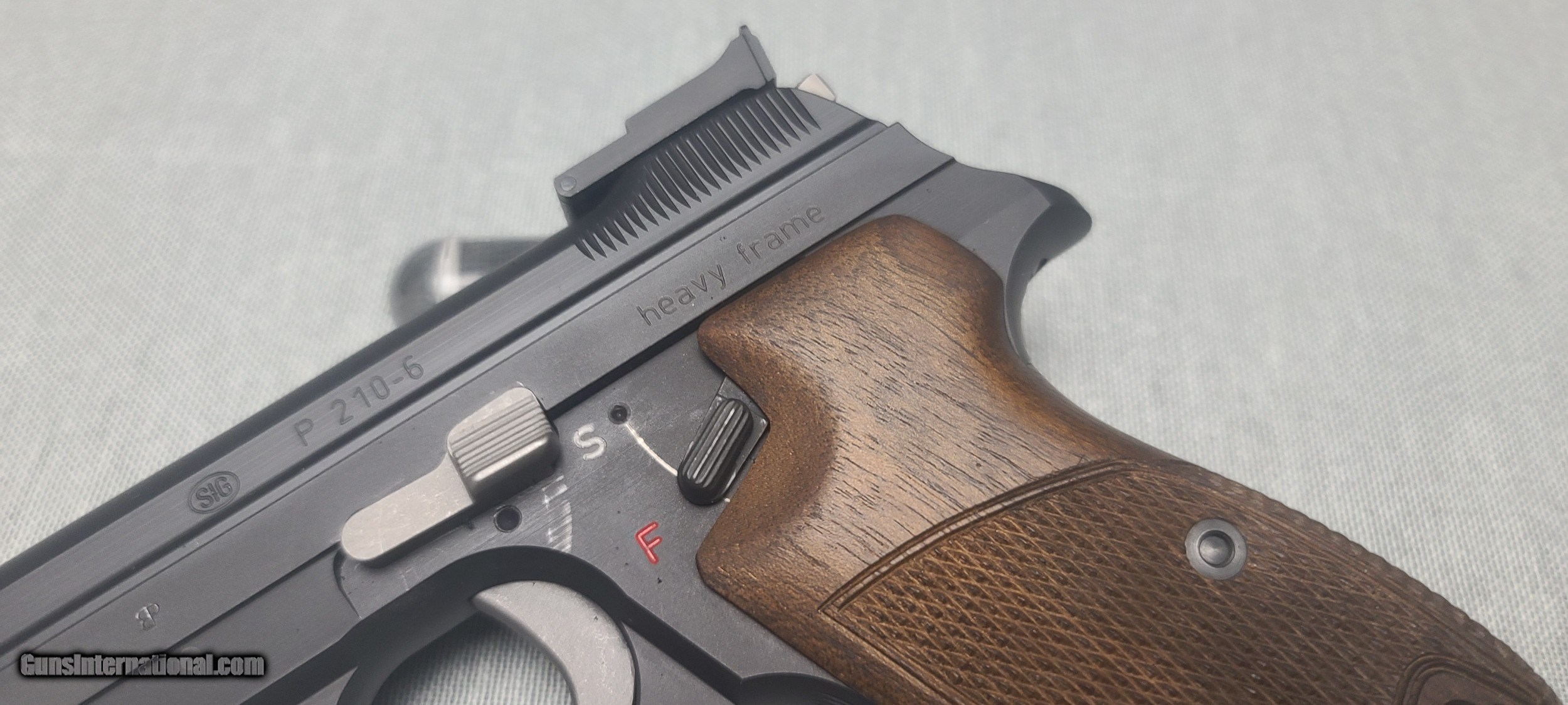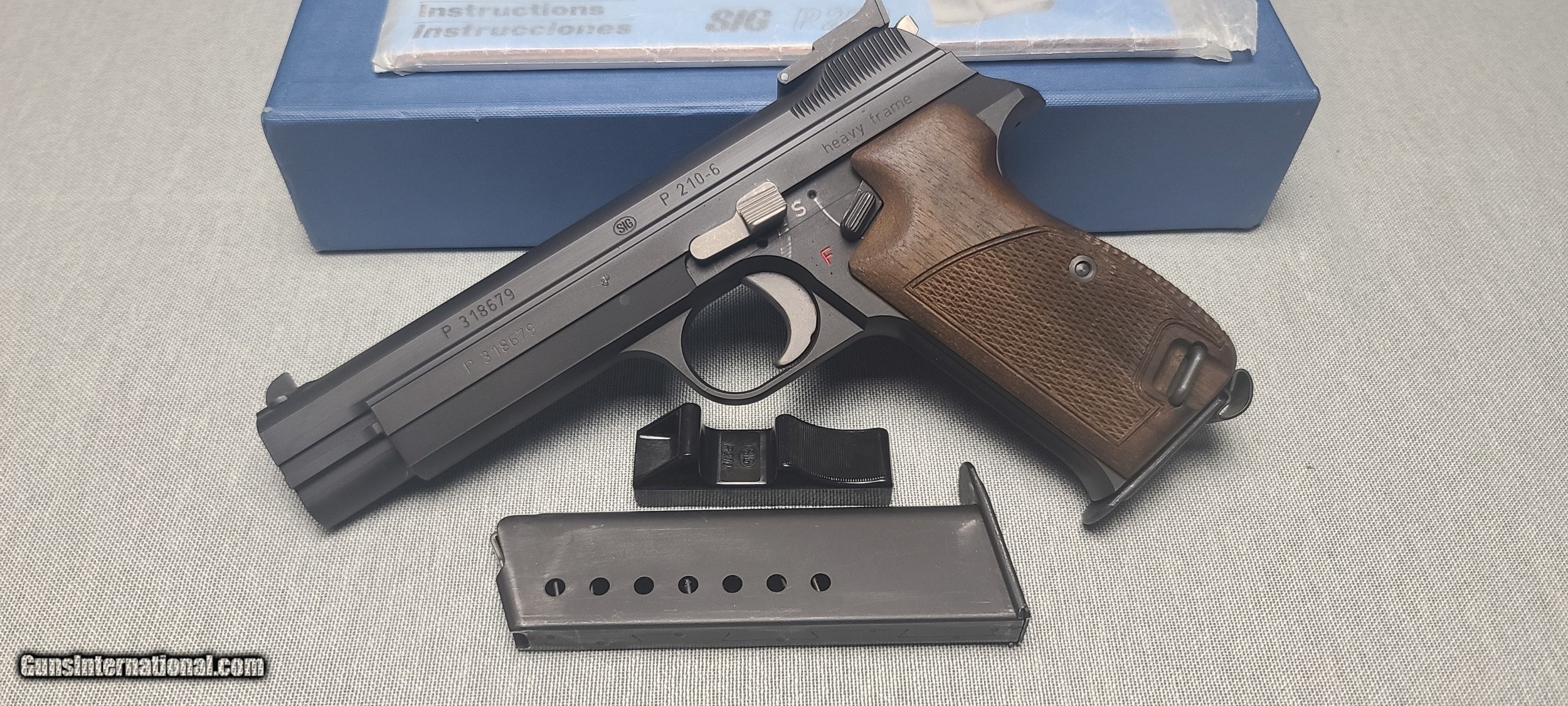 Description: Reluctantly I offer a beautiful Swiss Heavy Frame model SIG P210-6 for National Match Competition in 9mm. All numbers match.. in virtually perfect condition. This is a Complete package with everything that was included as new, including cardboard box and label. The 5" high quality barrel has mirror bright bore with strong lands and grooves. The trigger has butter smooth pull with a crisp clean break. The hammer is built into a removable assembly for easy maintenance, fashioned after the Tokarev TT-30 pistol. It’s the highest quality and most accurate pistol I have ever had the pleasure of shooting.. a single-action pistol with a single stack 8 round magazine for easy loading 9mm ammunition.. the pistol is very durable and reliable with slide and frame being machined from cast or forged blocks of steel. The P210's slide rides inside the frame rails, rather than outside, as seen in the traditional Browning arms. The location of the slide rails feature mimics the frame-to-receiver interface of its predecessor in Swiss military service, the Luger pistol, allowing for a very tight fit between the slide, barrel, and frame without compromising reliability. This construction contributes to the unusually high accuracy for which the SIG P210 is known. Please look at the pictures and let me know if you have any questions or concerns. Ship to anywhere in USA is 50.00 and FFL is required for transfer, C & R is NOT ok. SOLD Handgun Caliber: 9x19mm Parabellum (9mm Luger, 9x19mm NATO) Manufacturer: Swiss Waffen Model: P210 heavy frame Serial Number: 318xxx Barrel Length: 5 Condition: mint Metal Condition: mint Bore Condition: mint |