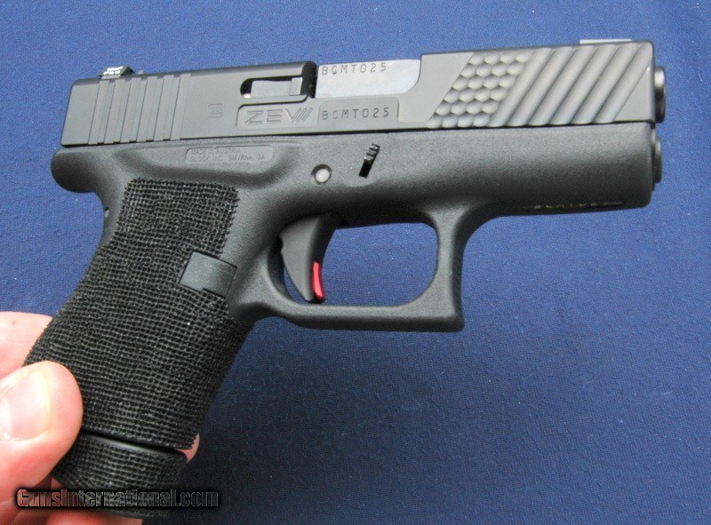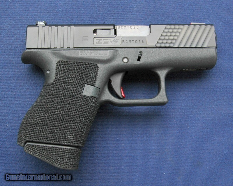 Description: Here we have a custom Glock 43 done up by Zev Tech. It appears to have their custom Fulcrum trigger job, custom stippling, custom Zev slide with Trijicon tritium sights dated 2016. Test fired only. Comes in the factory box with 2 magazines and all original paperwork as shown. $35 shipping to the lower 48, 3% surcharge for using a CC. If you choose to pay with a personal check, we will hold the item for up to 10 days to make sure that it clears. Please expedite such pymts as we will hold an item on your word for 5 days. SOLD |