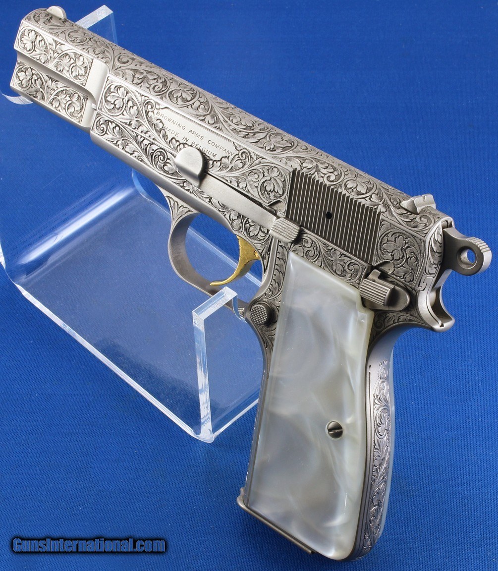 Description: A truly magnificent rendition of Browning's iconic Hi Power. This 50 year old ring hammer pistol is from 1969, the height of Belgium factory engraving excellence. I'll be happy to provide additional specific images if requested. The price includes shipping from my FFL to your FFL. SOLD Manufacturer: Browning Model: Hi Power Caliber Info: 9mm Condition: 99% Engraving: Renaissance Case: Factory soft case |