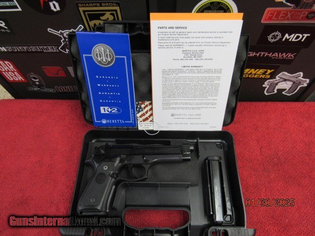 Description: PRE OWNED ONCE FIRED- VERY GOOD CONDITION- LIGHT USAGE MARKS AT MAGWELL/ BARREL/ FRAME INCLUDES FACTORY BOX/ MANUAL 2 15 ROUND MAGAZINES INCLUDED BERETTA 92 M9 9MM 4.9″ BLACK Beretta 92 M9 9mm 4.9″ 15+1 Black, Bruniton Serrated Steel Slide From the jungle heat of Panama to the sandstorms of Iraq, the men and women of the U.S. Armed Forces have counted on the Beretta M9 pistol for over two decades of distinguished service and reliability. The Commercial M9 pistol is the closest replica to the military M9 that a civilian may legally own. This M9's distinctive military-style markings on various components closely resemble those of the M9 pistols used by the U.S. Armed Forces, and its 3-dot sight system clones that of the military M9. These two features as well as the unique M9-prefixed serial number set this Commercial M9 apart from the Beretta 92 FS pistol. SPECIFICATIONS IS FIREARMYes ACTIONSingle/Double BARREL4.9" CALIBER9mm Luger CAPACITY15 FINISHBruniton GRIPAlloy Frame / Black Plastic Grips MAGAZINE2 / 15 rd. SAFETYAmbidextrous Manual Safety SIGHTS3-Dot WEIGHT33.3 oz. BARREL LENGTH4.9 SOLD Handgun Caliber: 9x19mm Parabellum (9mm Luger, 9x19mm NATO) Manufacturer: BERETTA Model: J92M9AOM M9 COMMERCIAL Serial Number: J92M9A0M Barrel Length: 4.9 Condition: VERY GOOD Metal Condition: VERY GOOD Bore Condition: EXCELLETN Action: DA/SA Sights: 3 DOT WHITE |