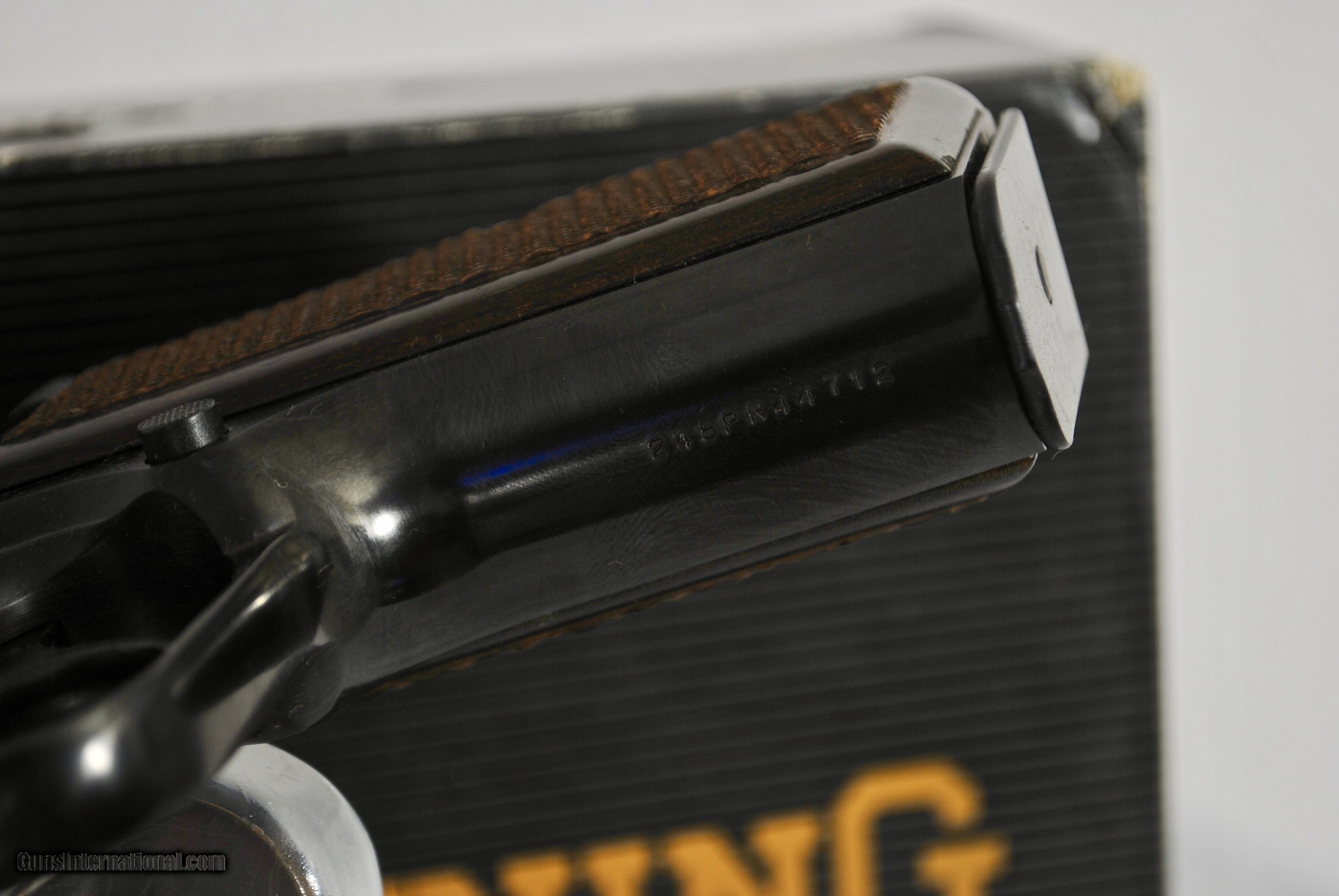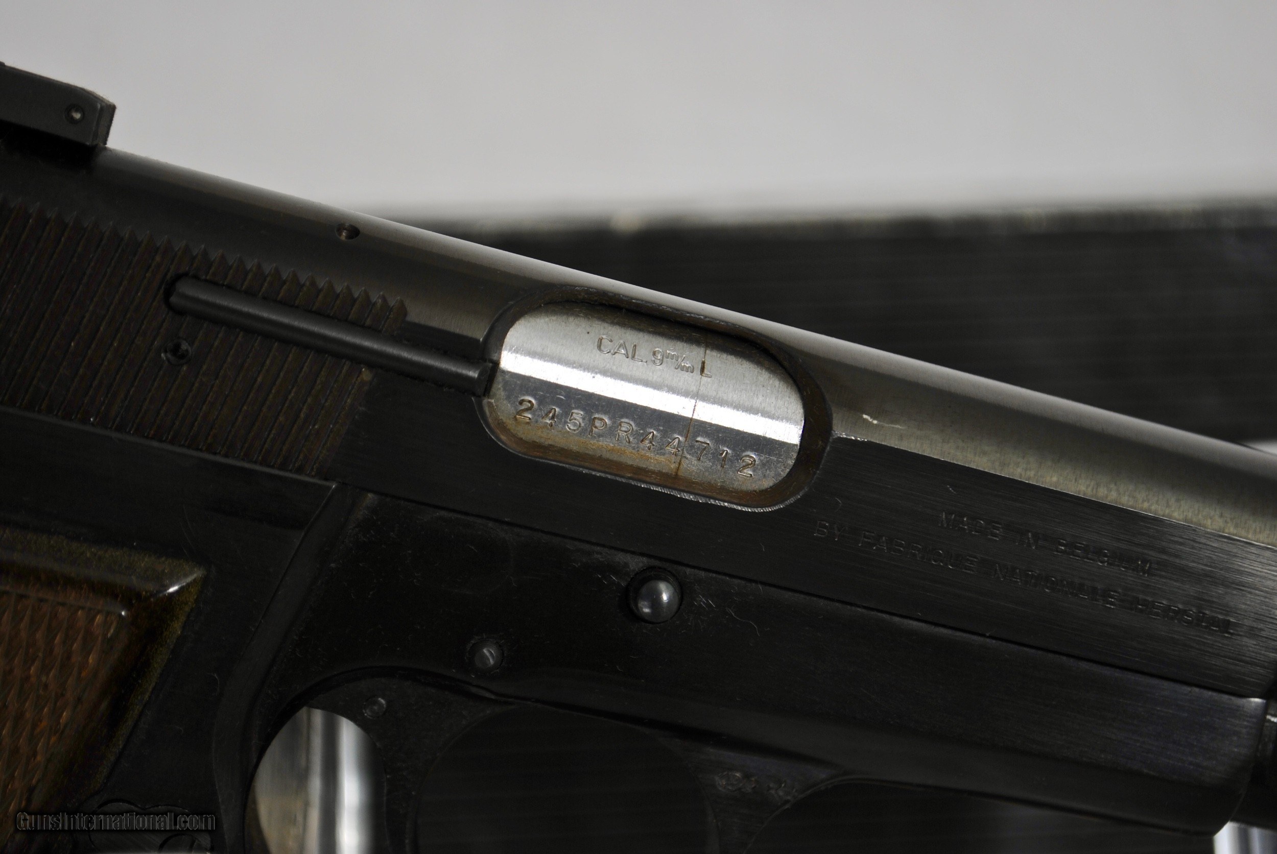 Description: SALE PENDING. Here is a Browning Hi-Power made in Belgium - as new with box and paperwork. 9MM Luger. Adjustable rear sight. Checkered walnut grips. Spur hammer. Polished blue finish. Barrel is 4 21/32". Shipping is $50. For inquiries please call Guy - 407-721-3748 SOLD |