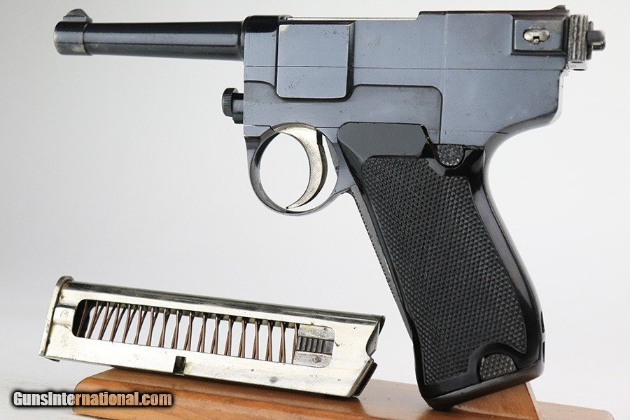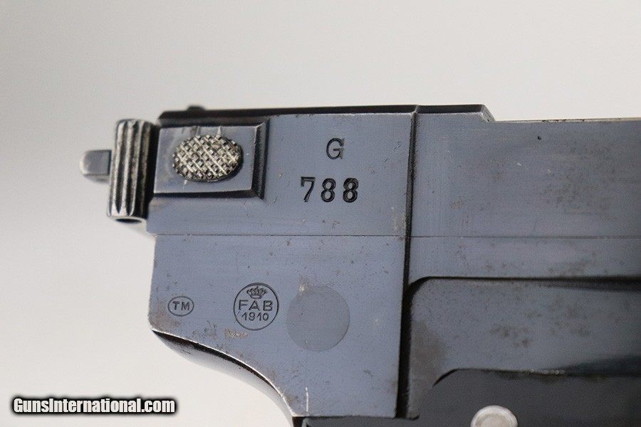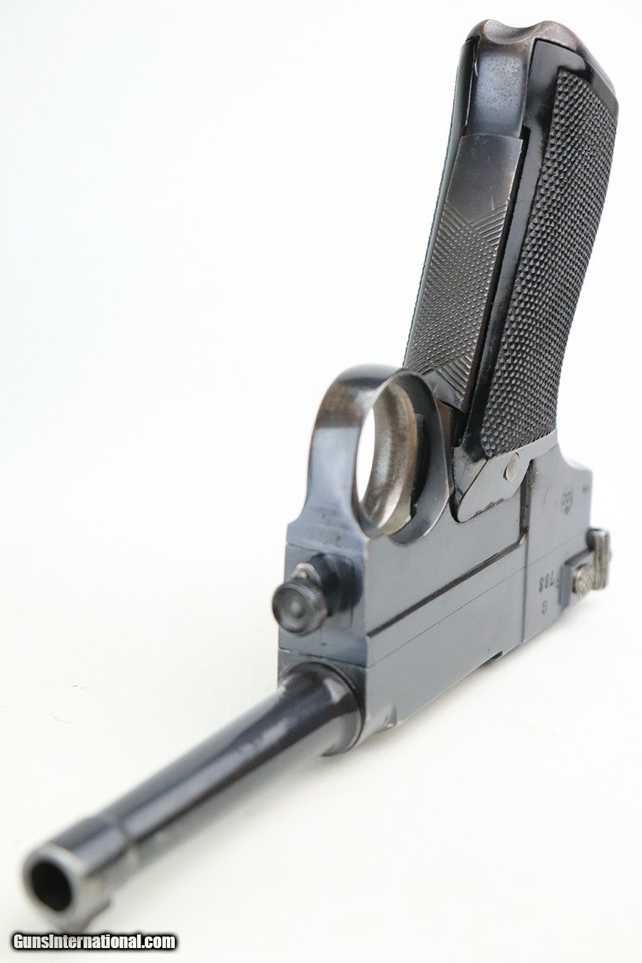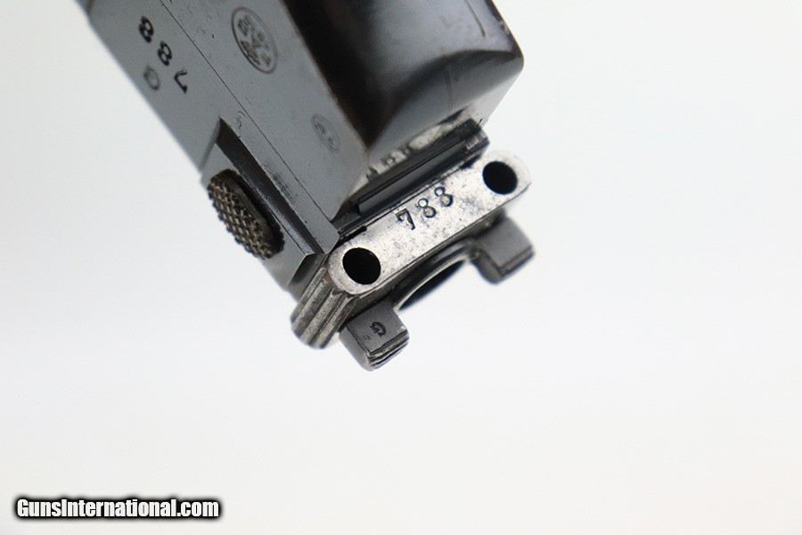 Description: This is an excellent example of an Italian Army Glisenti pistol, that is in ~97% original condition. These were very complex pistols with all machined parts and beautiful early 1900s rust blue, that proved to be very expensive to produce. These were used by all branches of the Italian army before, during and after WWI, eventually being replaced by the more durable and cheaper to make Beretta 1934-1935 pistols. Glisenti was chambered in 9mm Glisenti which was an underpowered version of the German 9mm Para cartridge. One should take care not to use 9mm Para in this gun as it can result in irreparable damage and can be dangerous to the shooter. This particular example has minimal bluing loss but does have some spotty oxidation here and there, especially on the right side of the frame. A few very light scratches here and there and some minor brown patina on the grip straps. The grips are nice, but there's some minor chipping along the top edge of the right panel. Unfortunately, there is pitting in the bore throughout. Comes with one proper magazine. SOLD Handgun Caliber: 9mm Glisenti Bore: 6/10 Condition: ~97% |