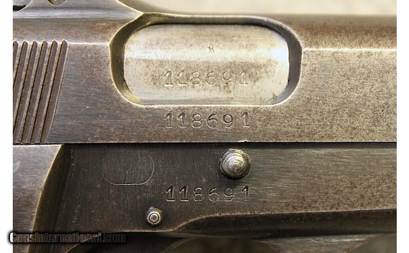 Description: This FN P35/Hi-Power chambered in 9mm Luger is in good shape. The finish has patina throughout with a bright bore, and the wood grips have no cracks or splits. 9mm Luger SOLD Metal Condition: Good Wood Condition: Great Bore Condition: Bright Barrels: 4.5 Weight: 2.1 lbs. Item Location: Hoffman Estates, IL |