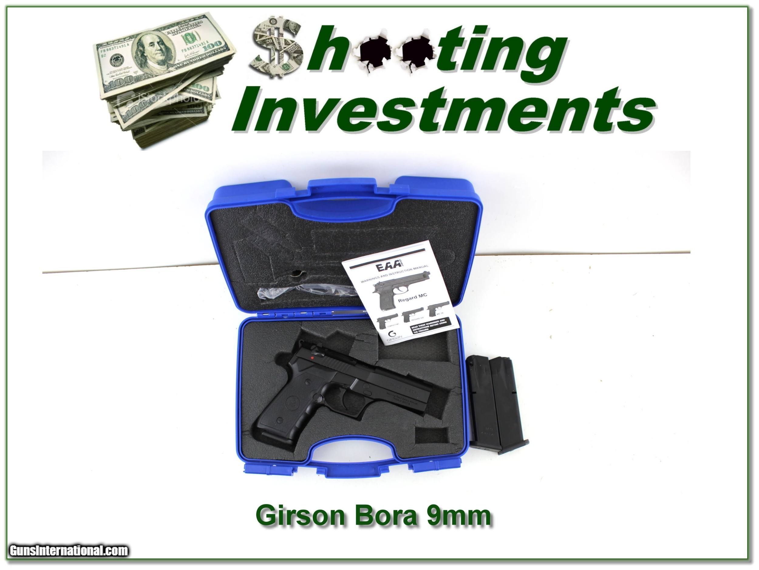 Description: This is a new and unfired Girsan Bora 9mm. It is a Turkish made 9mm and comes as seen in case with papers and 3 a8 Round magazines! I am selling this one on consignment and as such lay-a-way can’t be used. It does of course have the standard 3-day inspection. Shipping and insurance is $39. Please email me with any questions or larger pictures. (Consign your quality firearms with Shooting Investments for only 12%! Let me know if you have any you would like to sell!) 21-1303 Payment: Payment is by Money Order, Cashiers Check or Personal Check. I can now also accept Credit Cards (MasterCard, Visa, Discover & American Express) with a 3% convenience fee. Shipping: The shipping charge will be listed in each description. It is $39 for most firearms. Some heavy guns or those insured for over $2000 will be higher. Shipments to Alaska and Hawaii are higher because air shipment is required. Most firearms are shipped on Tuesday and Thursday and usually in 5 days of receipt of payment. We package all shipments carefully and insure them. Optics are shipped Priority Mail and most other non-firearm shipments are shipped First Class. Returns: Our return policy is simple. If for any reason you are not pleased with your purchase, you may return your item for a full refund of purchase price. Ammunition cannot be returned. It is important to us that you are happy. Guns cannot be fired or dissembled before returning them and they must be returned in the same condition as received. Notification of a return must occur with-in 3 days of receipt at your dealer. Shipping, convenience and dealer fees are not refundable and are the responsibility of the buyer. Lay-a-way: If needed, we offer a 60 day lay-a-way option on most firearms. It is 1/3 now, 1/3 in 30 days and 1/3 in 60 days. Lay-a-way firearm sales are final and if not completed the first payment cannot be returned. Consigning your firearms with Shooting Investments: We will help you get top dollar for your firearms. While most local guns shops charge 20% or more, our fee is only 12% with a minimum of $75. At your local gun shop it might take months to sell. Selling on-line provides instant access to thousands of interested buyers. You won’t find any other on-line dealer willing to sell your firearms for only 12% or listing every gun on 3 separate s. Selling through an House typically costs the seller 15% and the buyer an addition 15% (so 30%) and you have to wait several months to sell and longer to receive funds. If properly priced, we will sell your firearms in a few weeks. Send us an email or give us a call and we’ll explain how easy it is for you to get top dollar. Trading: Trading for use is really just buying your gun to re-sell. If you have a gun you want to trade, please email a picture and we will let you know what we can give or it. You will always get more if we sell it for you on consignment. Help for California Buyers: We are happy to ship to California. It is the buyer’s responsibility to make sure any item you buy is legal in your state. We are also happy to help with your purchase of a firearm from someone other than us. If you see a gun you would like to buy but the seller can’t or won’t ship to California they can ship to use and we’ll then ship it to your California dealer. The cost for this service is only $30 + shipping. Let us know if we can help! SOLD |