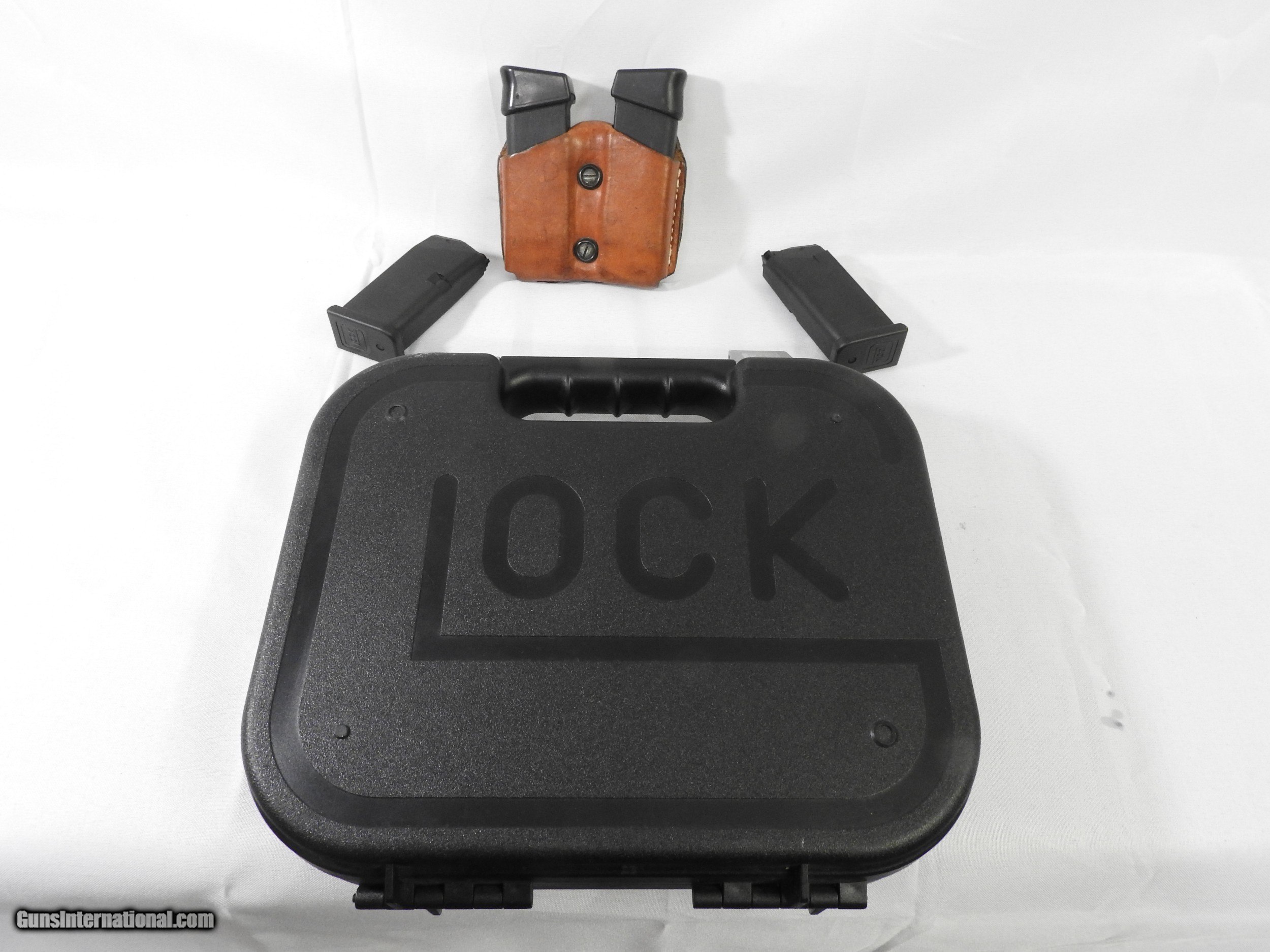 Description: With a compact size that's easy to conceal and compatibility with full-size parts and magazines, the Glock 26 was built from the ground up with concealed carry in mind. Flush-fit magazines pack a standard capacity of 10 rounds, but this "Baby Glock" can take any magazine it's full-size brethren can. With Glock's legendary reliability and Safe-Action trigger, you can carry this sub-compact with confidence. THIS GUN IS USED And in excellent condition. This package comes with (3) 10 round extended magazines (2) regular magazines 10 round. a tan leather magazine holster that fits (2) magazines. safety lock, Glock cleaning brush kit, It also has the slide catch upgrade, " Extended release button " And comes with the original hard case. SHIPPING Please request my shipping restrictions by email before ordering and know your state and local restrictions.