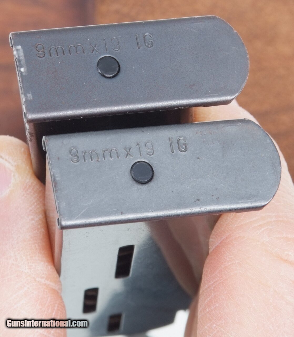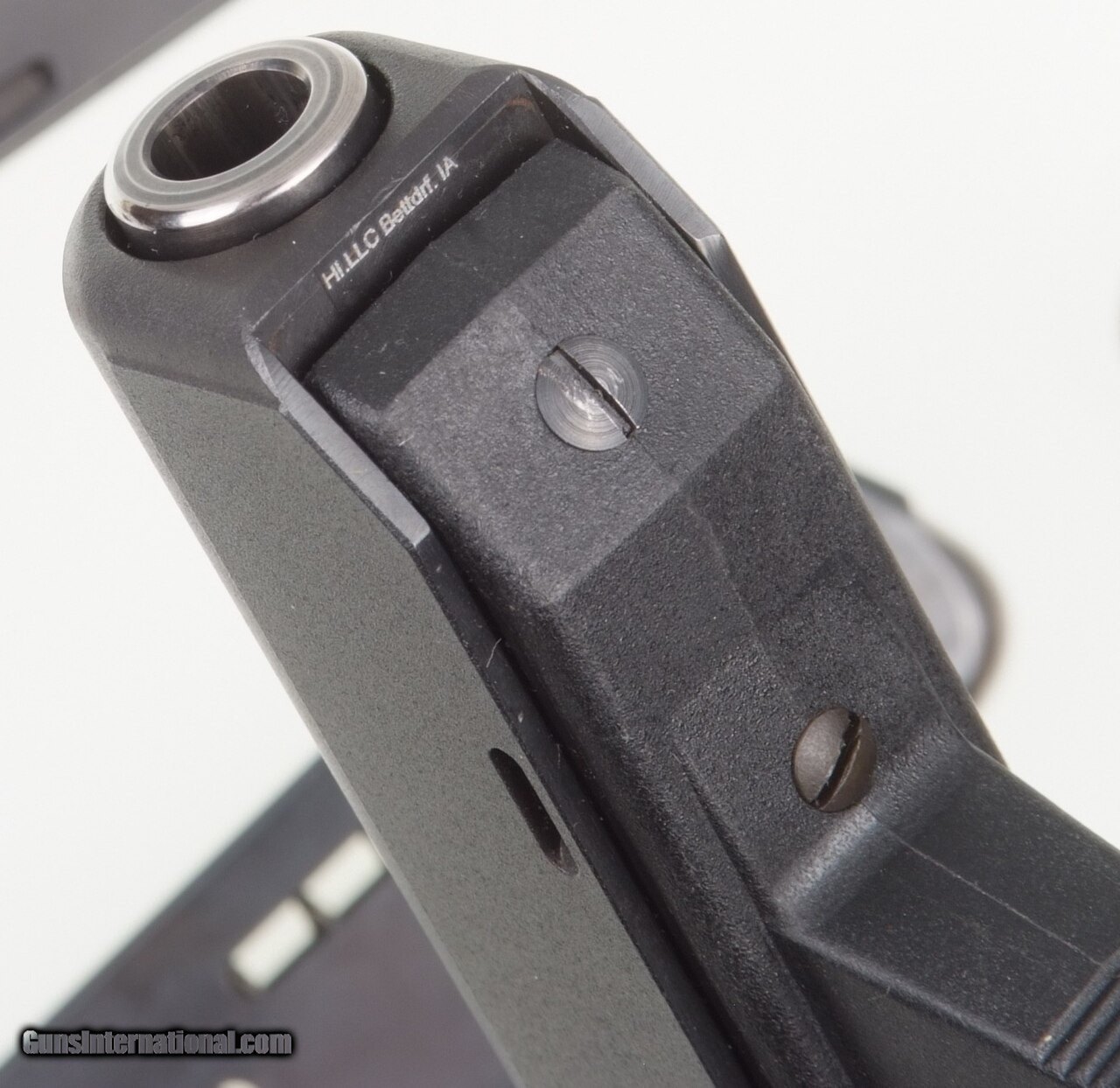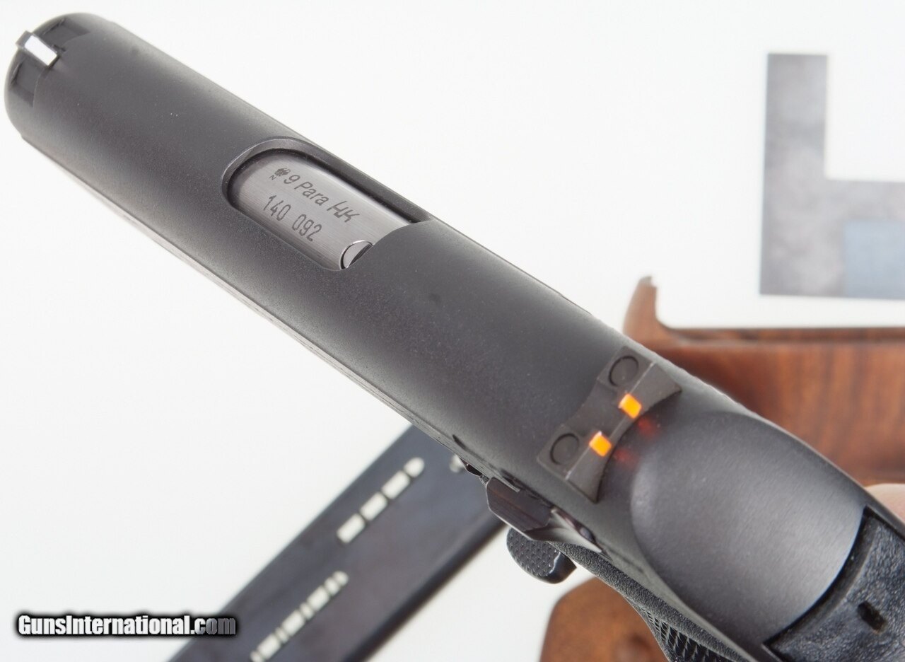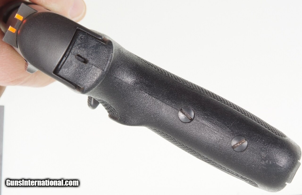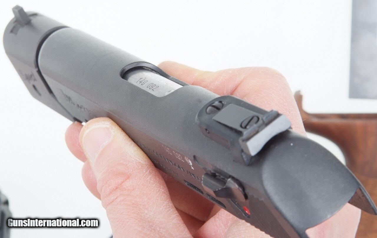 Description: Phenomenal, as new H&K with matching sport conversion unit, target grip, spare grip screws and magazine. SN: 140092. Cal: 9mmP. Standard configuration P9S with 4.25 inch barrel, drift adjustable highlighted sights. Left side of slide with manufacturer address along with patent and full serial number that is repeated on the left side of the frame. Right side of frame coded “IH”. Top of the barrel hood marked with caliber and matching SN. Polymer grip with molded checkering on each side and secured to frame with two slotted screws on spine. Sport unit has adjustable sight slide assembly marked identically and fitted with matching front sight counterweight marked “Sport 092”. Ergonomic orthopedic contoured and textured single piece wood grip secured with two separately included screws. Magazines are each marked with caliber and coded “IG” on floorplate. Imported in unmarked manilla cardboard box that has no internal compartments. Condition: The pistol and Sport slide assembly are virtually new. No sharp edge wear or marks on the primary grip screws. Wood grip, near new, but with darkening of the textured areas. Magazines excellent, one with light insertional wear, the other as new. A rare opportunity to buy an “as new” P9S with matching Sport conversion, orthopedic grip and spare magazine. NOT C&R eligible. A HISTORIC INVESTMENT! Check out our . #I-439 Buyer pays $40.00 shipping SOLD Manufacturer: H&K Model: P9S |