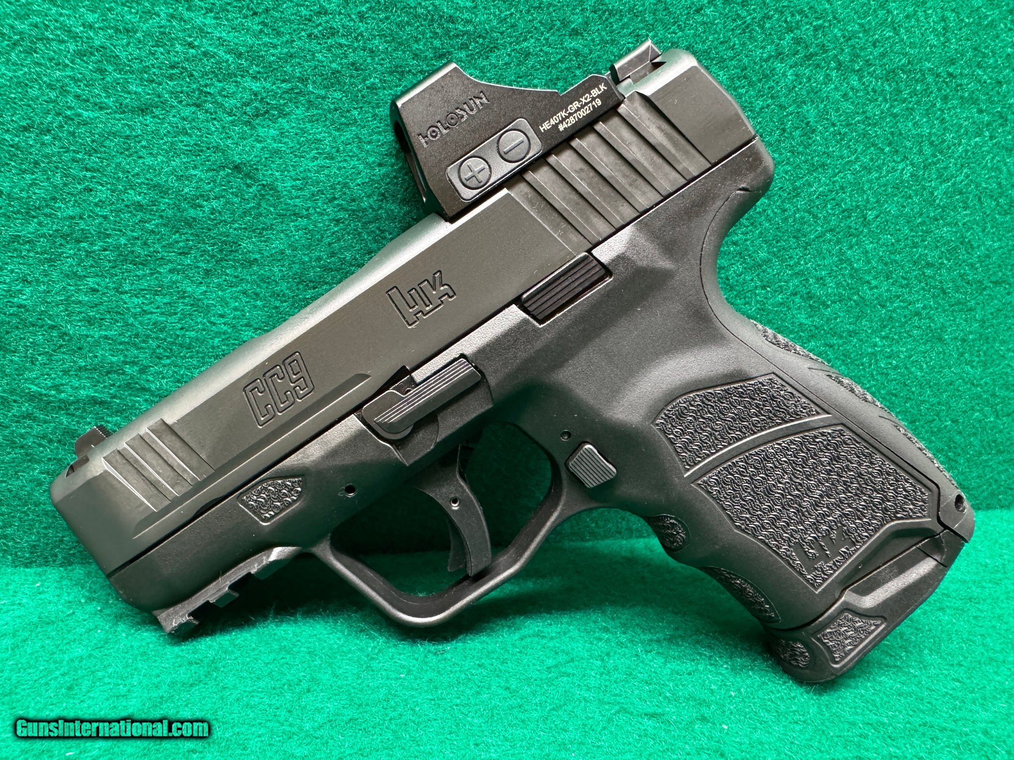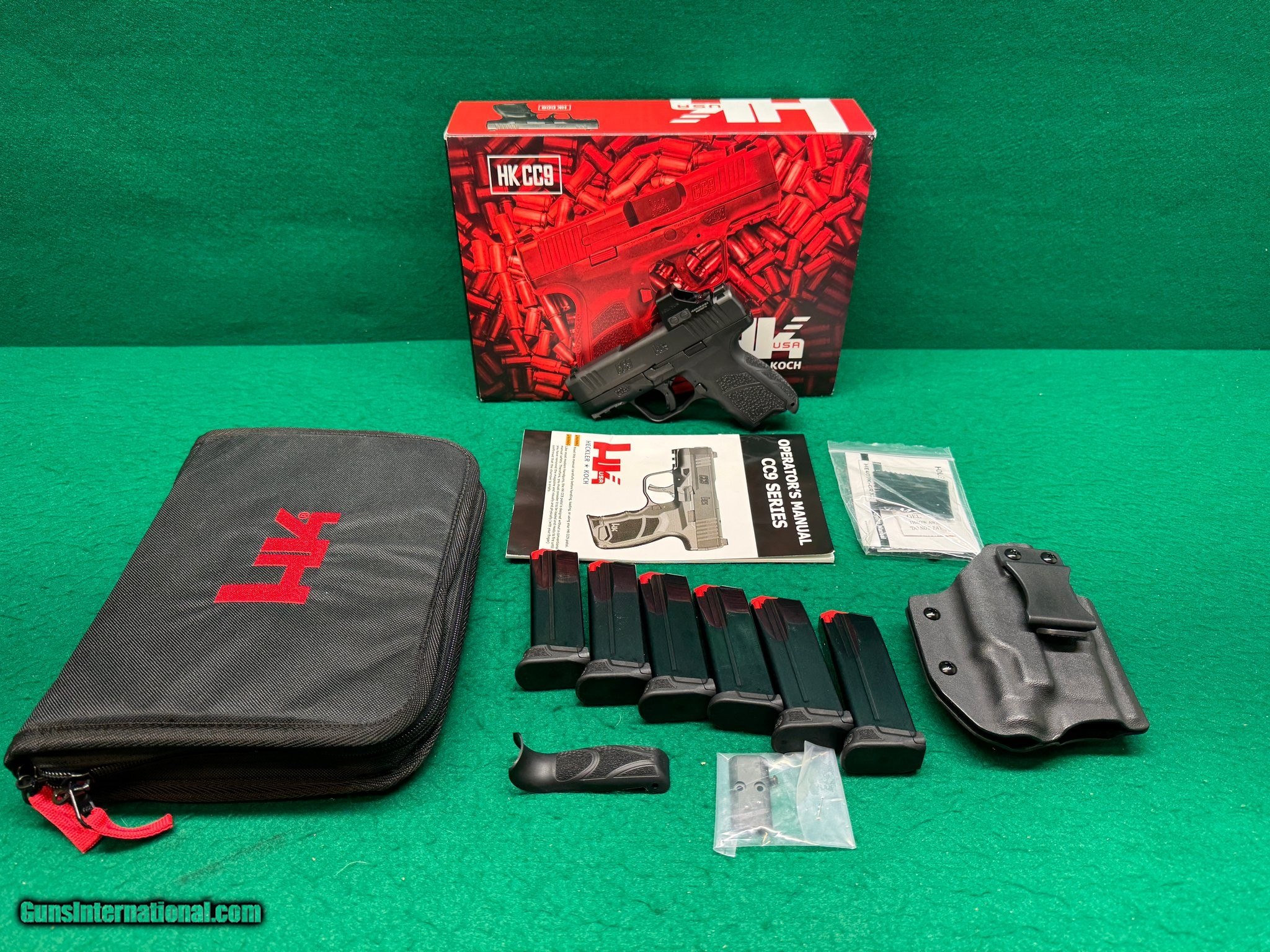 Description: Guns Listing ID: 595514 This listing is for a USED HK CC9 9mm Black Finish Holosun 407k Green Dot 3.32\" BBL 10/12+1. This is a used gun, it has been fired and will have residue present. This HK CC9 is chambered in 9mm. One of the magazines will hold 10 rounds, and the other magazines will hold 12 rounds. This pistol comes with a 3.32 inch barrel. It comes equipped with a fixed front sight, a fixed rear sight, and a Holosun 407k green dot sight. There is a small scuff mark on the left side of the slide next to the front serrations. The action appears to be in good condition, the finish appears to be in good condition, and the bore appears to be in good condition. This pistol comes with one 10 round magazine, five 12 round magazines, an extra backstrap, an IWB holster, an owner’s manual, and the cardboard box. The pistol will sit loose in the holster since the holster is meant to fit the pistol along with a light attached to it. It is unknown which light the holster was meant for. This would be a great concealed carry pistol. ** DISCLAIMER** THIS FIREARM HAS NOT BEEN TEST FIRED*** Manufacturer: HECKLER & KOCH Model: CC9 Caliber Info: 9MM LUGER (9x19 PARA) Condition: Used - Non-Certified Barrels: 3.3" BARREL Action: SEMI AUTOMATIC Finish: black Weight: 1.225 LBS. Price: $739.99 Contact Seller |