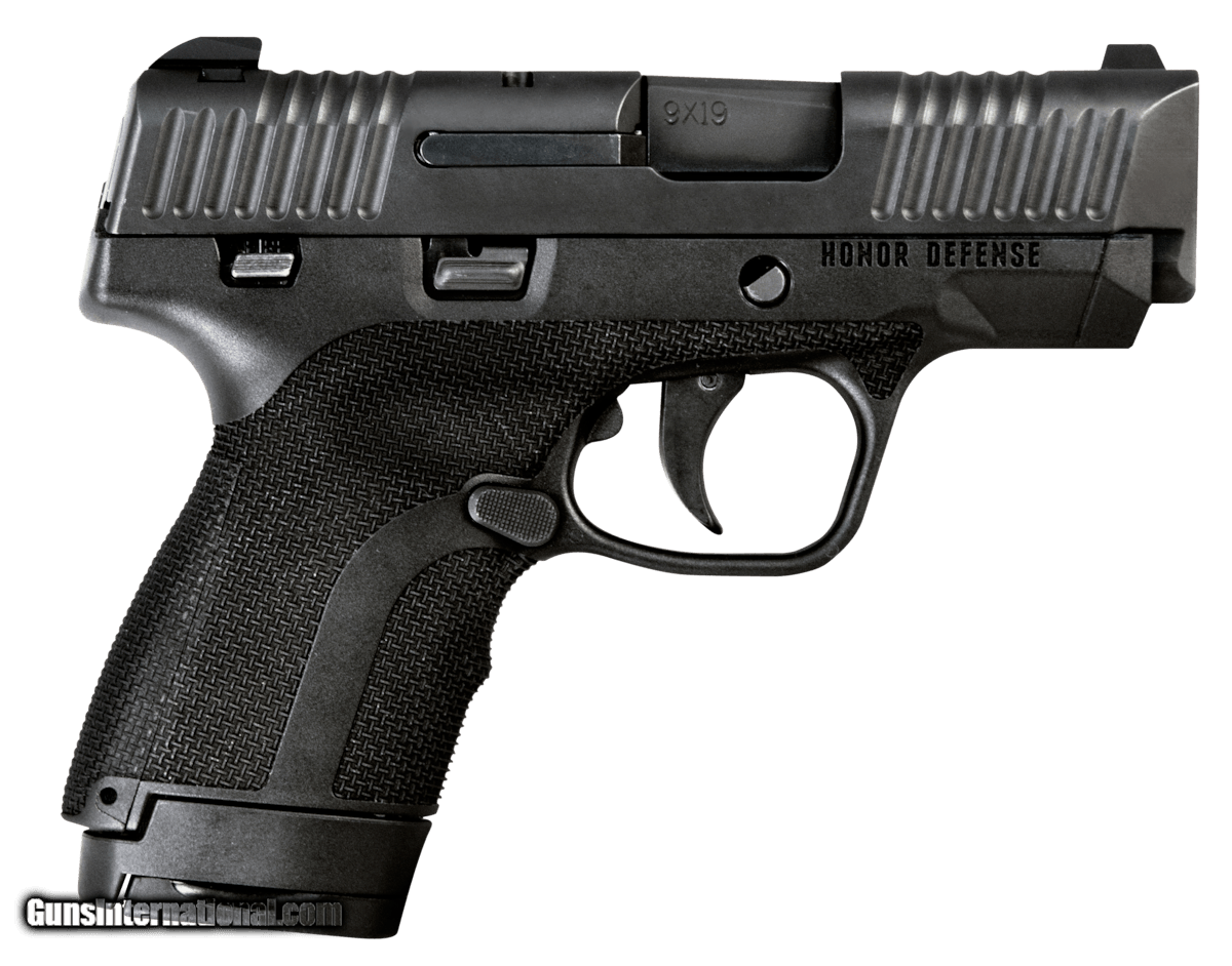 Description: Guns Listing ID: 661569 The Honor Defense Honor Guard is a semi-automatic handgun chambered in 9mm. This compact lightweight pistol is made in America and assembled by veterans using only materials sourced in America. Features include ambidextrous slide catch and magazine release tool-free takedown snag-free sights textured grips as well as top and side serrations. The Honor Guard also has a crisp trigger break and short reset. The single stack magazines are available in 7- and 8-round capacities and every pistol is test fired with a P load. Accurate comfortable and reliable the Honor Guard is a suitable choice for concealed carry. SOLD Manufacturer: HONOR DEFENSE Model: HONOR GUARD SUB-COMPACT Caliber Info: 9MM LUGER (9X19 PARA) Condition: new Barrels: 3.3 BARREL |