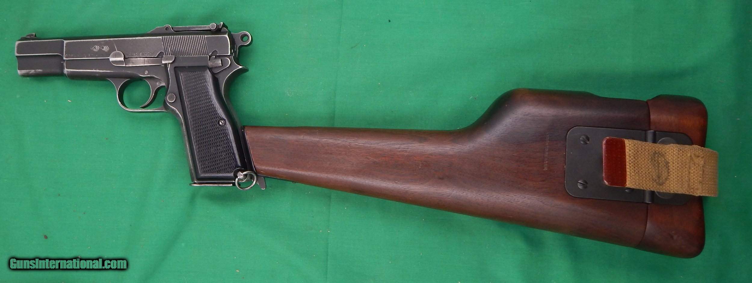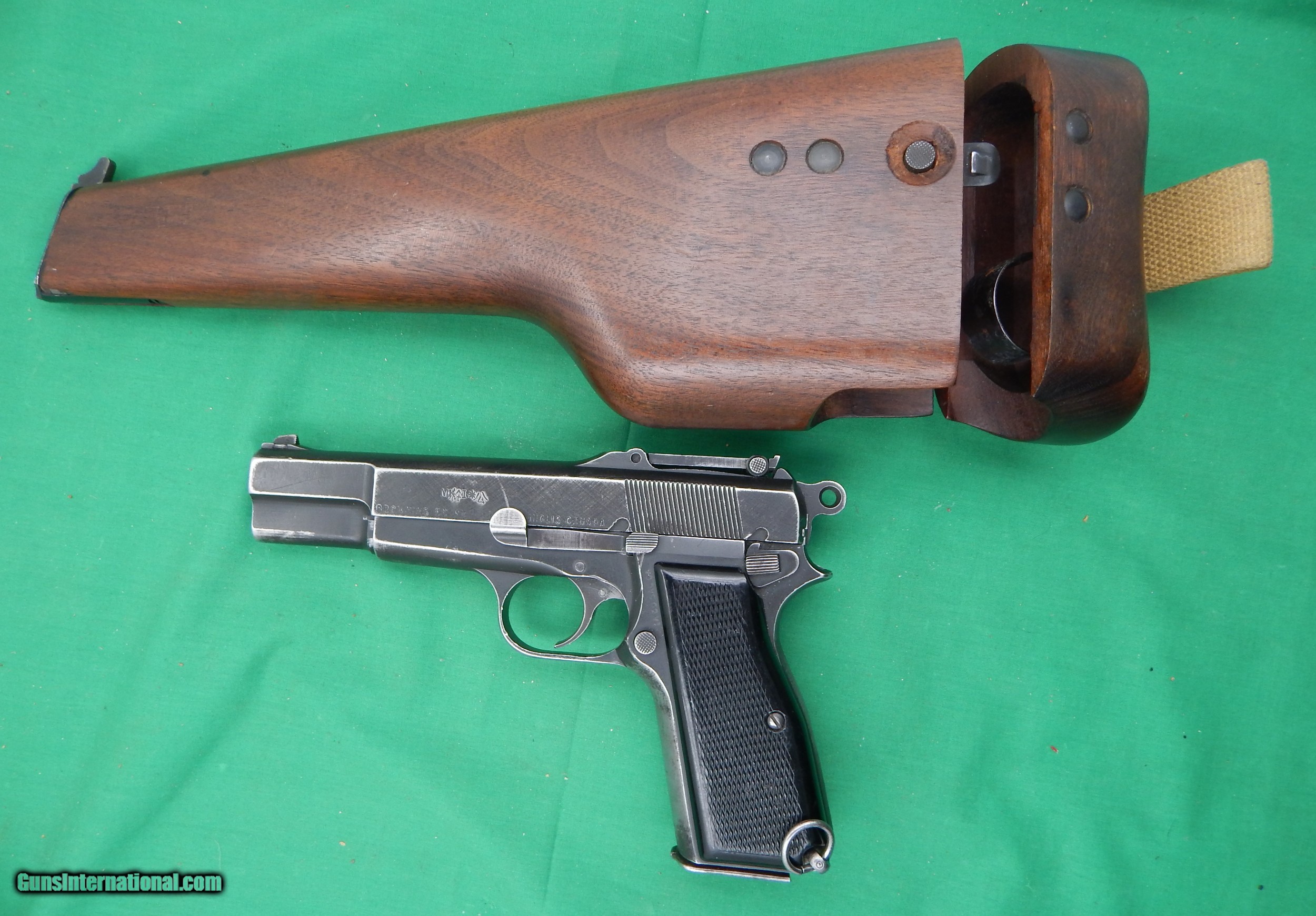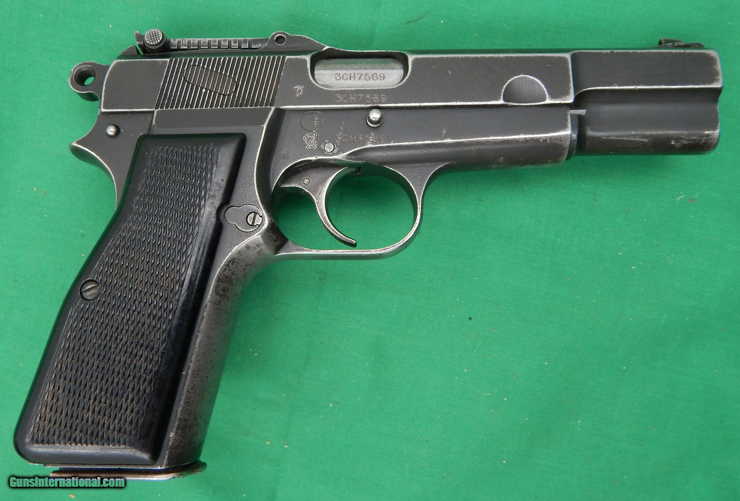 Description: Browning FN 9mm HP Inglis Canada with Chinese Markings and Wood holster stock stamped "Made In Canada" and S.A.LTD dated 1945. Canvas belt loop with attachment, there is some inked markings on the loop but it is not ledgiable . The Mk 1 stamp is overstamped with the Chinese markings. Overall finish is a black/blue missing in the high spots and in the finger grip area, very good hard Rubber Checkered grips, laynard ring on the left side of the bottom of the grip. Comes with one,original magazine, Has the Tangent rear sight, Very good bore.and the wood stock is in excellant condition MO plus FFL or C&R License required with $24.50 shipping. SOLD Curio/Relic: Yes Manufacturer: Inglis, Canada Model: M 1 Hi-Power Serial Number: 3CH7569 |