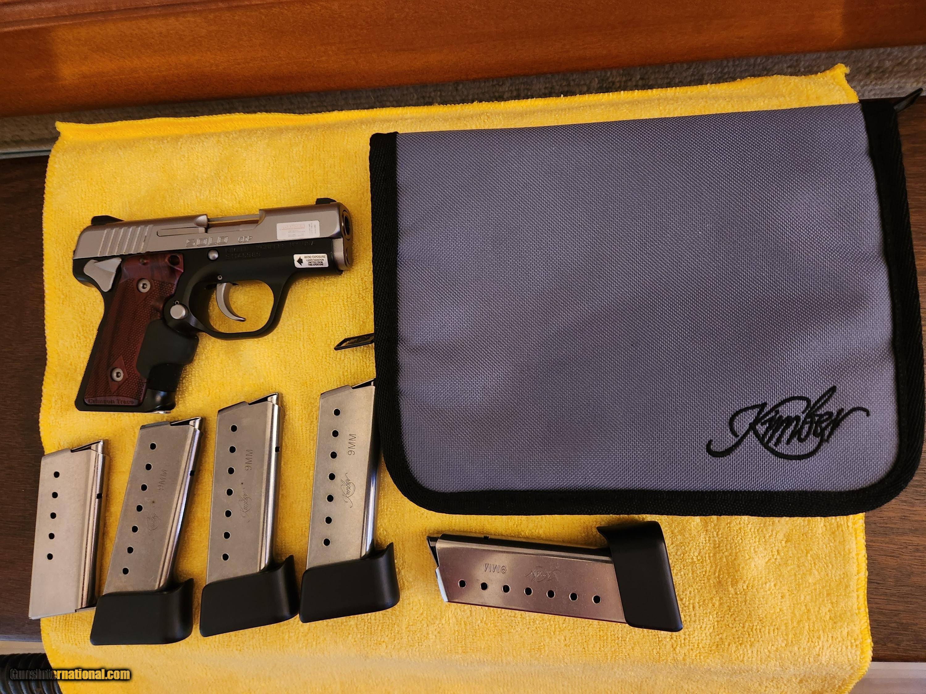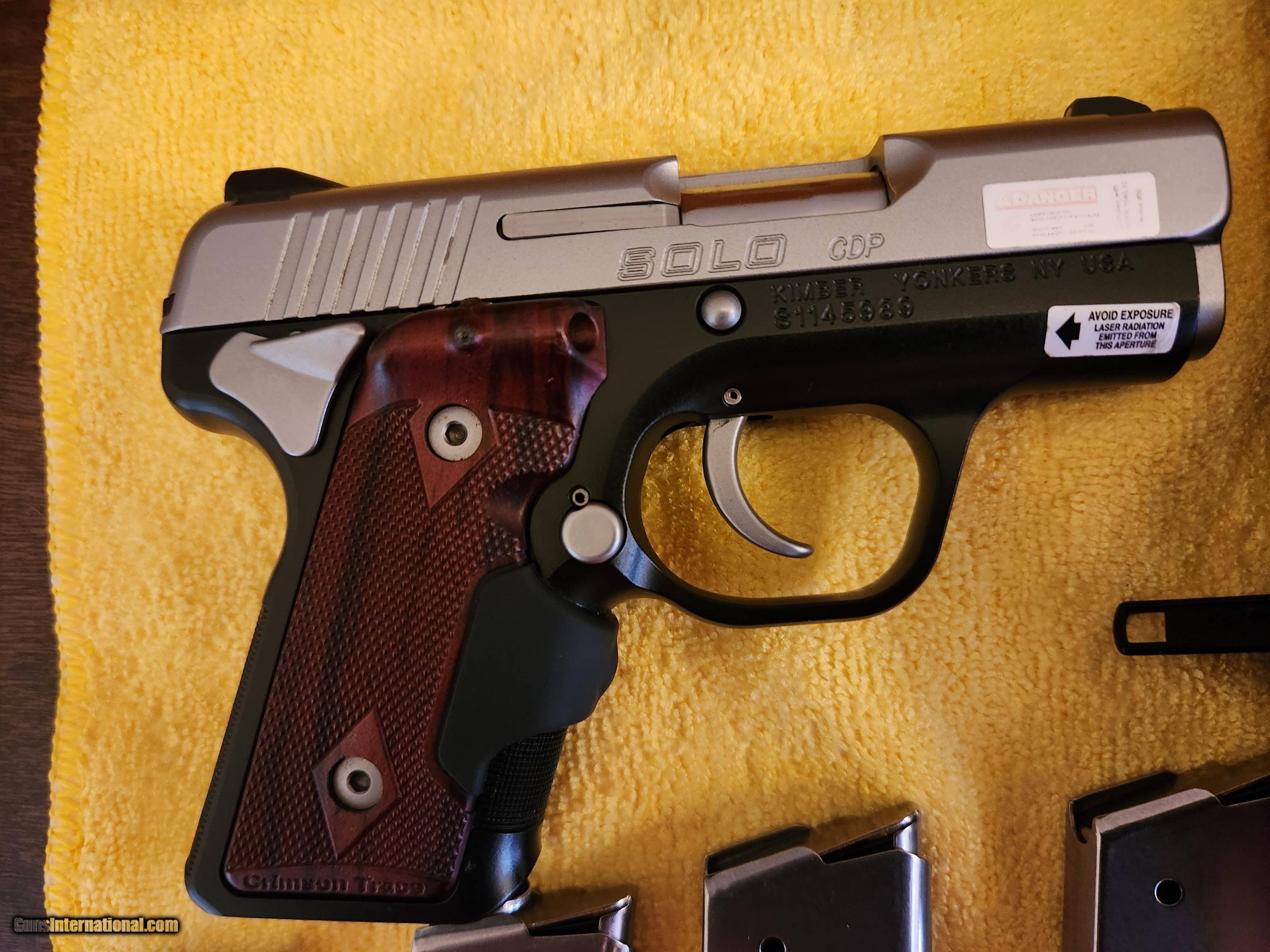 Description: For sale is a brand new in the box, never fired Kimber Custom Shop Solo CDP 9mm with factory Crimson Trace Laser grips. This is a ultra-compact, lightweight, pistol ideal concealed carry gun. The Solo has a stainless barrel, matte Stainless Steel slide with matte black aluminum alloy frame, ambidextrous thumb safety levers, 3-dot Tritium night sights, stainless guide rod, checkered front- and backstrap, rosewood Crimson Trace laser grips. Comes with the original 2ea 6-round magazines and 4ea extended 8-round magazines purchased directly from Kimber. This is new unfired condition Solo as you can on the photos. SOLD Handgun Caliber: 9x19mm Parabellum (9mm Luger, 9x19mm NATO) Manufacturer: Kimber Model: Solo Serial Number: 81145989 Barrel Length: 2.7 Condition: New Metal Condition: New Bore Condition: excellent |