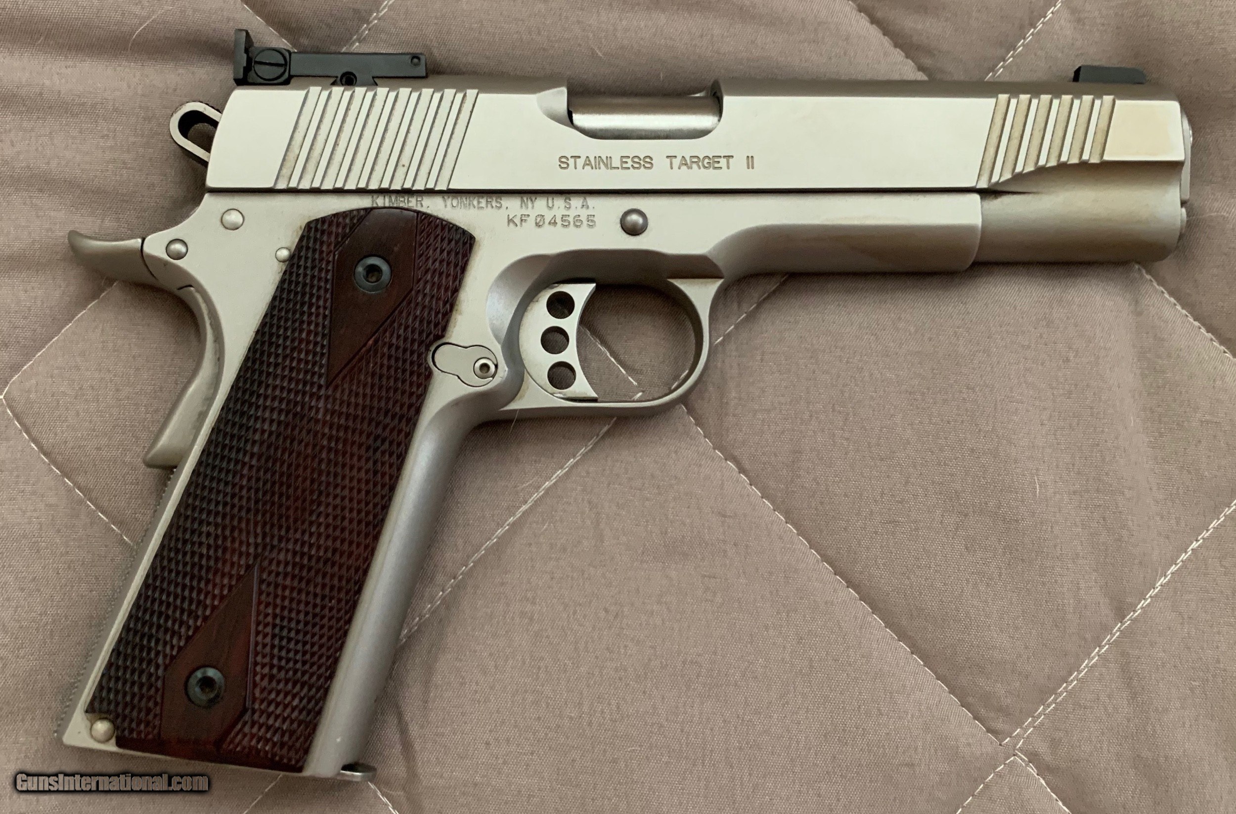 Description: Make: Kimber Model: Stainless Target II Serial Number: KF04565 Year of Manufacture: 1998-Present Caliber: 9mm Action Type: Single Action SA Semi-Automatic Pistol with Detachable Magazine Markings: The right side of the slide is marked “STAINLESS TARGET II”. The right side of the frame is marked “KIMBER KF 04565" behind the slide stop pin and “YONKERS NY USA” in front of the slide stop pin. The top of the barrel visible through the ejection port is marked “9MM”. The left side of the slide is marked “Kimber”. Barrel Length: 5” Sights / Optics: The front sight is a blade with a serrated rear face and is dovetailed to the front of the slide. The rear sight is a square-notch Bomar-style target sight with a serrated rear face and is adjustable for windage and elevation dovetailed to the rear of the slide. Stock Configuration & Condition: The grips are with smooth and checkered portions. The grips have no major defects, just light handling wear. The grips rate in mint condition. Type of Finish: Stainless Steel Finish Originality: Original Bore Condition: The bore is bright and the rifling is sharp. There is no erosion. Overall Condition: This gun is easily 99% of its metal finish. There is no notable wear or damage, not any visible operational and handling wear. The grip screws are undamaged. The markings are clear. Overall, this pistol rates in near mint condition. Mechanics: The action functions correctly. The slide to frame fit shows barely any movement. The trigger is crisp. As with all used firearms, a thorough cleaning may be necessary to meet your standards. Our Assessment: For 40 years, Kimber has been producing some of the finest 1911-style pistols in America and this is no exception. The Stainless Target II comes from Kimber packed with features such as front and rear slide serrations, extended beavertail grip safety, full-length stainless guide-rod, extended thumb-safety, skeletonized hammer and trigger, adjustable target sights, and of course, Kimber quality. This example is in Excellent condition showing little sign of use, likely more from handling than actual firing and comes in its original box. This is a beautiful gun in high condition and would make an excellent addition to any collection, but where it will really shine is in competition shooting such as single-stack division in USPSA or Steel Challenge. Please see our photos and good luck! Buyer pays shipping SOLD |