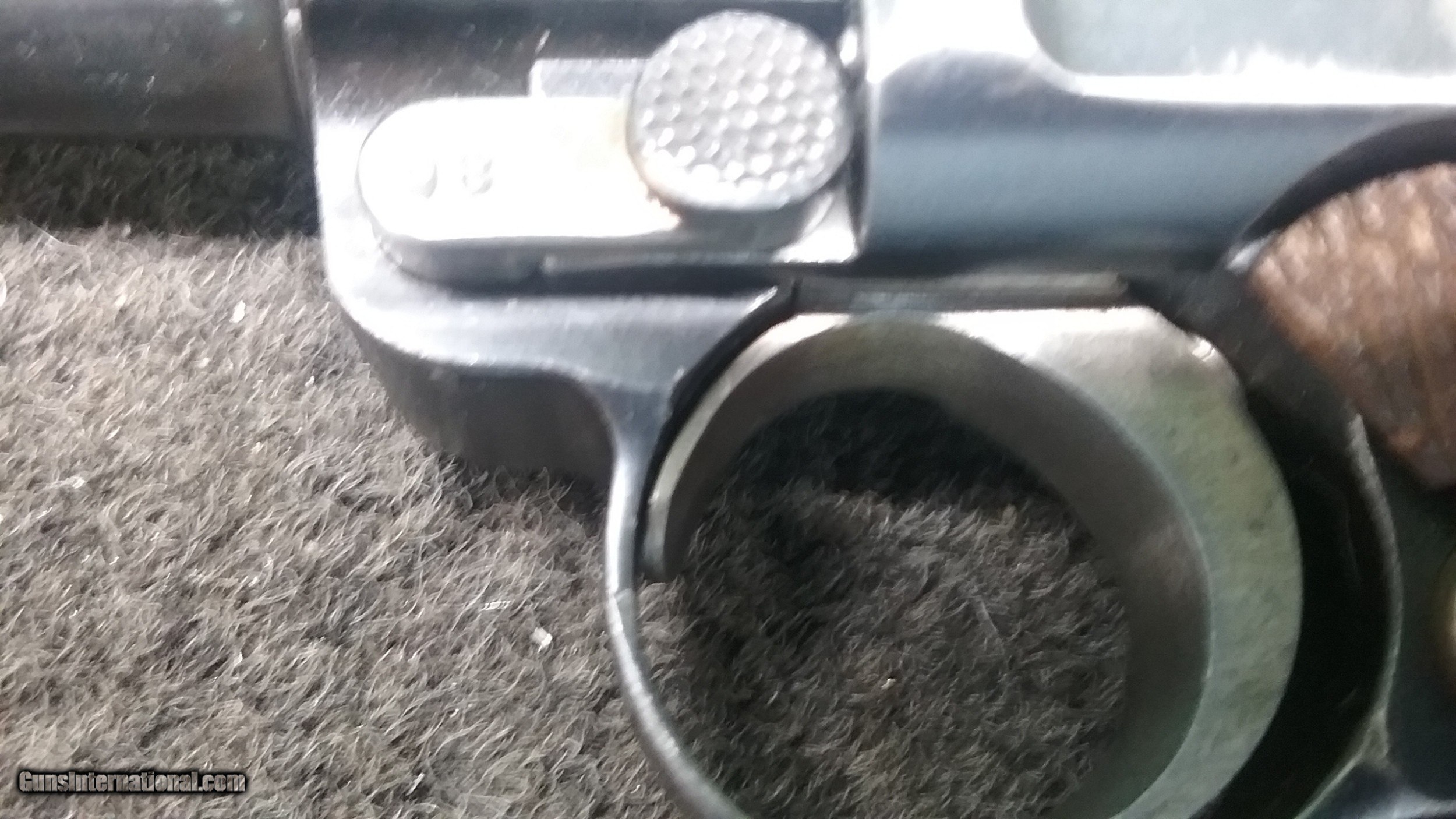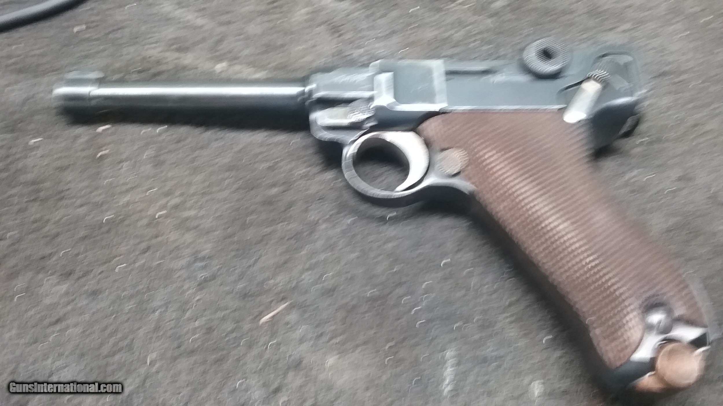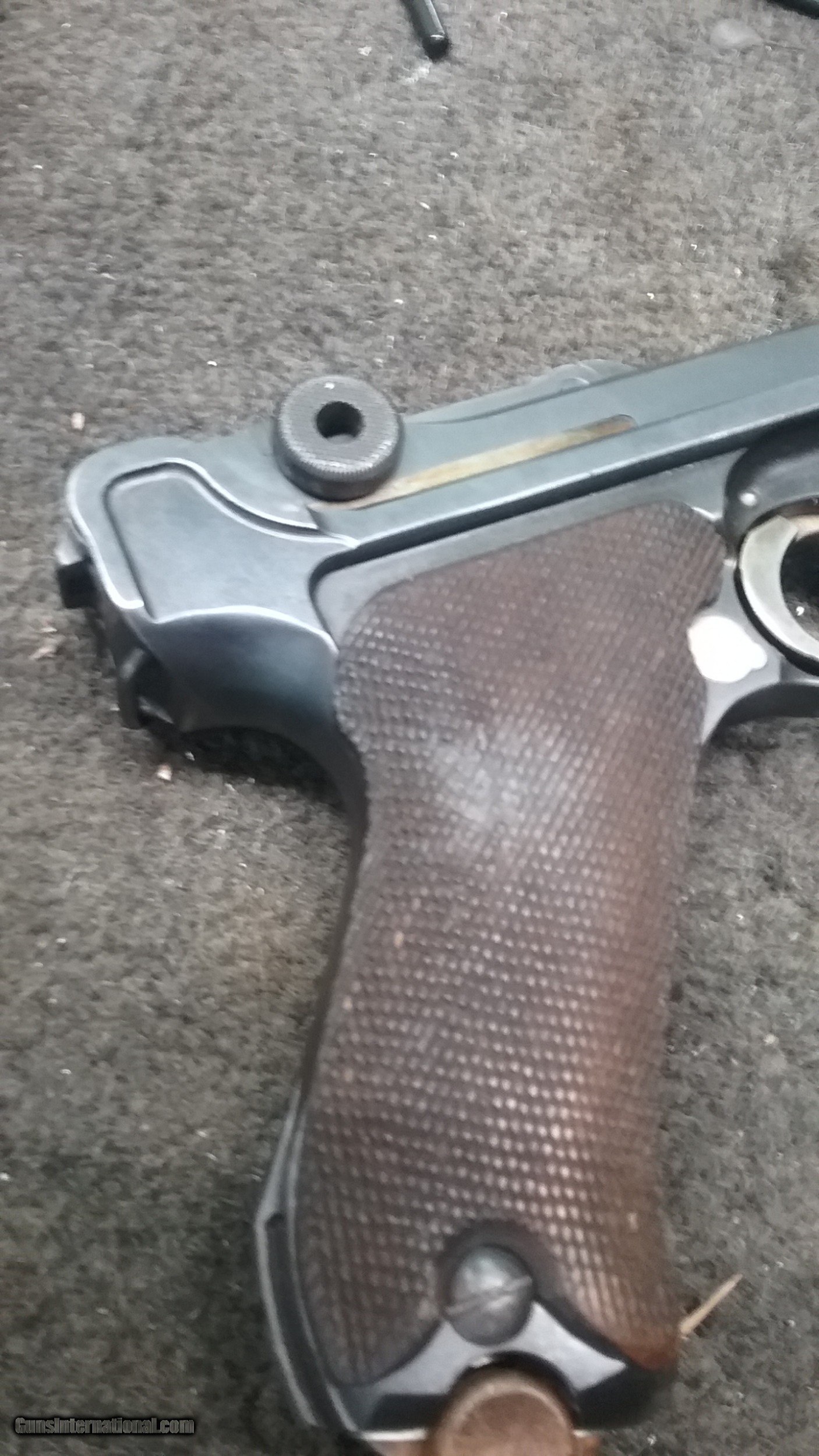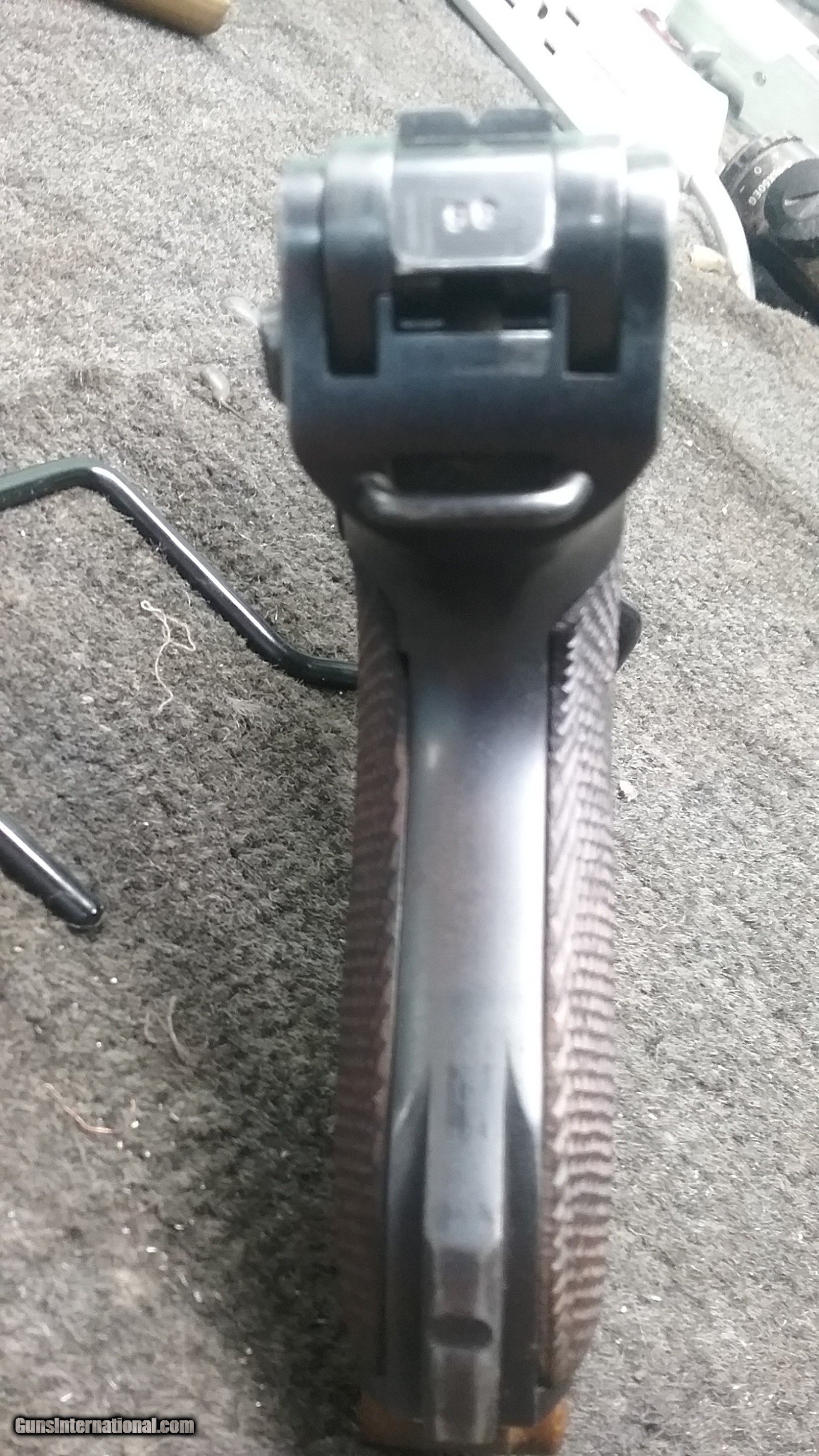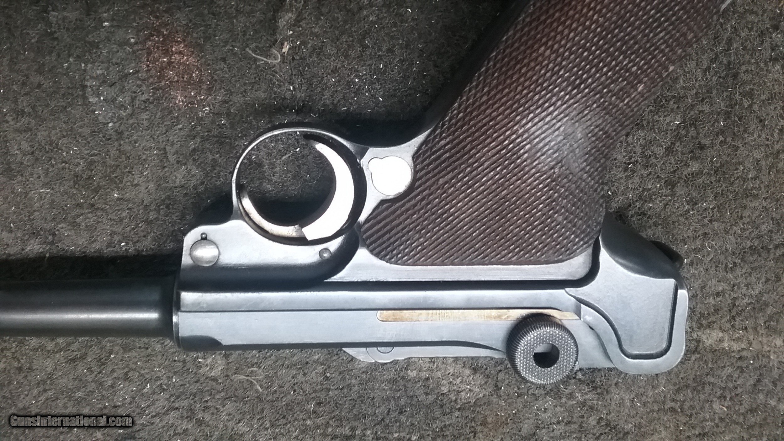 Description: This luger was taken off a nazi officer in ww2. The holster has the nazi bird on it. It has the Obendorf crown u proof on the side. There are no nazi markings on the gun, just the holster. The chamber is marked 1938. The bore is excellent and the gun functions well. Even the grip shows that this pistol was carried extensively by a lefthanded man, as shown by the right grip, the rest of this pistol shows very little wear from firing. The holster still has the last round in the top. The leather is pliable and in good shape. How this firearm got in this holster with a german officer is the mystery. Maybe he lost his issue weapon? Maybe it was taken? This however the gun that came across the atlantic in this holster is in very good to excellent condition and a great addition to anyones collection. Straw bluing is evident on the trigger, take down lever, extractor and mag release. Some of the numbers have been filed but are still readable, as was the practice as the war ended. the Shipping is 35.00 SOLD Curio/Relic: Yes Manufacturer: Mauser Model: Luger Serial Number: 5798 Metal Condition: very good Wood Condition: good Bore Condition: excellent Triggers: straw blue |