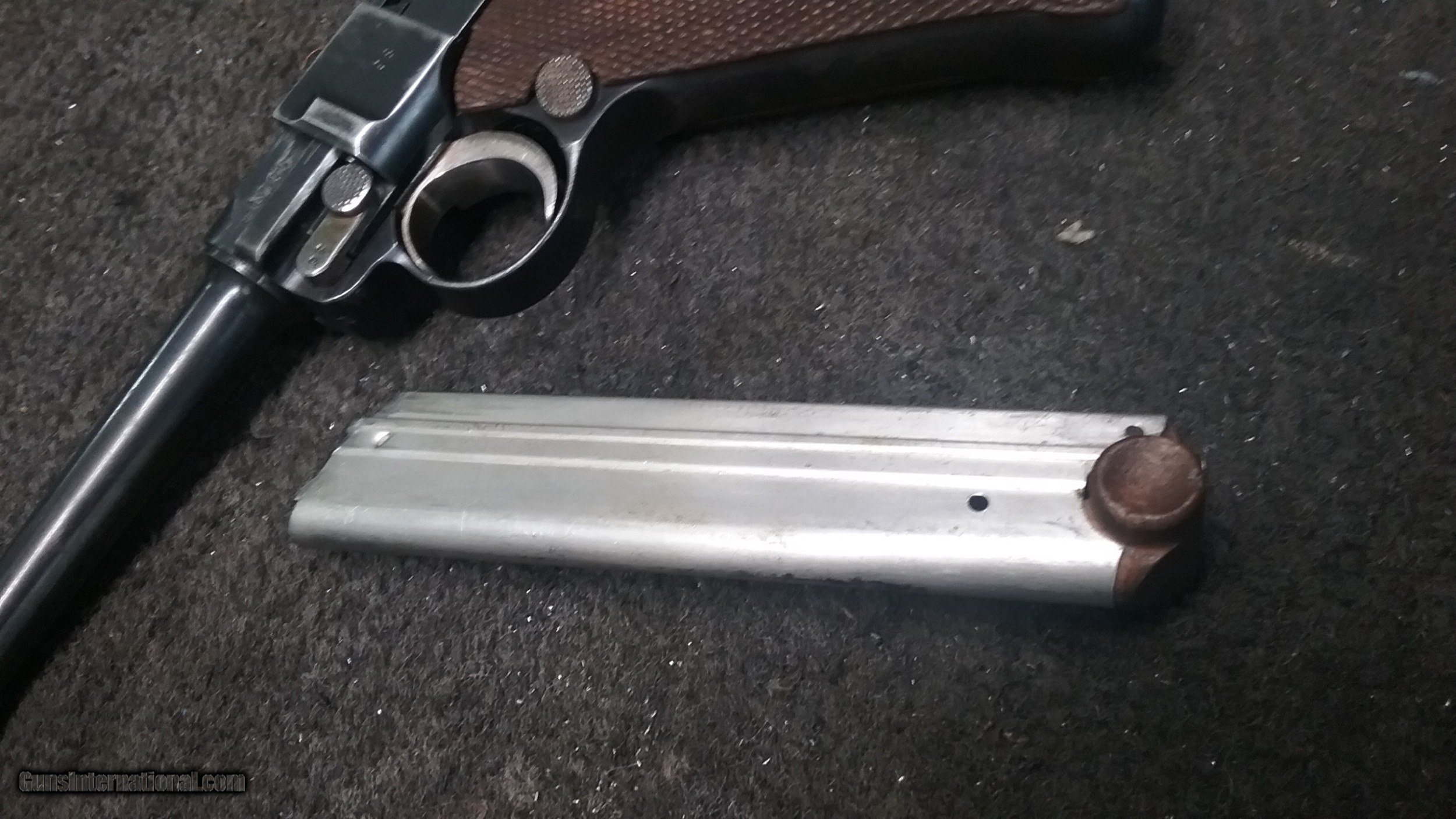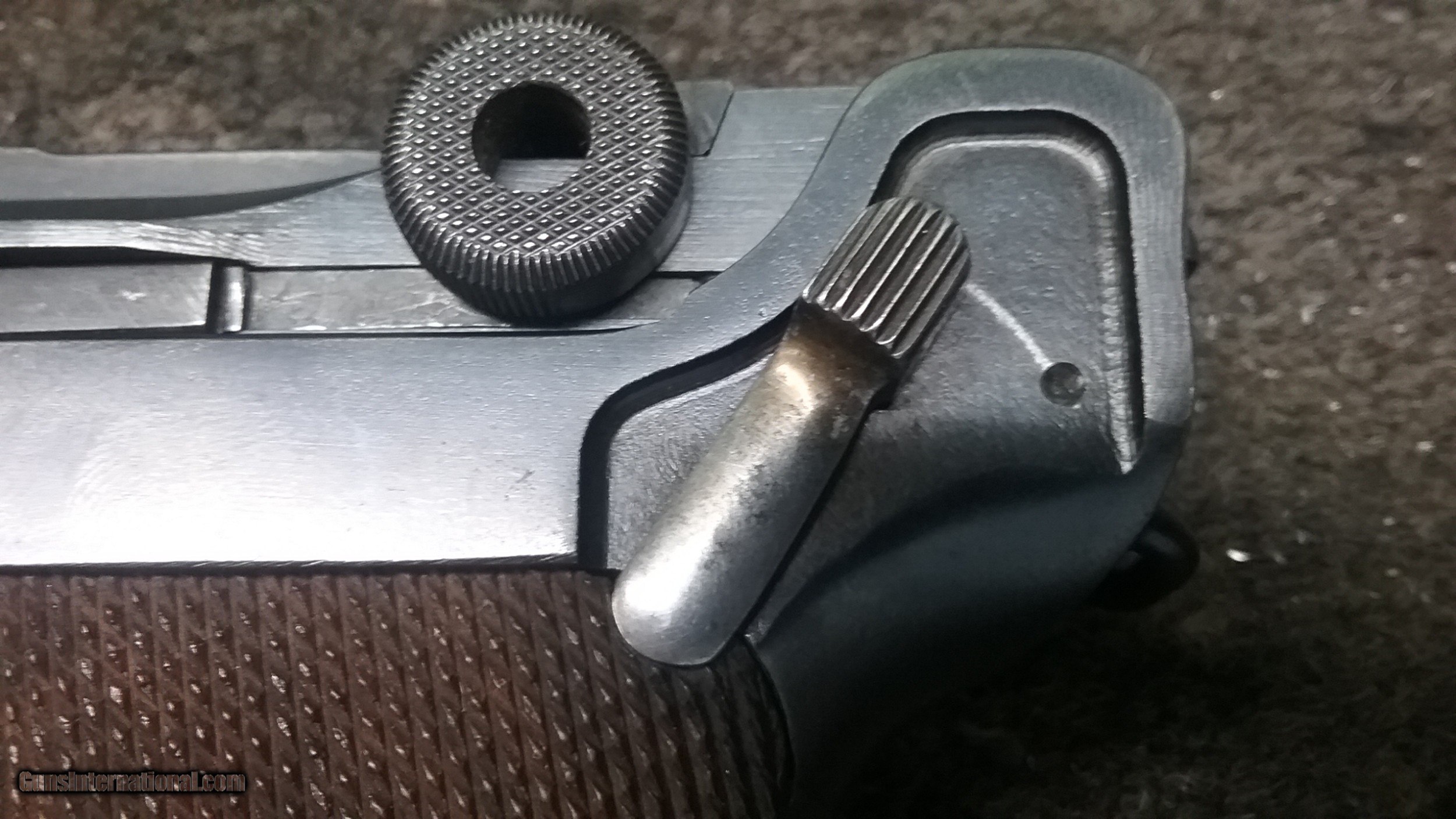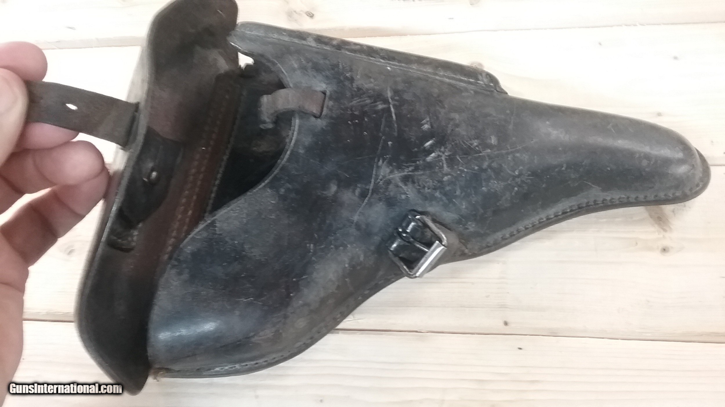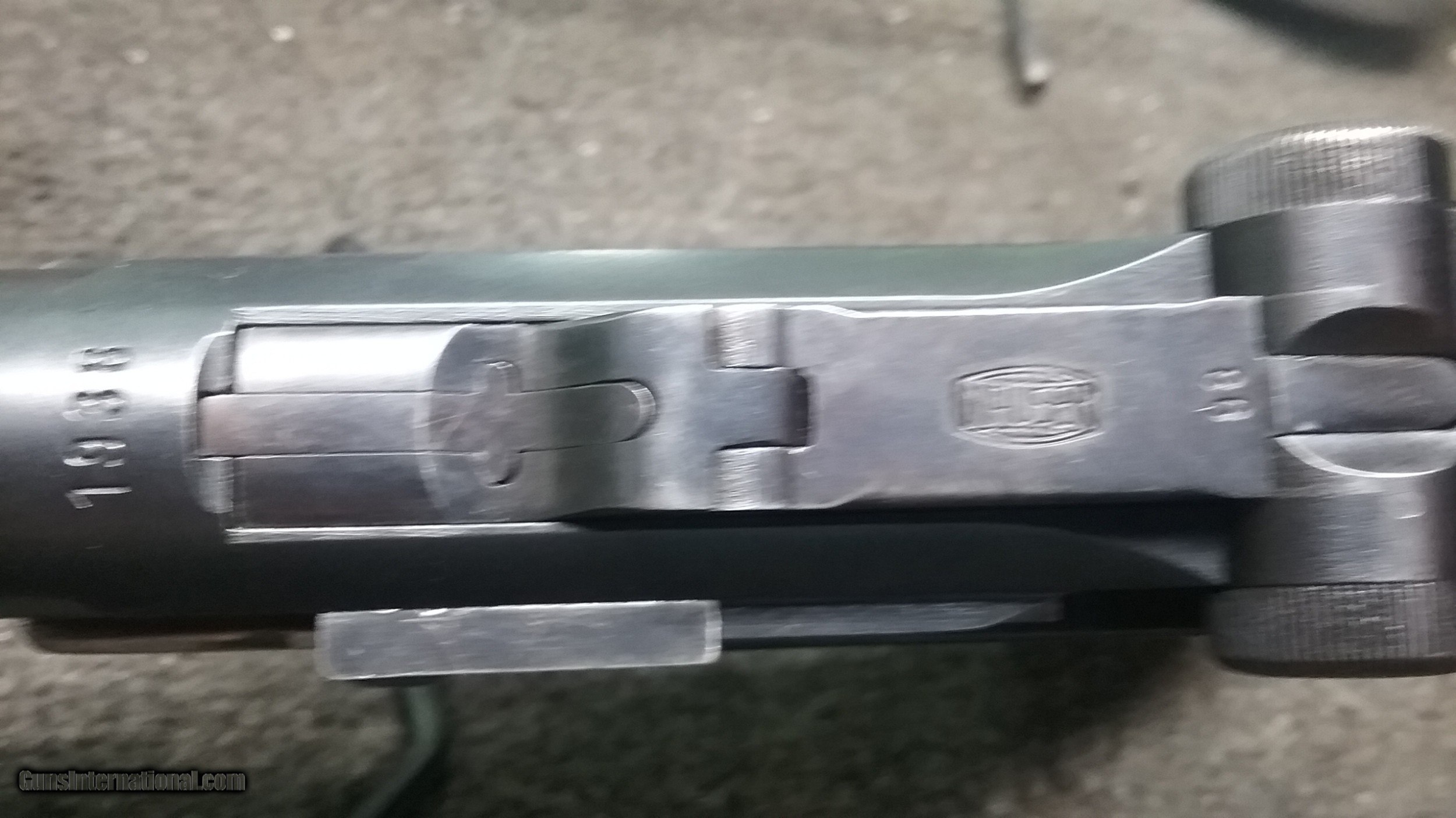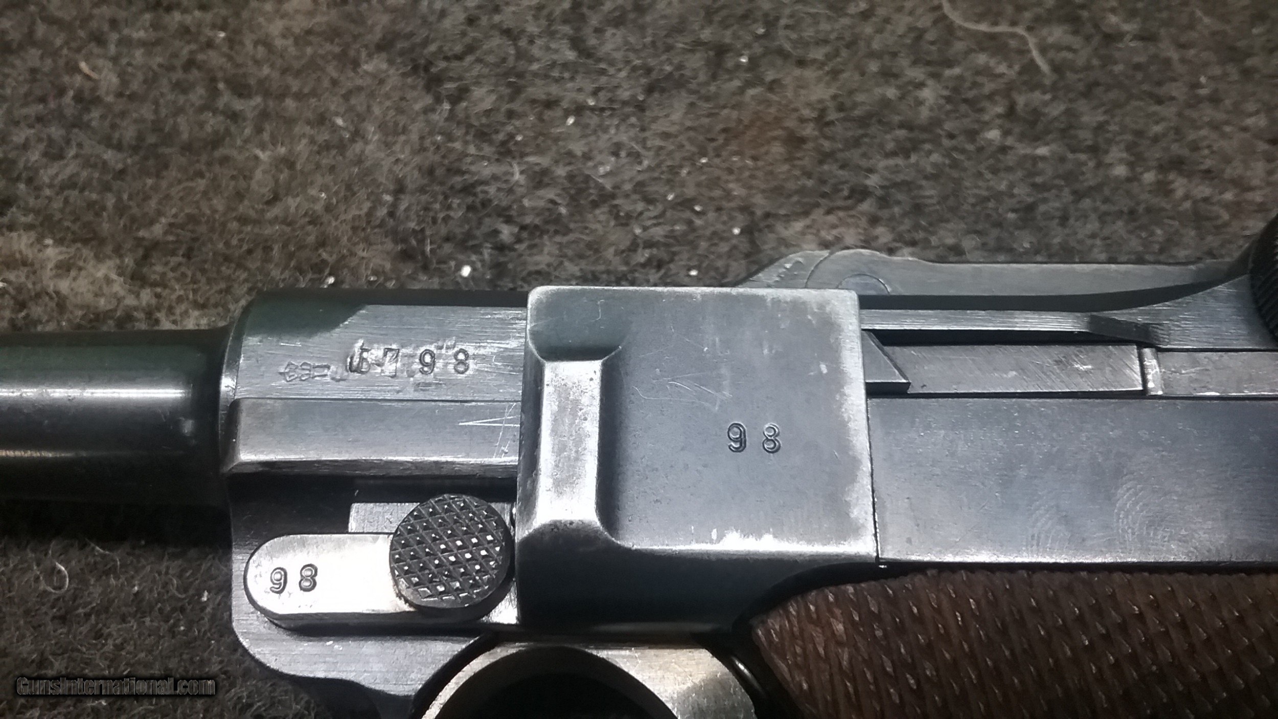 Description: This luger was taken off a nazi officer in ww2. The holster has the nazi bird on it. It has the Obendorf crown u proof on the side. There are no nazi markings on the gun, just the holster. The chamber is marked 1938. The bore is excellent and the gun functions well. Even the grip shows that this pistol was carried extensively by a lefthanded man, as shown by the right grip, the rest of this pistol shows very little wear from firing. The holster still has the last round in the top. The leather is pliable and in good shape. How this firearm got in this holster with a german officer is the mystery. Maybe he lost his issue weapon? Maybe it was taken? This however the gun that came across the atlantic in this holster is in very good to excellent condition and a great addition to anyones collection. Straw bluing is evident on the trigger, take down lever, extractor and mag release. Some of the numbers have been filed but are still readable, as was the practice as the war ended. the Shipping is 35.00 SOLD Curio/Relic: Yes Manufacturer: Mauser Model: Luger Serial Number: 5798 Metal Condition: very good Wood Condition: good Bore Condition: excellent Triggers: straw blue |