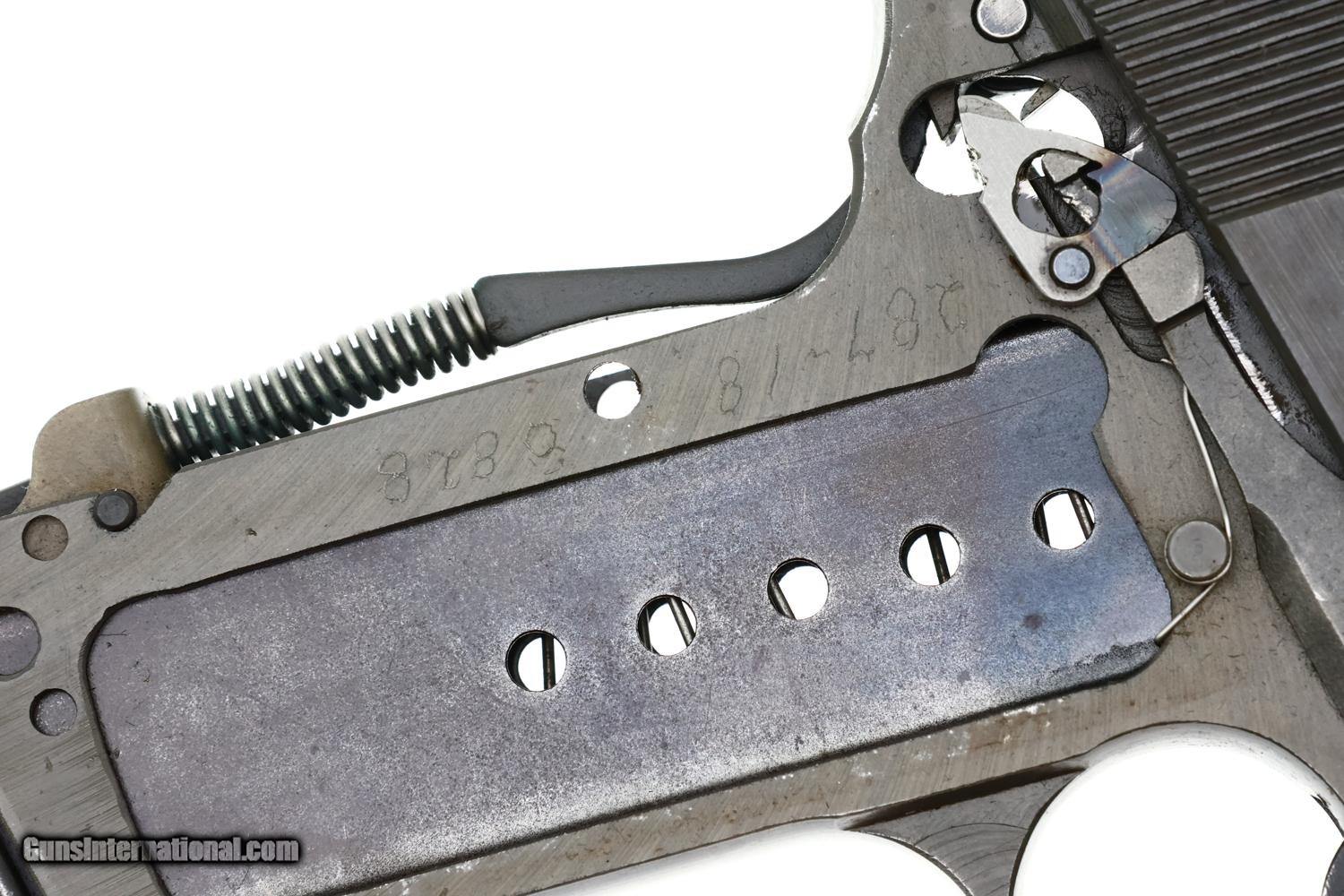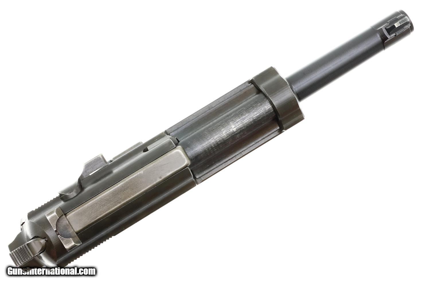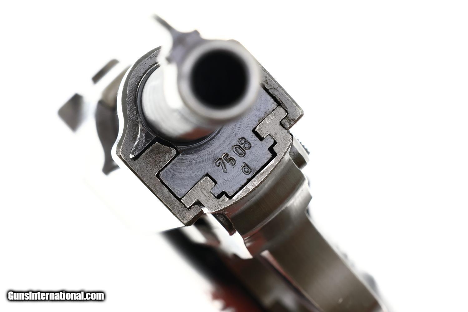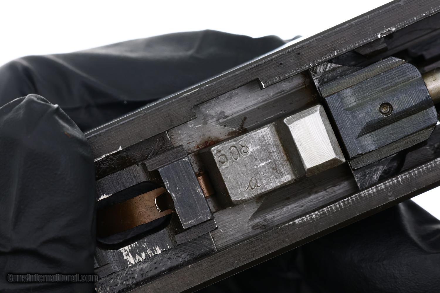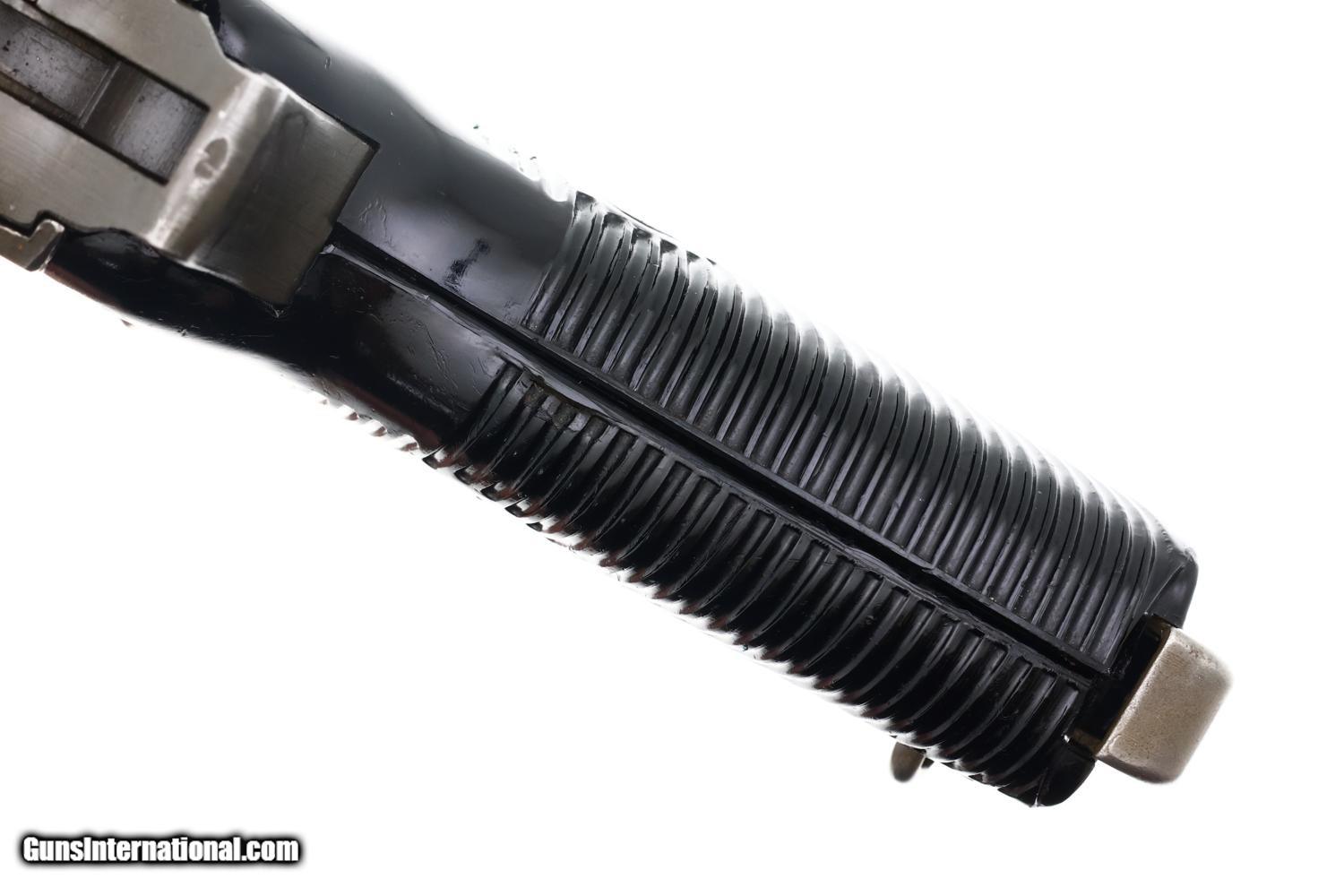 Description: Synopsis: High Original Condition Mauser P38 Dual-Tone Pistol, Made in late 1944, All Matching with Mirror Bore and a Spare Magazine. Description: Standard configuration Mauser P38 made in 1944/January 1945 with Dual-Tone finish: major and most minor components phosphated, the barrel and trigger are blued. The left side of the slide is marked with the model, byf/44 code, and full SN that is repeated under the barrel, on the left side of the frame, and the last three digits on the locking block. Right side of slide with usual inspection/test proofs. Lightly marked SSN on right frame under grip. Standard black plastic grips and a Walther WaA359 accepted magazine. Spare magazine is blued, marked "P38" on the left side, and "jvd" with WaA706 acceptance on spine. Condition: Near EXC original phosphate/blued finish with very light holster wear in expected locations. Comparable condition slide cover and frontstrap. Grips with scratches and bruises along leading edge as imaged. Walther magazine with considerable fading; "jvd" magazine is EXC. Mirror bore with sharp rifling. Perfect manual mechanics with both magazines. A high condition example of a Mauser Dual-Tone P38 assembled in late 1944/January 1945 with a spare magazine! Curio/Relic: Yes Manufacturer: Mauser Model: P38 Dual Tone Pistol Serial Number: 7508d Caliber Info: 9mm Condition: EXC Price: $3,295.00 Contact Seller |