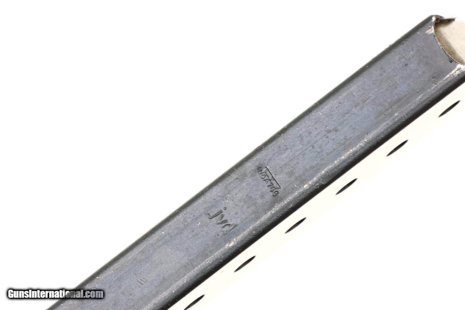 Near EXC original phosphate/blued finish with very light holster wear in expected locations. Comparable condition slide cover and frontstrap. Grips with scratches and bruises along leading edge as imaged. Walther magazine with considerable fading; "jvd" magazine is EXC. Mirror bore with sharp rifling. Perfect manual mechanics with both magazines. A high condition example of a Mauser Dual-Tone P38 assembled in late 1944/January 1945 with a spare magazine!