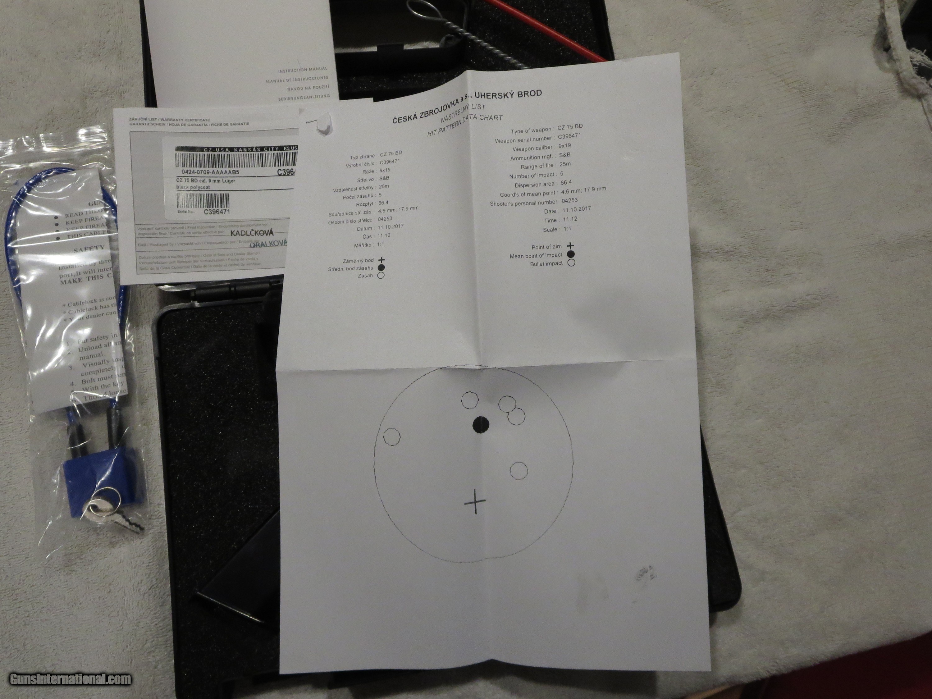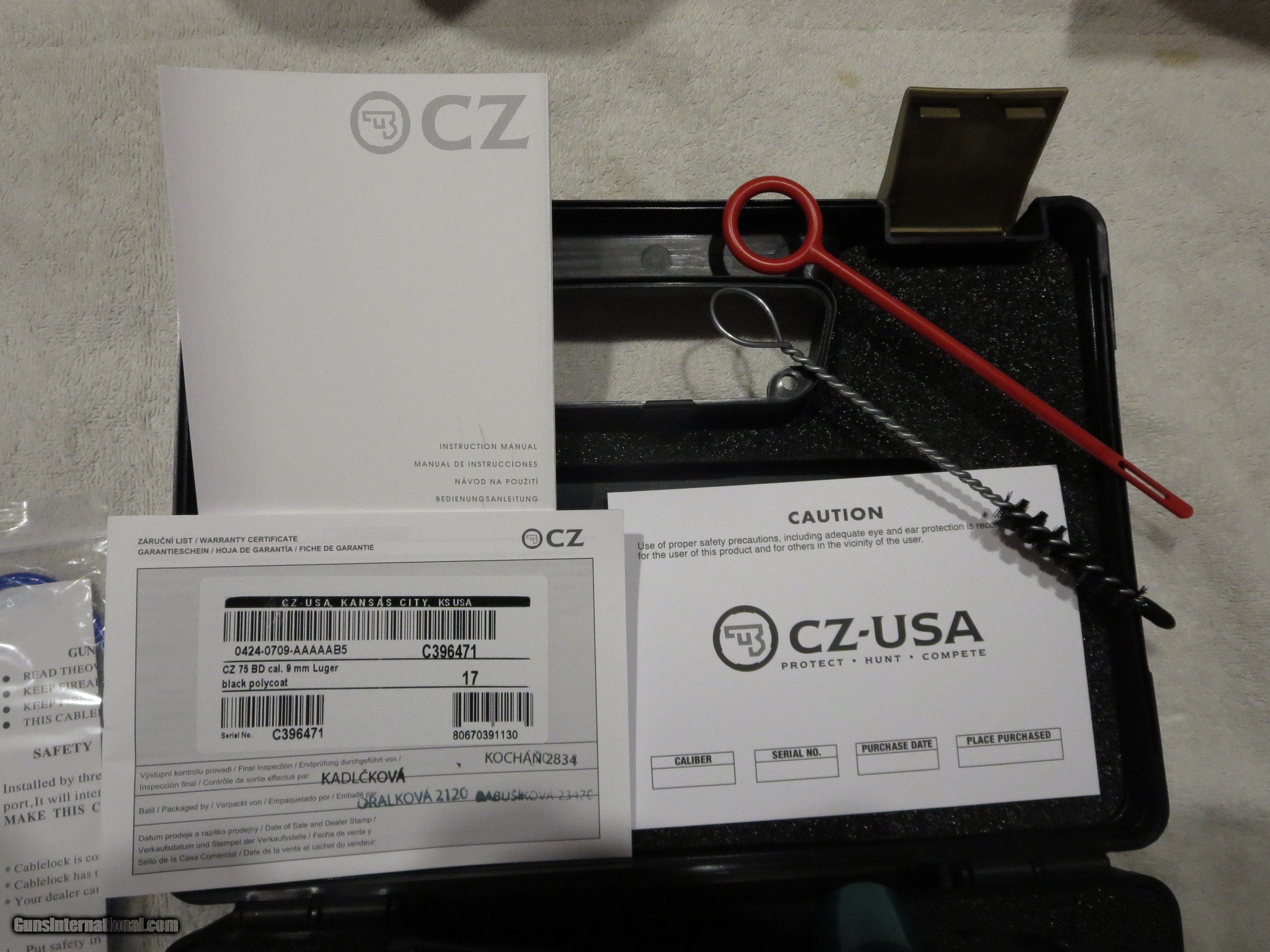 Description: For Sale: BRAND NEW - CZ-USA 75BD 9mm Black Polycoat 16 Round Pistol Comes in factory hard case with 2 -16 round mags, cleaning tools and manual. This model is a decocker version of the basic CZ 75 B model. The decocking lever mounted on the left side allows the hammer to be easily lowered on a loaded chamber for a safe, 'hammer down' carry. CZ 75 B is used by more Governments, Militaries, Police and Security agencies than any other pistol in the world. The CZ 75 is quite possibly the perfect pistol. All steel construction High capacity double column magazines Hammer forged barrels Ergonomic grip and controls. Unparallel accuracy Slide-in-frame design for better recoil control 3 dot sighting system Smooth double action and crisp single action Extended service life due to advanced design and superior materials Firing pin block safety. Simple and honest layaway plans are available. SOLD Manufacturer: CZ Model: 75BD Serial Number: C396471 Caliber Info: 9mm Bore Condition: NIB Manufacture Date: 2017 Item Location: Pennsylvania |