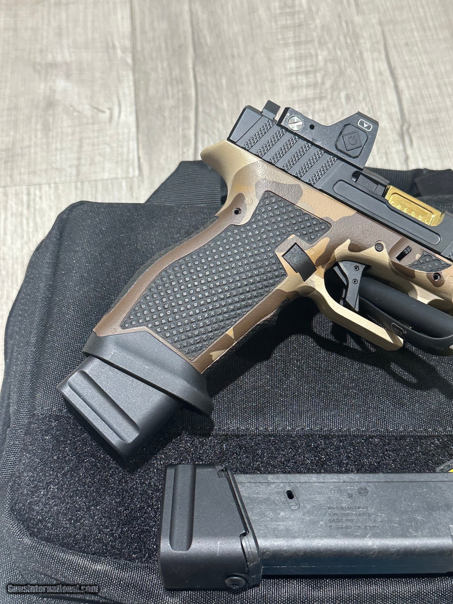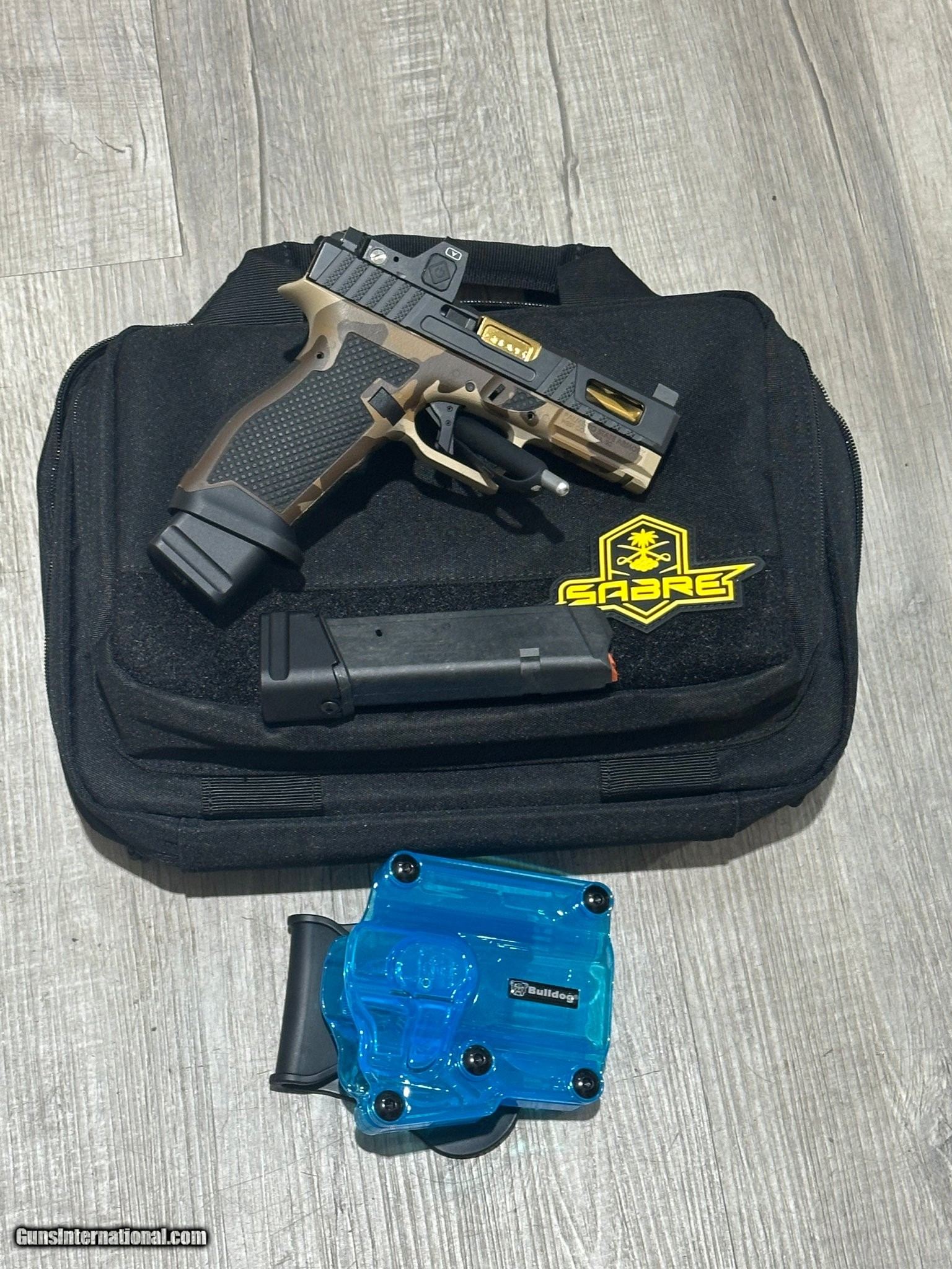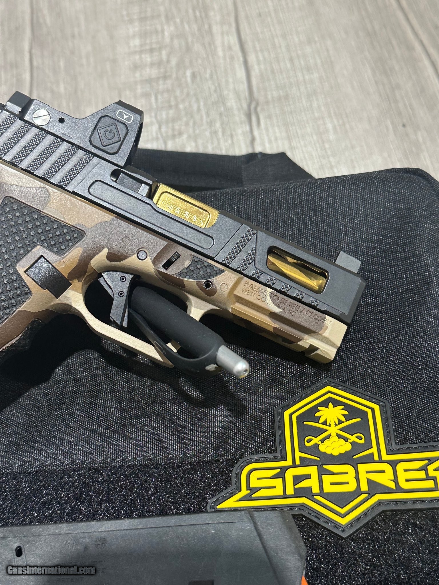 Description: Guns Listing ID: 616378 You are looking at a pre owned but never fired PSA Sabre dagger chambered in 9mm. This pistol come with (2) 22 round magazines, a CV life green dot optic, a blue translucent RH OWB holster, and the original Sabre dagger carrying case. The finish is what PSA calls M81 desert camo. The barrel is gold TiN finish and spiral fluted. Manufacturer description below Model: Palmetto Sabre Dagger Full Size - S Caliber: 9mm Action: Striker Fired Overall Length: 7.15\" Overall Width: 1.28\" Overall Height: 5.38\" (Without Mag or optic) Barrel Length: 3.9\" Barrel Material: Stainless Steel, Spiral Fluted Barrel Finish: Gold TiN Twist Rate: SAAMI Spec 1:10 Slide Material: Stainless Steel Slide Finish: Cerakote, Black Optics Mount: RMR, Cover Plate Included Frame: Polymer, Cerakoted M81 Desert Camo, Laser Stippled Magwell: Sabre Full Size – S Trigger: Aluminum Flat Face Ejector: Gen 4 style for improved ejection Front Sight: Co Witness Sight (Not A Night Sight) Rear Sight: Co Witness Sight (Not A Night Sight) Safety: Striker Block Safety & Trigger Safety Magazine: Comes with 2 17rd Magazines with installed +5 extensions (Black) Sabre Pistol Case Included FEATURES Introducing the Palmetto State Armory Sabre Dagger Full Size - S. Offering the ergonomics of a full-size frame while utilizing a compact slide, this powerhouse in 9mm is designed and built with many of the custom additions enthusiasts prefer. The professionally laser-stippled and cerakoted polymer frame includes an installed magwell that ensures comfortable handling and grip while standing out from the crowd. The custom Sabre Dagger stainless steel slide with matching Sabre back plate and barrel, guarantees smooth cycling and performance with its aggressive serrations providing optimal grip when racking the slide. All Sabre Dagger pistols are built with our new aluminum flat face trigger shoe for improved ergonomics and style and include a Gen-4 style ejector, providing improved performance and ejection. This Sabre Dagger Full Size - S pistol comes with a M81 Desert Camo laser-stippled frame, Black cerakoted Sabre Dagger slide, spiral fluted Gold TiN barrel and matching back plate with Sabre logo. This pistol ships with 2 Magpul 17 round with installed +5 Black Sabre extensions and a custom Sabre pistol case. Magazine extensions come with longer spring required for use (installed on mags with +5 extensions). Manufacturer: PALMETTO STATE ARMORY Model: sabre dagger Caliber Info: 9MM LUGER (9x19 PARA) Condition: Used - Non-Certified Barrels: 3.9" BARREL Action: SEMI AUTOMATIC Finish: DESERT CAMO Price: $739.99 Contact Seller |