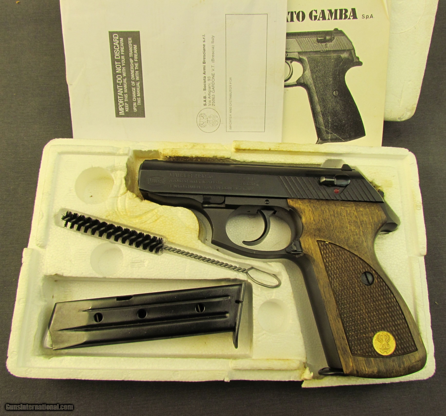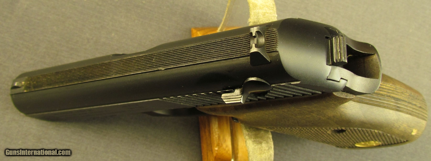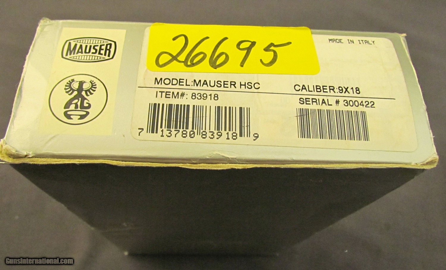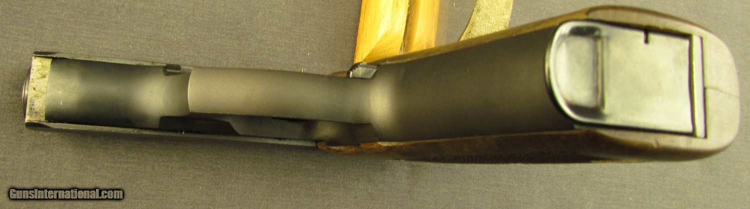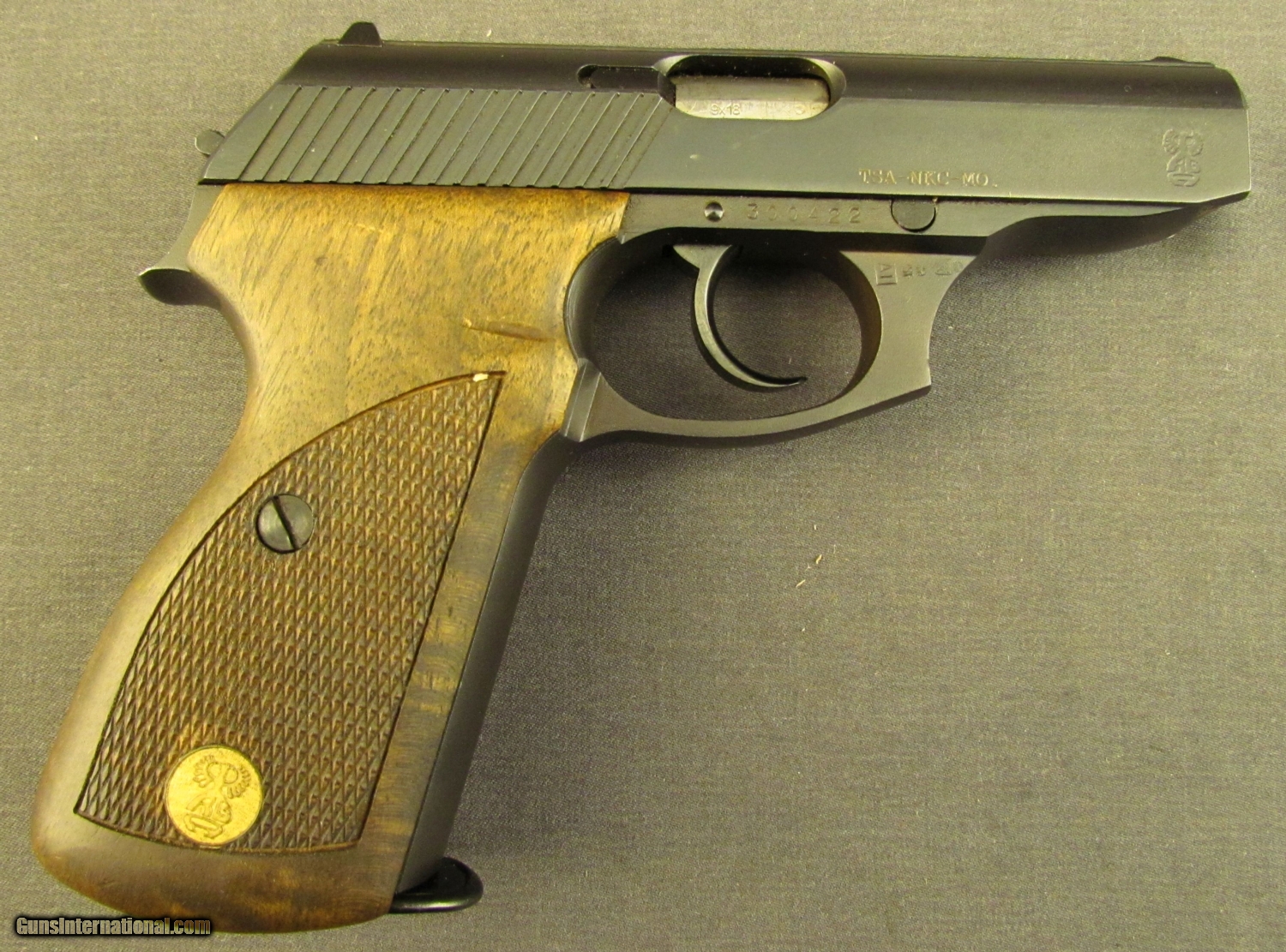 Description: Serial #300422, 9mm Ultra, 3 1/2” barrel with an excellent, bright bore. This is one of the license-built pistols made by Gamba for Mauser in the 1980s and is chambered in the potent 9 x 19mm Ultra cartridge (similar in size and power to the 9mm Makarov). This example retains 97-98% of the original blue finish with some thin freckling present along the top of the slide and some trace silvering along the high edges. The checkered walnut grips with Gamba medallions are in almost new condition with very little in the way of wear or flattening of the points. The pistol is housed in its original styrofoam clamshell box with gray shipping sleeve along with two original magazines and instruction manuals. This is an unusual, Italian-built Mauser and is in excellent overall condition. FFL SOLD Manufacturer: Mauser Model: HSc Serial Number: 300422 Caliber Info: 9mm Gauge Info: 9mm |