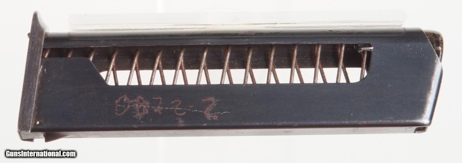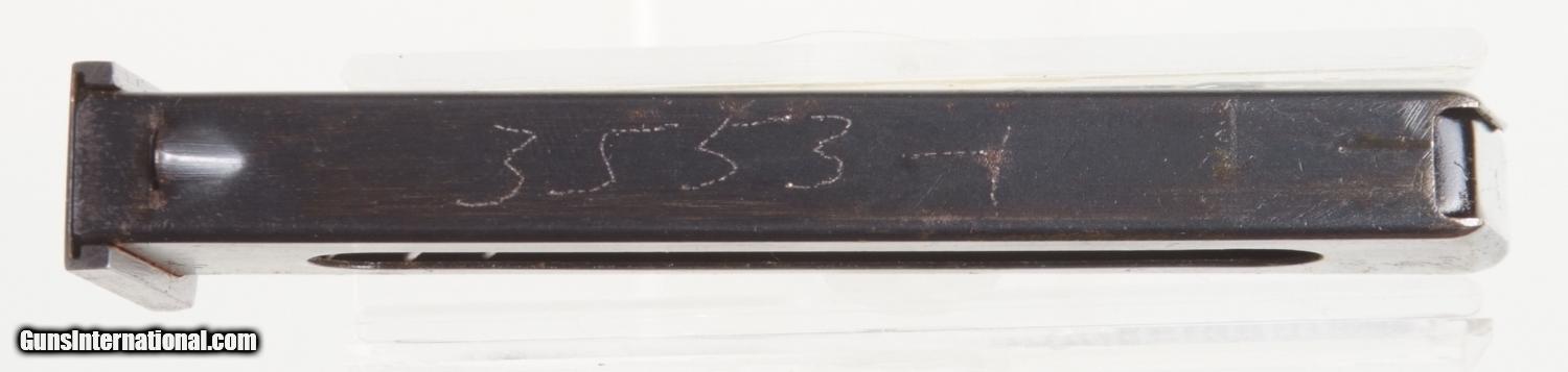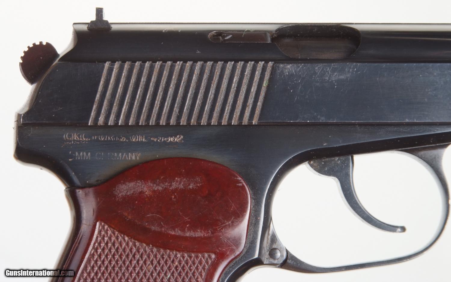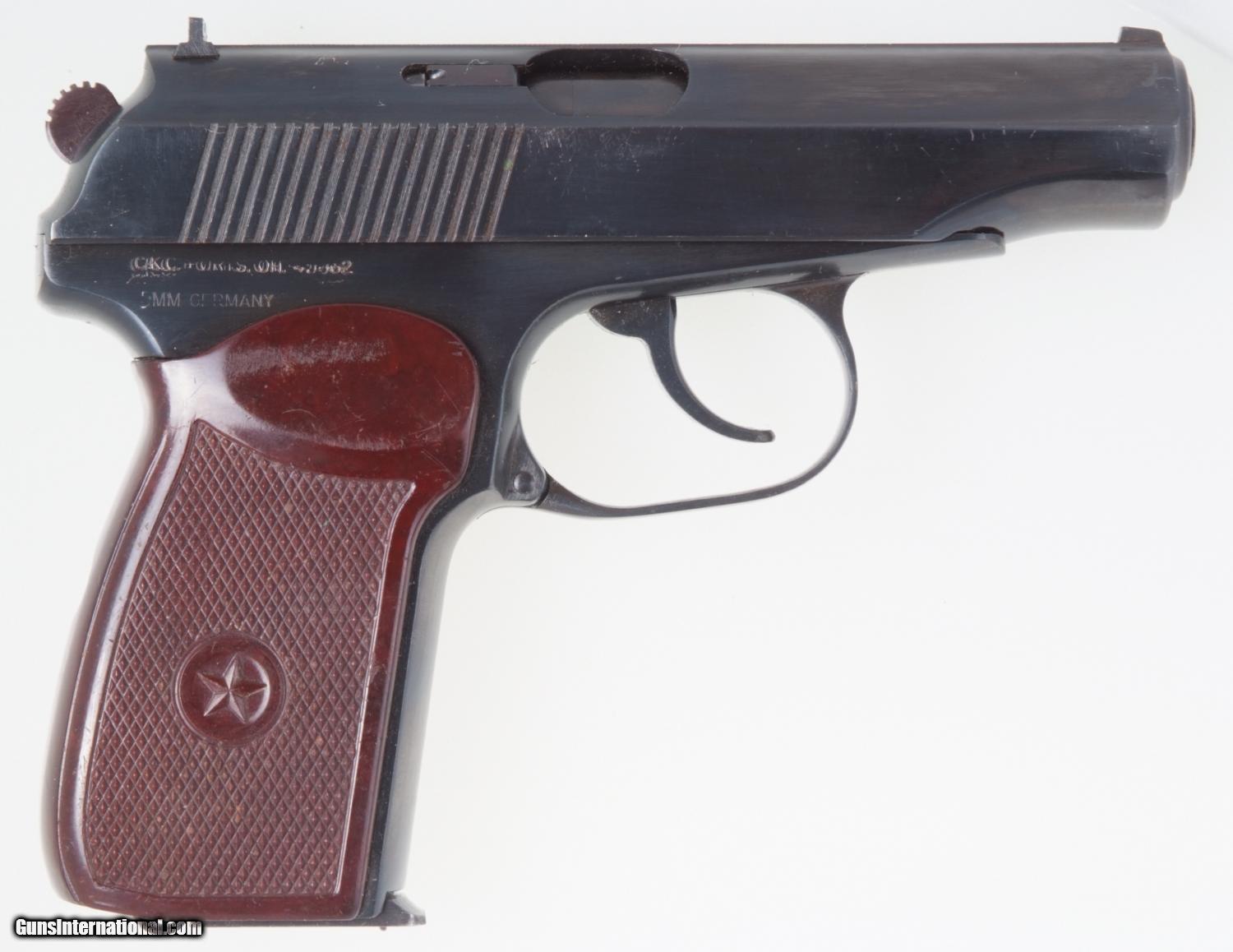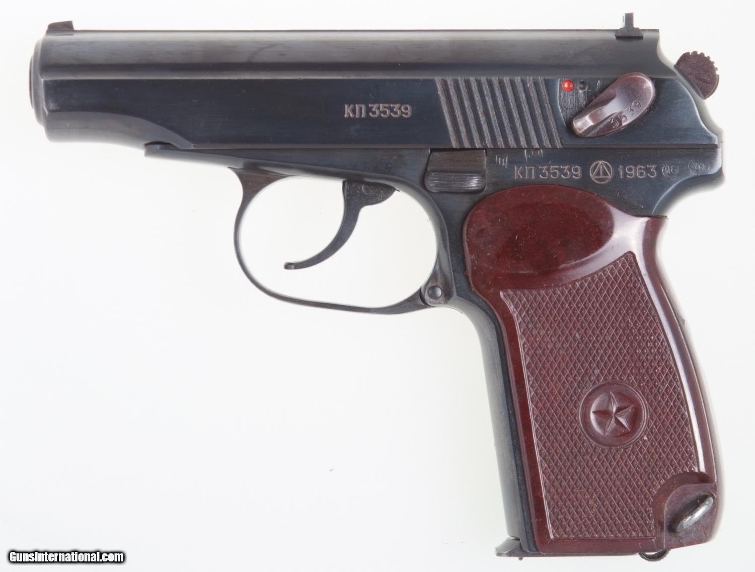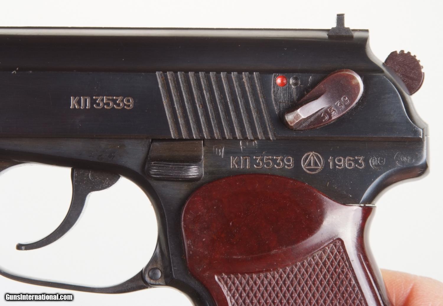 Description: Excellent Russian Military Makarov arsenal reworked, dated 1963, with correct magazine. SN: KN 3539. Cal. 9mm Mak. Standard configuration Makarov with fixed front and drift adjustable rear sight. Full serial number on left side of slide that is repeated on the safety and left frame adjacent to the Tula Arsenal symbol and the year 1963. Import marking on right frame. Usual reddish brown phenolic grips impressed with encircled 5 pointed star on each side. Lanyard ring. Correct magazine with electropenciled “0872-2” crossed out, replaced with “3553-1” on spine. Condition: Approximately 99% salt blue. Comparable or better condition grips. Mirror bore. Perfect manual mechanics. A really nice and early Makarov, hard to find with an early date. A HISTORIC INVESTMENT! SOLD Curio/Relic: Yes |