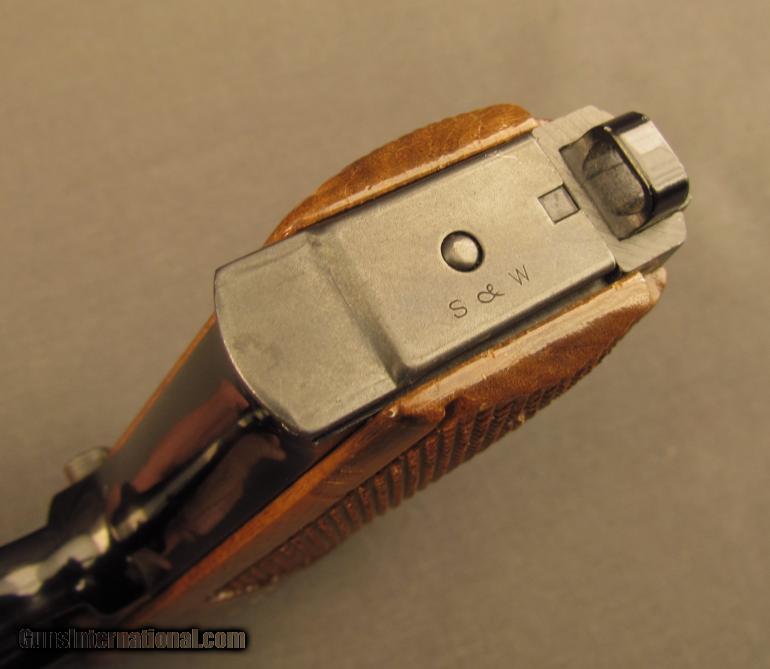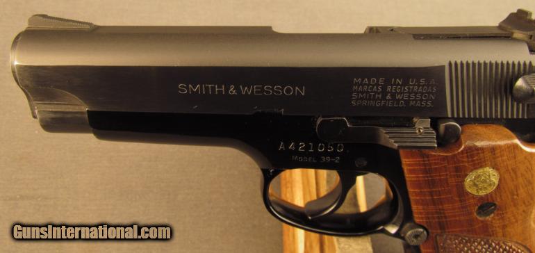 Description: Serial# A421050, 9mm, 4 inch barrel, bright excellent bore. This pistol was made from 1971 to 1982 and it remains in excellent condition showing a few tiny dings with over 95% finish. Grips show light wear with several small dings on the right side and a few flattened diamonds. Comes with two correct 8 round magazines and instruction sheet in a correct, unlabeled, two-piece Bangor Punta box. FFL SOLD Manufacturer: S&W Model: 39 Serial Number: A421050 Caliber Info: 9mm Gauge Info: 9mm |