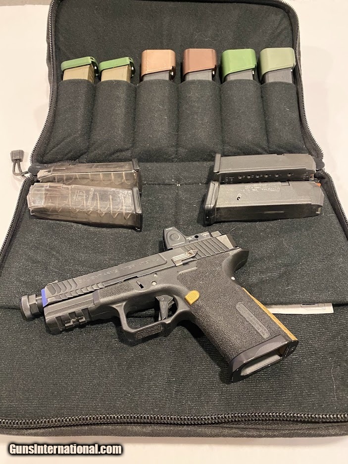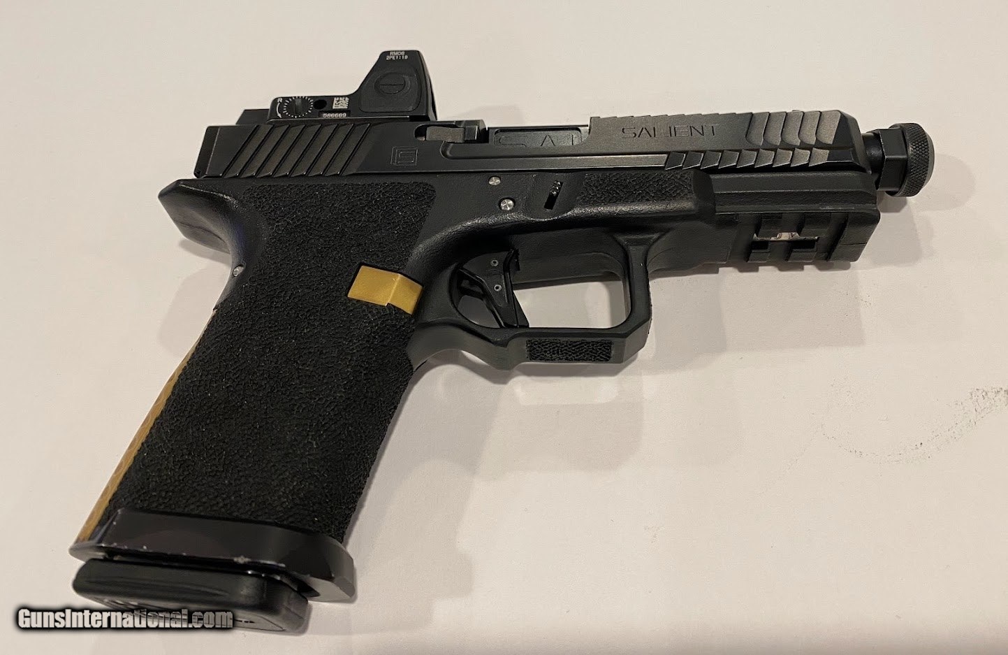 Description: Guns Listing ID: 472312 \"This pistol is made completely in house and features a proprietary integrated brass back strap and magwell. The BLU fills a void for those shooters who adore the ergonomics of the M&P and the reliability of the Glock. These desires presented the perfect opportunity in the market which we feel we have taken advantage of giving birth to the BLU. The BLU is only available in two configurations full size and compact, both accepting Glock magazines. The standard features a full size slide and frame accepting Glock 17 magazines. The Compact version features a compact slide and frame - leveraging Glock 19 magazines. Features: • BLU slide cuts for enhanced grip and weight reduction • Tier 1 internals with SAI flat face trigger shoe • SAI Black nitride, box fluted, match grade barrel (threaded or non-threaded) • SAI solid brass backstrap for counterweight • SAI solid brass magazine release • SAI fiber optic sights • Frame stippled with double trigger guard undercut • Stainless steel guide rod with ISMI recoil spring\" Jagerwerks rmr cut slide with Trijicon RMR 3.25mo dot. Lower 1/3 witness back up sights. Kagwerks extend slide lock. 4 Taran Tactical 20 rd mags, 2 Taran tactical 15rd mags, and 4 other mags included. SOLD Manufacturer: SALIENT ARMS INTERNATIONAL Model: BLU-C Caliber Info: 9MM LUGER (9X19 PARA) Condition: Used - Non-Certified Barrels: 4.5 BARREL Finish: BLACK AND GOLD |