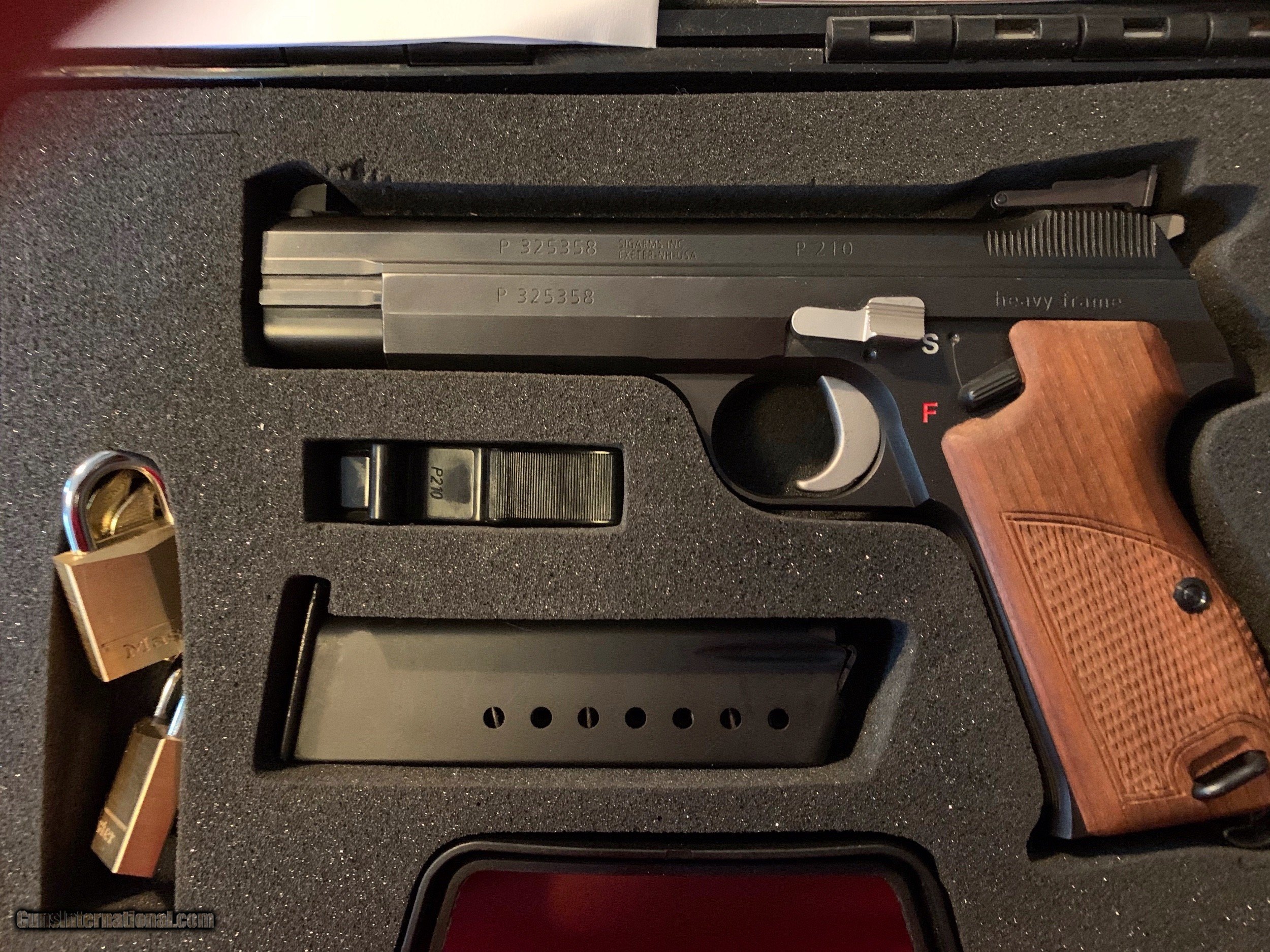 Description: Rare Sig Arms P210 9MM "Heavy Frame" semi auto. Very lightly used with original box, papers and test target. This is a beautiful gun that will reward the competent shooter. SOLD Manufacturer: Sig Arms Model: P210 Heavy Frame Serial Number: 325358 |