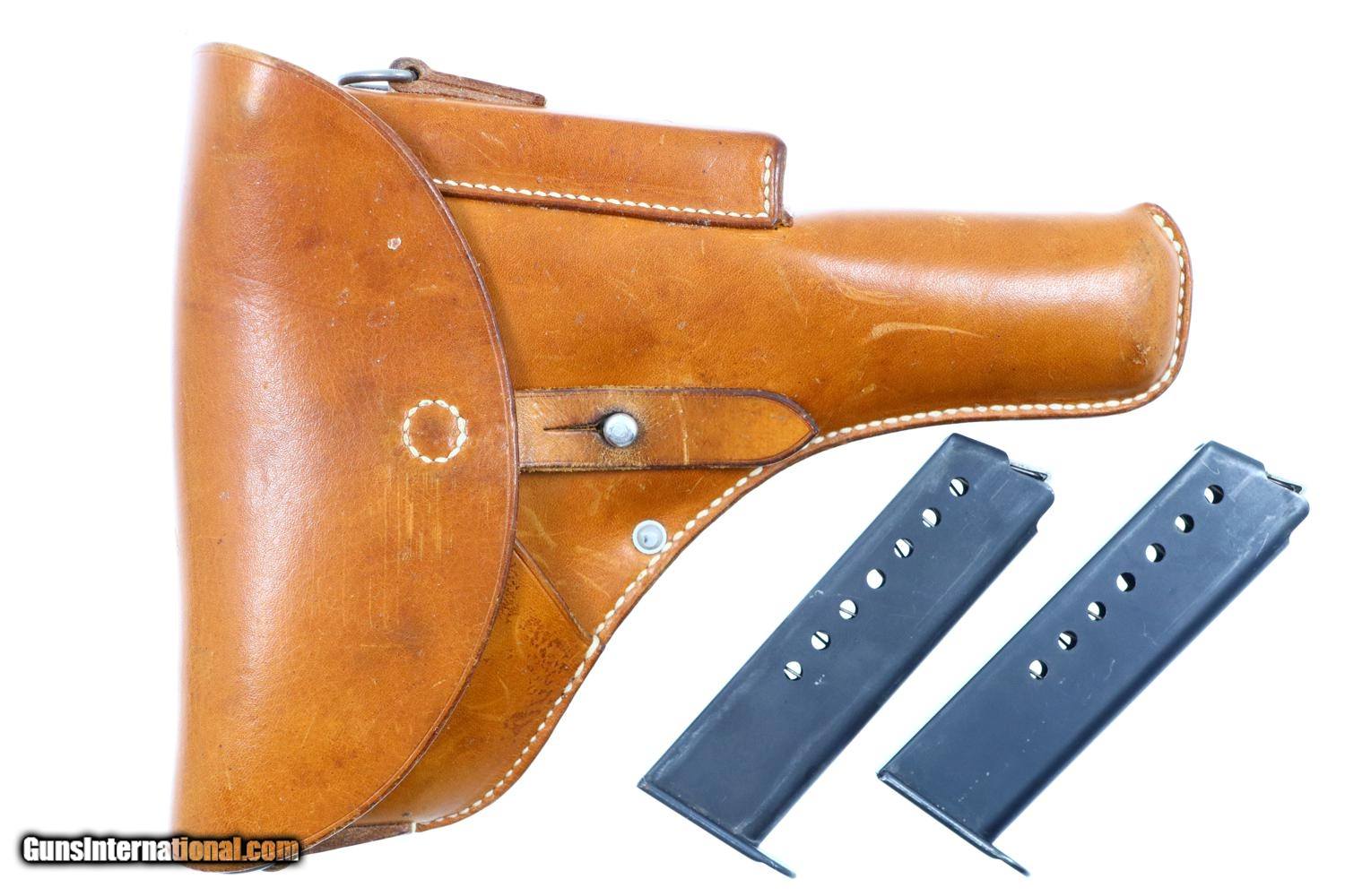 EXC original finish with minimal sharp edge wear as photographed. Comparable condition grips and correct matte finish magazines. Mirror bore with strong rifling and perfect manual mechanics. Holster near excellent, stitching showing no repair. One of the scarcest P49 variations, rarely coming up for sale, as very few were used as shooting prize presentation pistols!