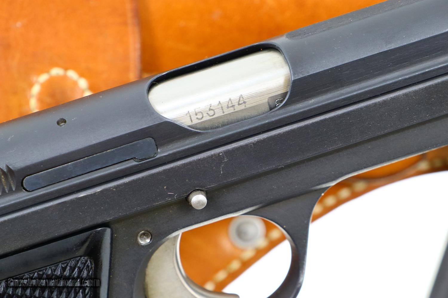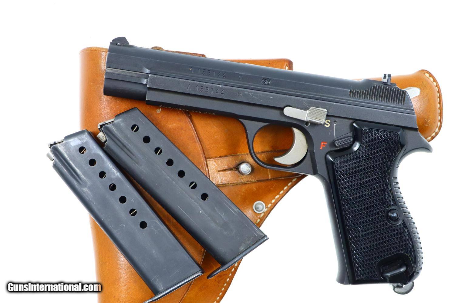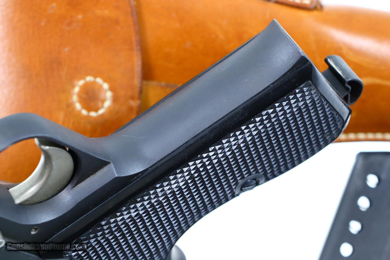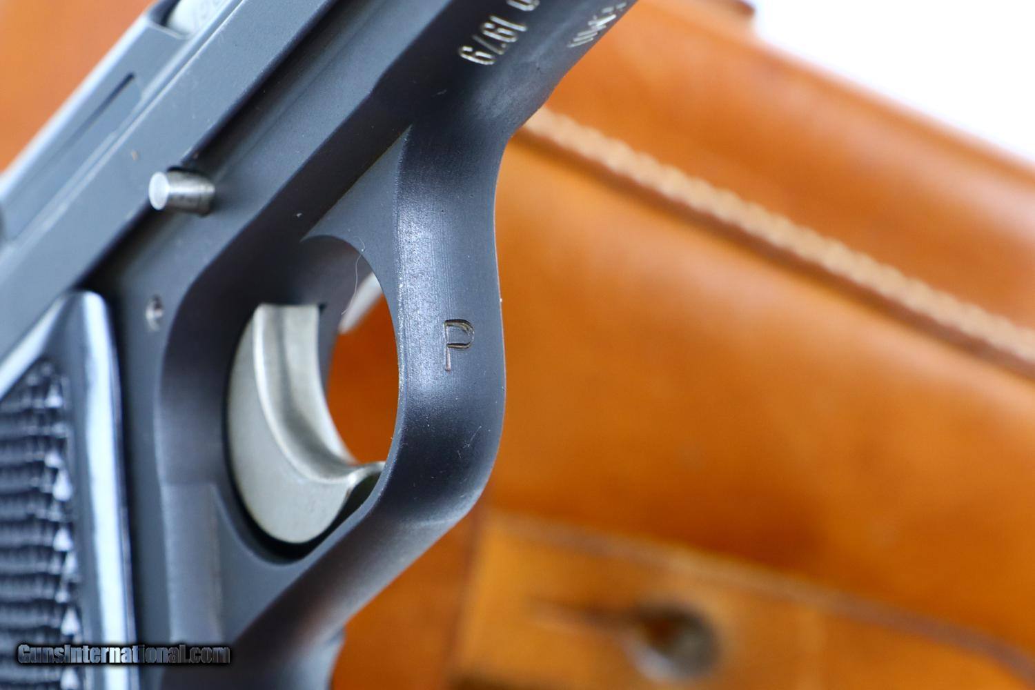 Standard configuration single action pistol with 4.75" barrel and drift adjustable front and rear sight. The left side of the slide and frame are proofed and marked with the full serial number that is repeated on the right side of the barrel hood. Safety detentes are marked with an "S" in white and "F" in red. This particular pistol was use by the Swiss Military as a shooting prize in a pistol shooting competition in Morgarten Switzerland in 1979. "P" release marked on front of trigger guard and discreetly applied import marking on base of frame where covered by the magazine floorplate. Disassembly shows a matching hammer group with the usual half cock. Fitted with checkered black plastic grips, integral escutcheons, secured with a single transverse screw. Fixed lanyard ring. Complete with two correct matte finish magazines. Original holster with battle-ready stud, manufacturer marked and dated "71” on obverse surface.