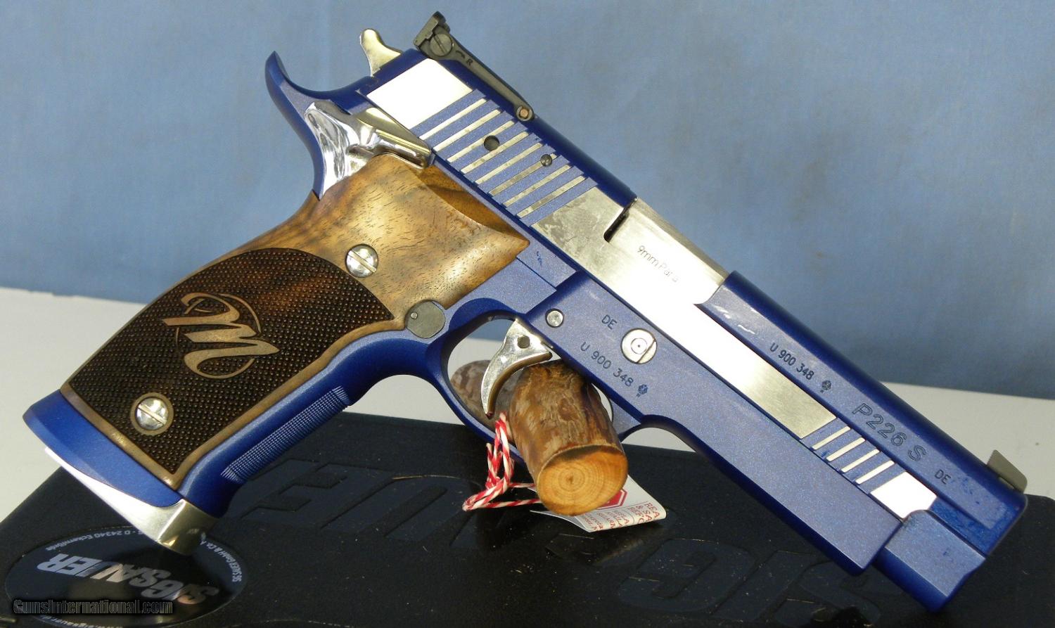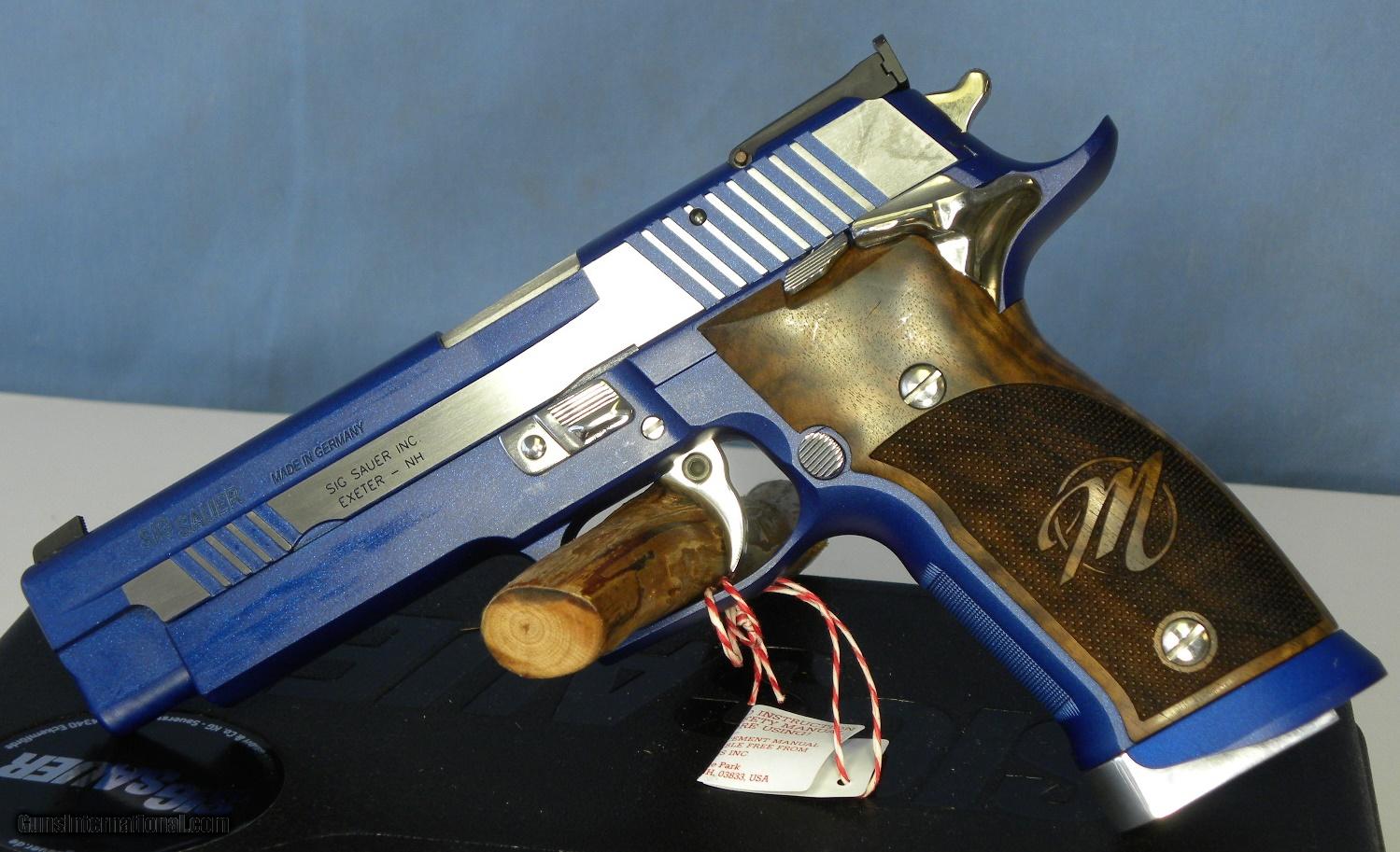 Description: This is a new Sig P226X5-9-BLUE MOON Competition Target pistol in 9mm. This pistol was made in Sigs German Master shop and has 5in match barrel,ambidextrous safety, SAO trigger system ,stainless steel slide & frame in Blue and stainless finish,adjustable target sights, high grade wood grips, polished adjustable trigger, manual safety take down lever ,slide stop with magwell. The pistol comes with two 19rd mags,hard case,factory warranty, trigger lock & manual. . Mastercard/Visa welcome . S&H is $45.00 and includes insurance. SOLD |